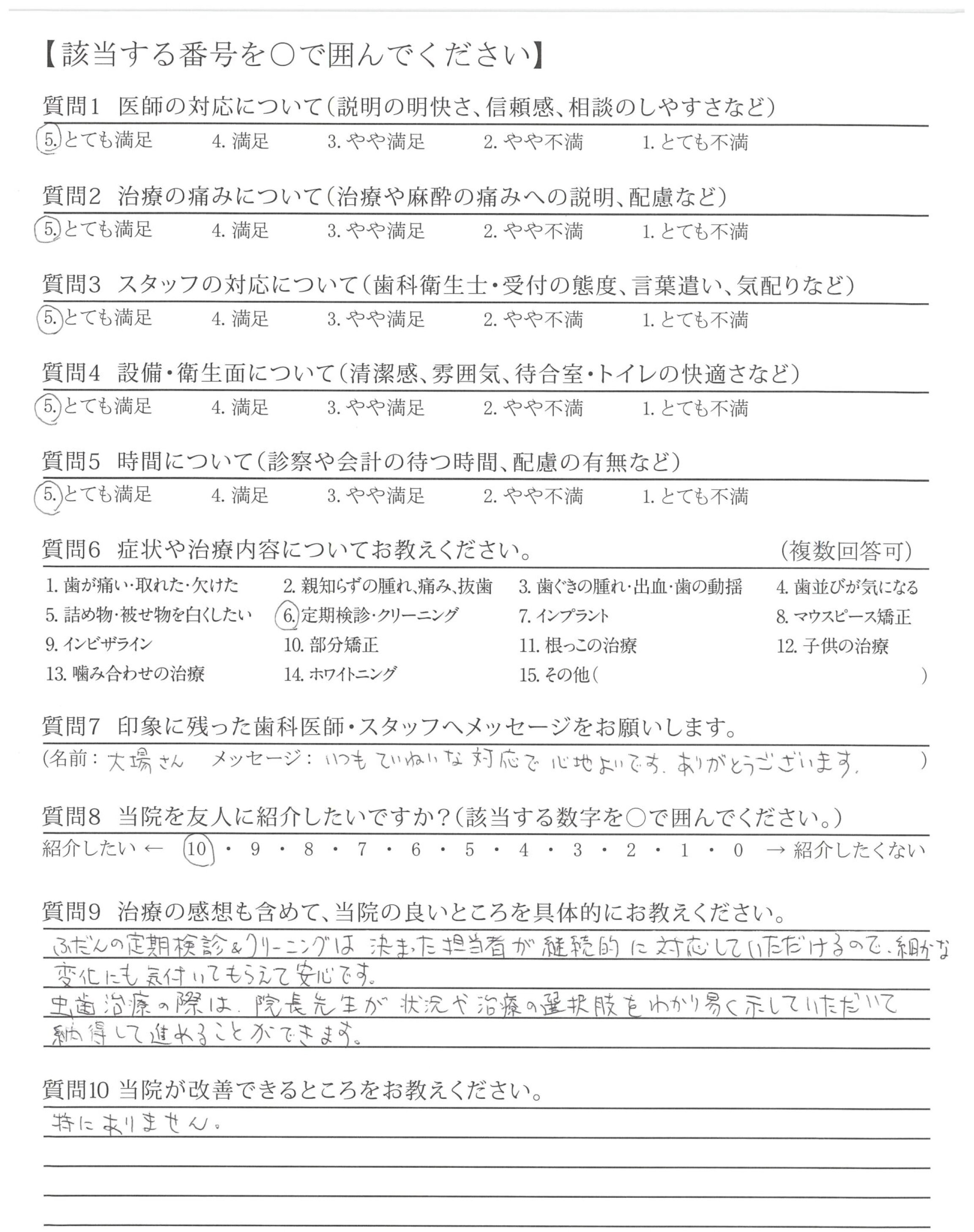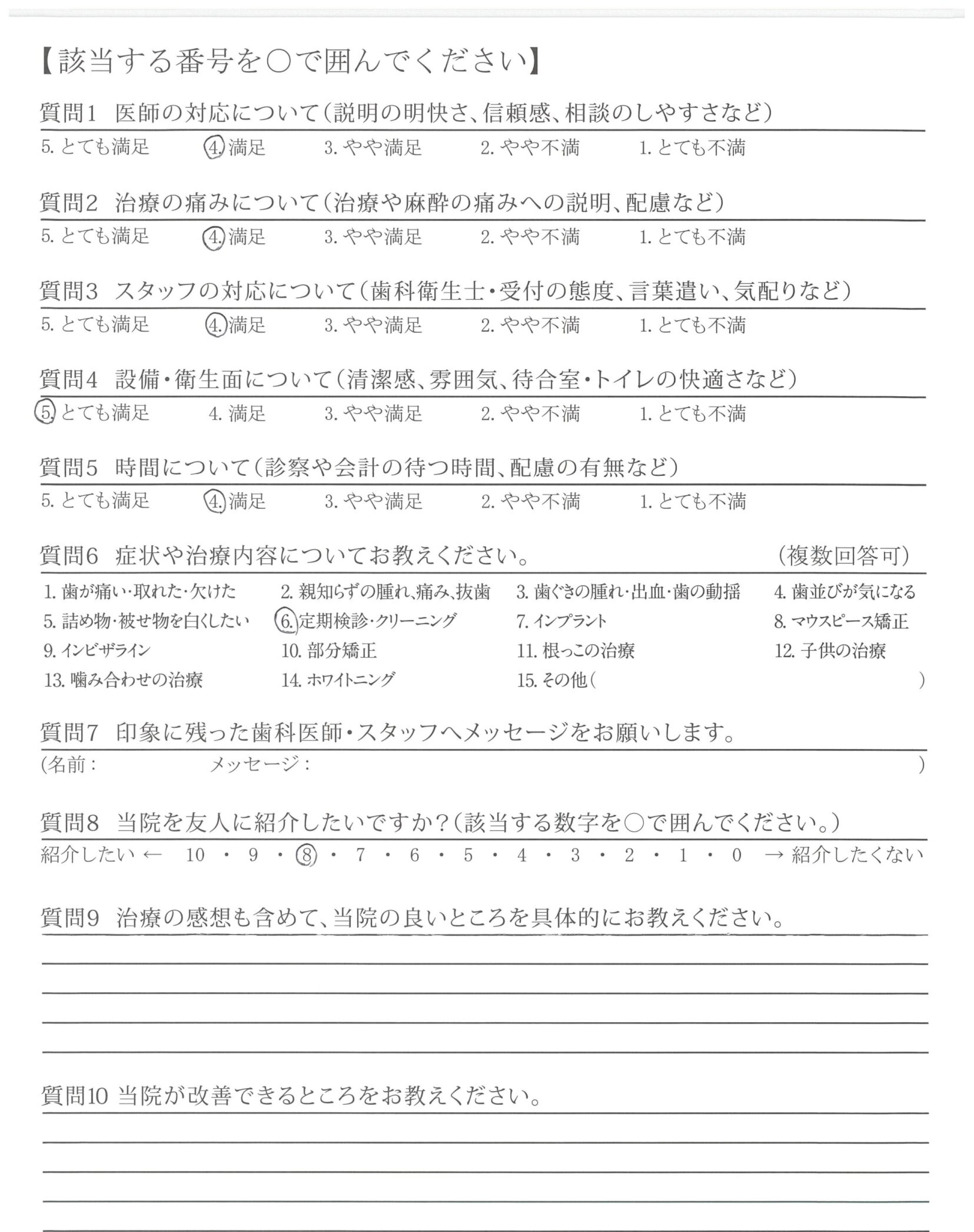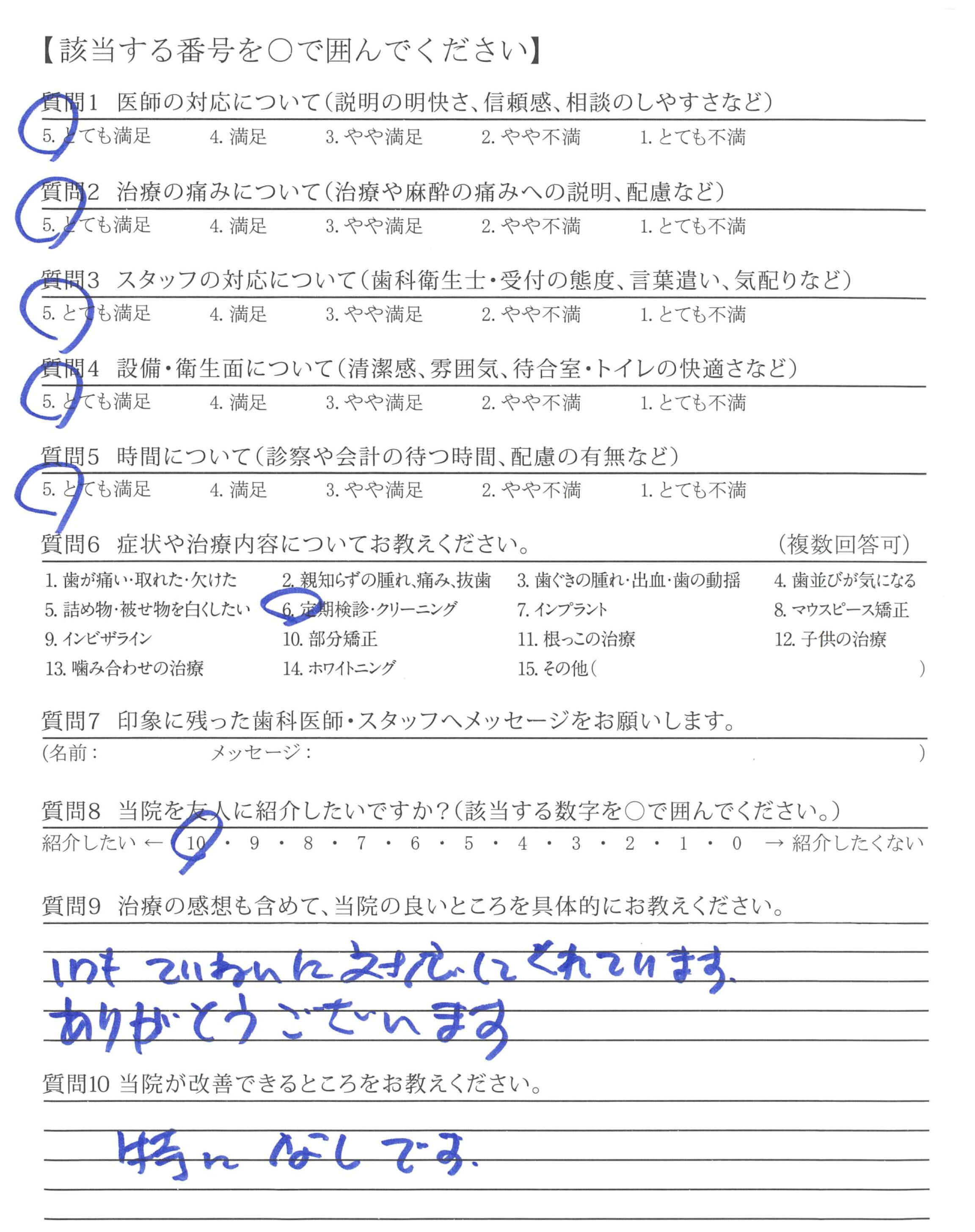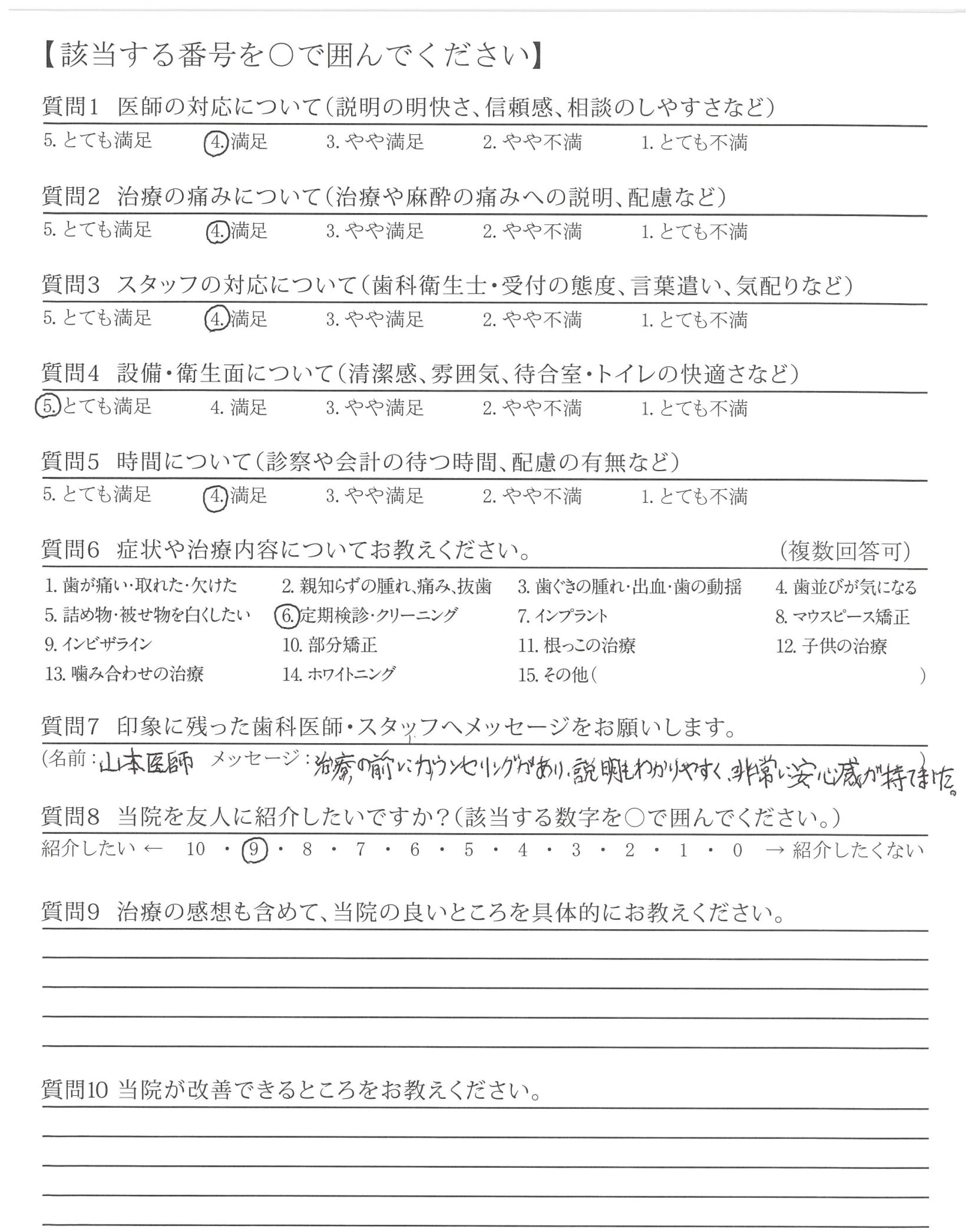いつも、ご担当頂く接遇が素晴らしい歯科衛生士さんへ、前回、自費治療(エアフロー)を受けた時、患者さんの立場になって考えた、歯科衛生士さんの細かな気配り・心配りは素晴らしく印象的でした。これからもよろしくお願い致します。
