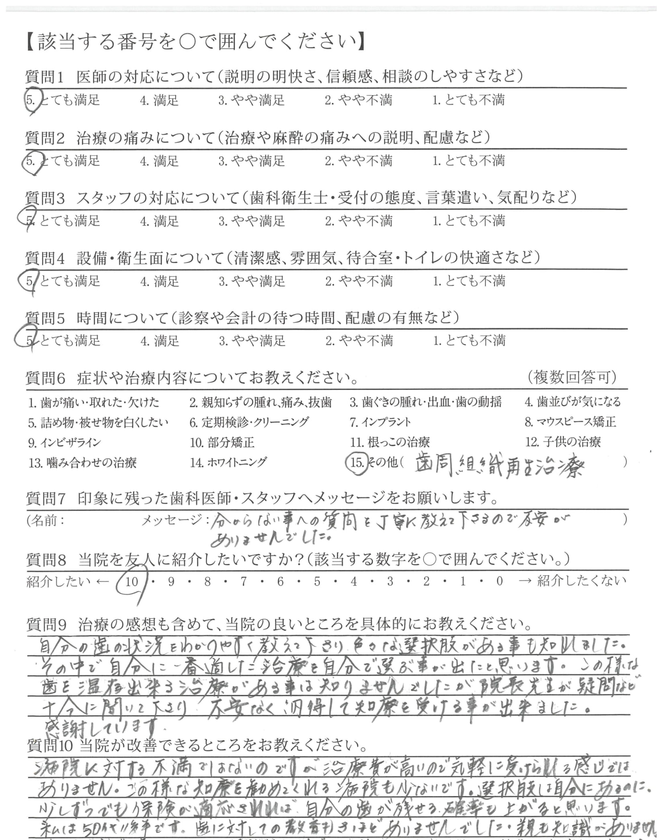 他院からの紹介でしたが、納得がいくまでカウンセリングして頂き、何の不安もなく骨造成術に踏みきる事が出来ました。術後の治り具合等、親切に診て頂き充分満足でした。術中は少し厳しい先生のようでしたが、テキパキとフォローして下さっていました。
