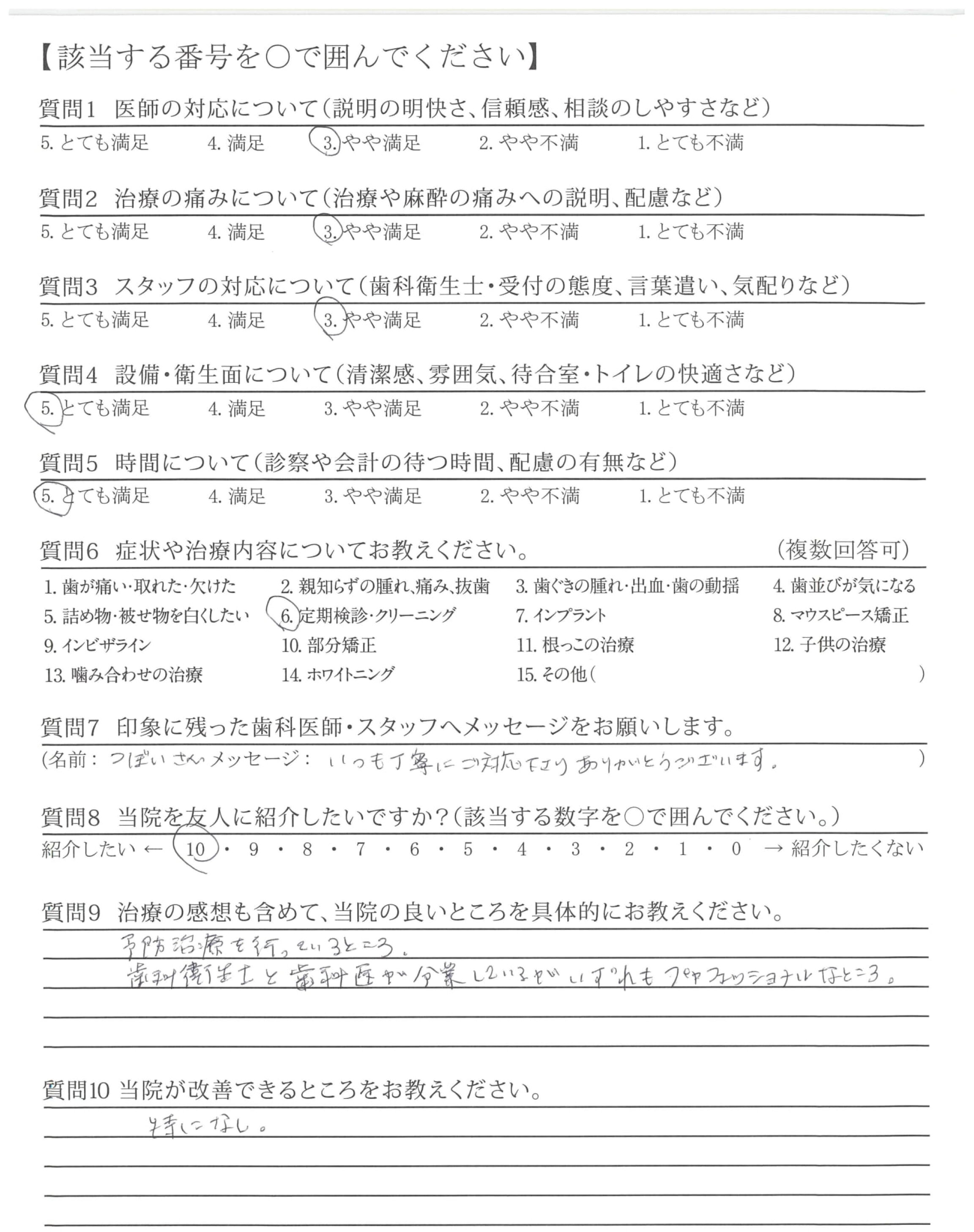 壷井さんに教えて頂いたことを、クリーニングの度に少しずつ重ねていったところ、歯・口腔の状態が良くなりました。ありがとうございます。