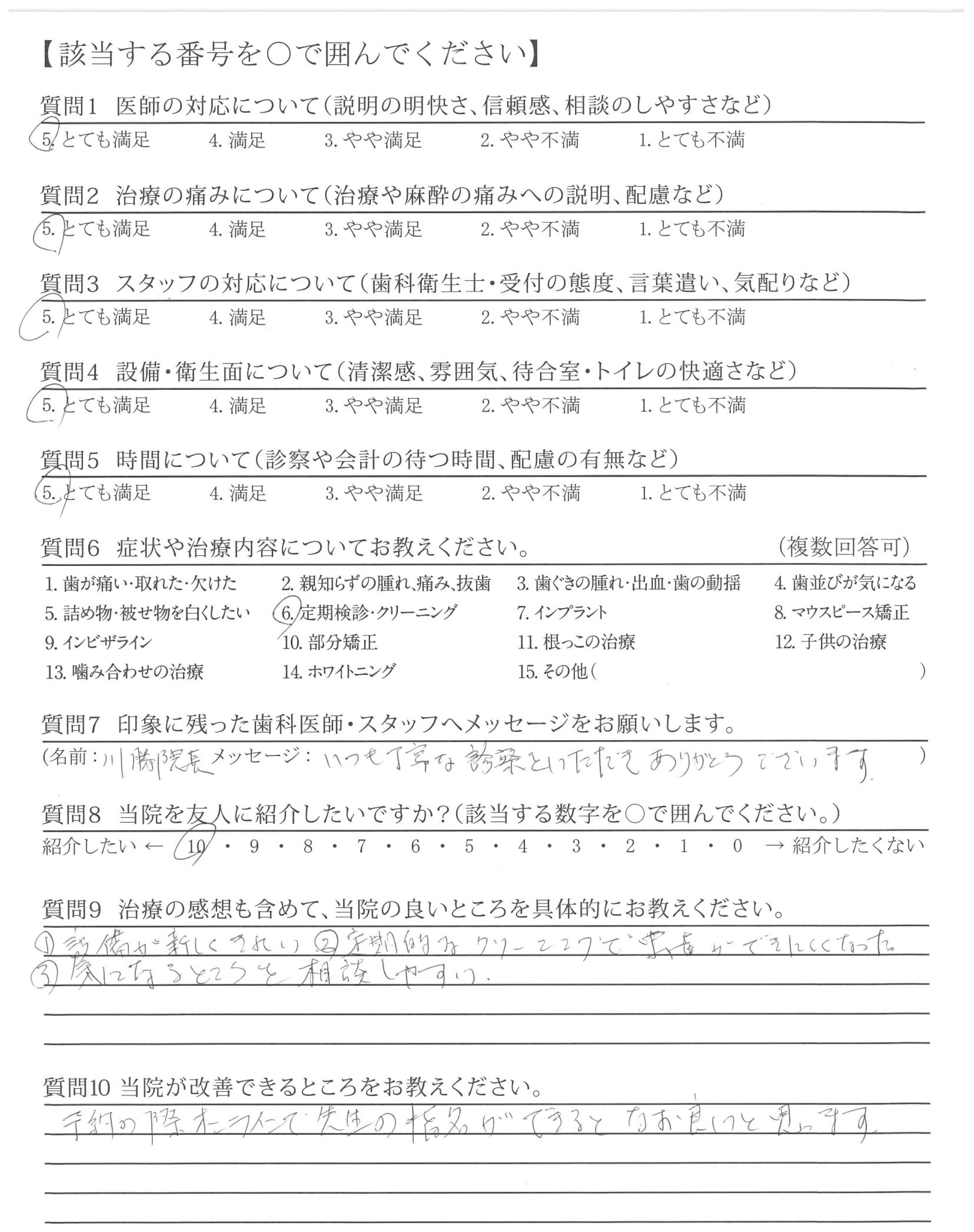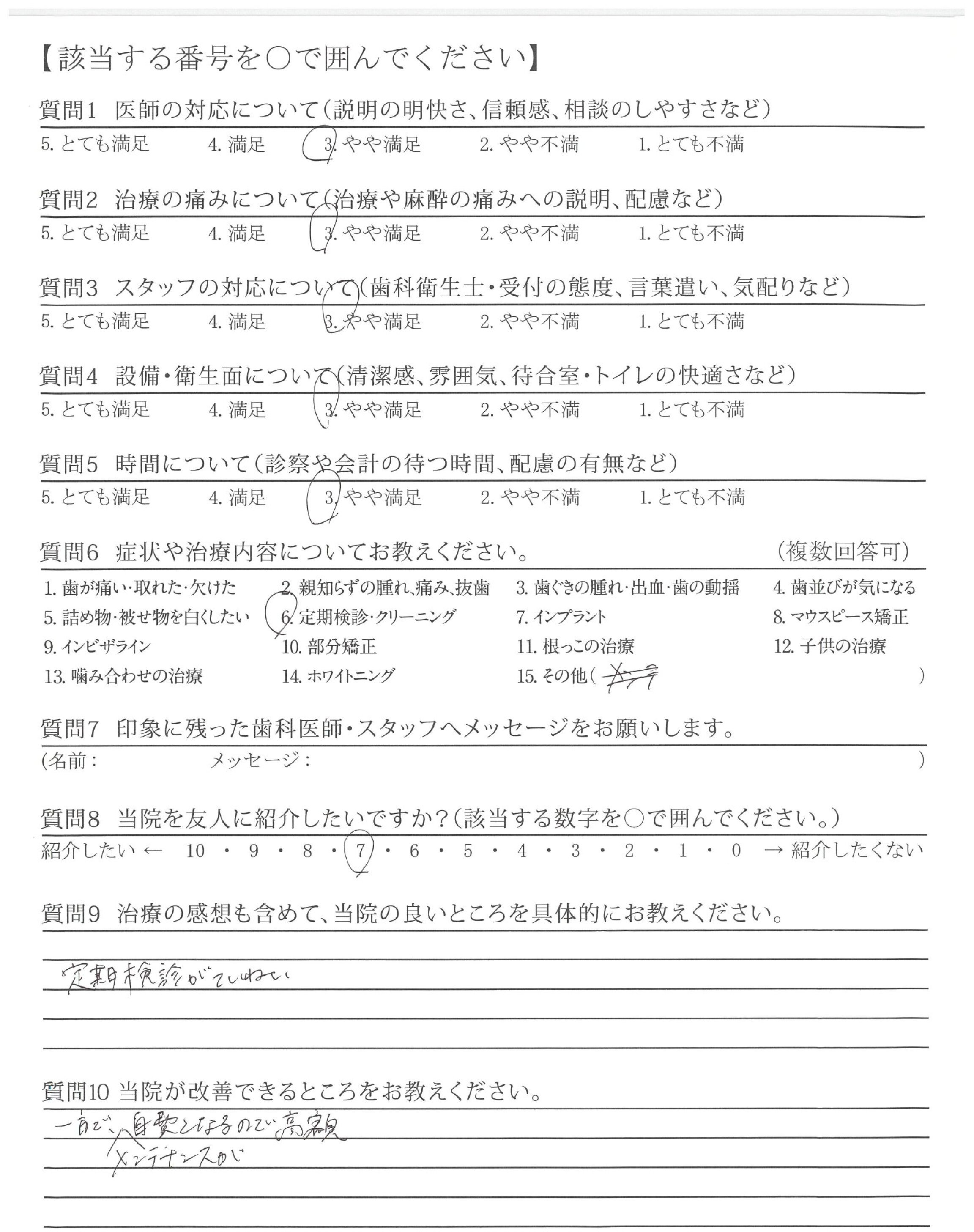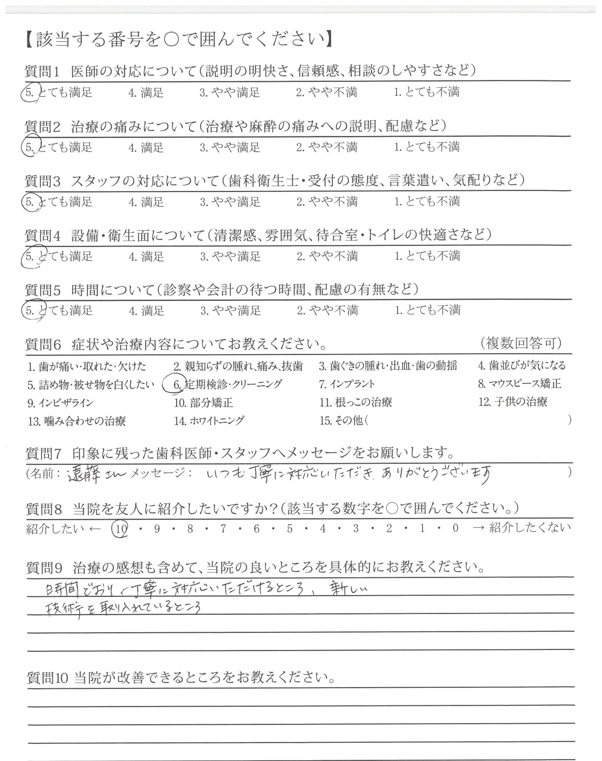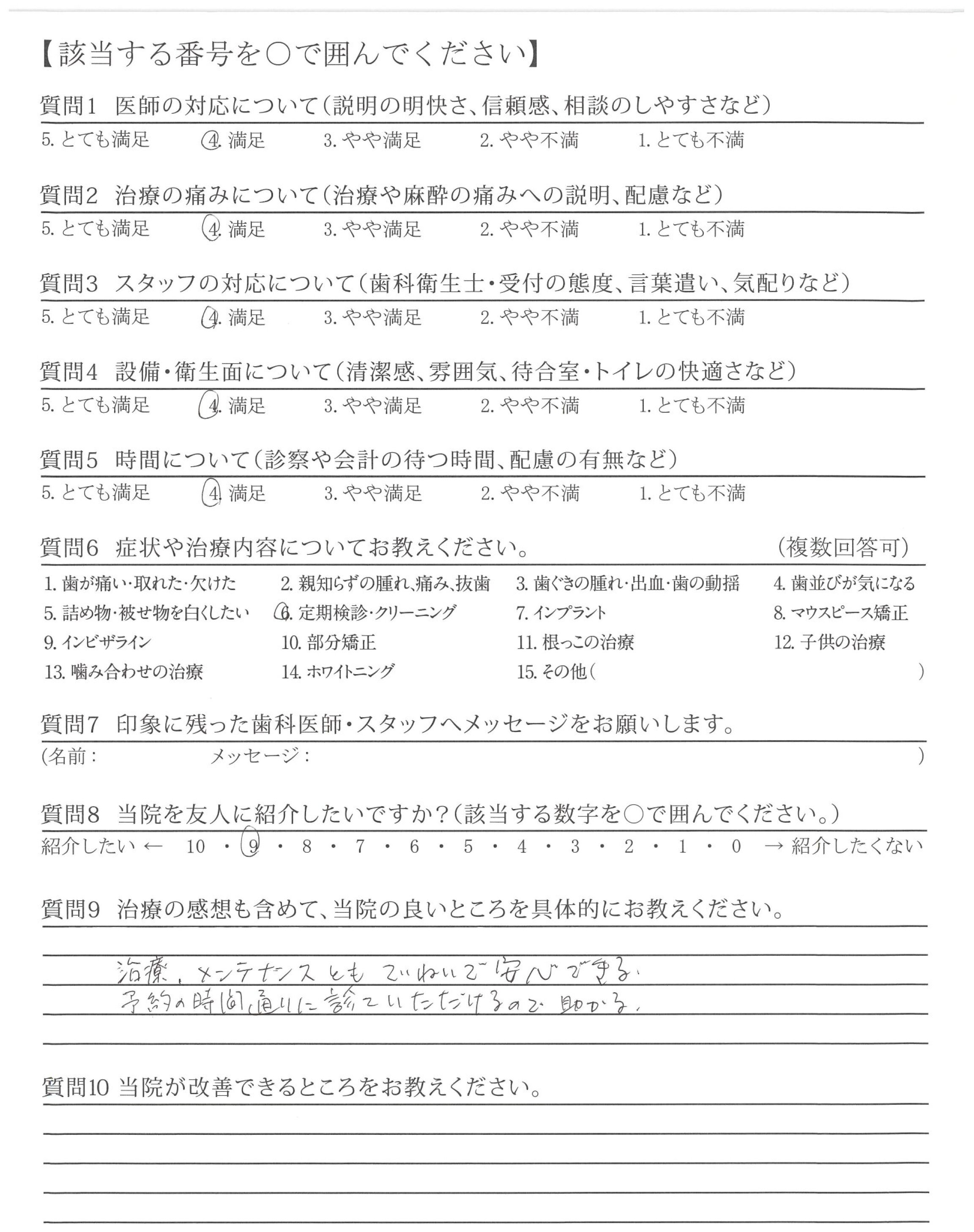 メンテナンスをしっかりしていただいて治療以前ですんでいるのでありがたいです。