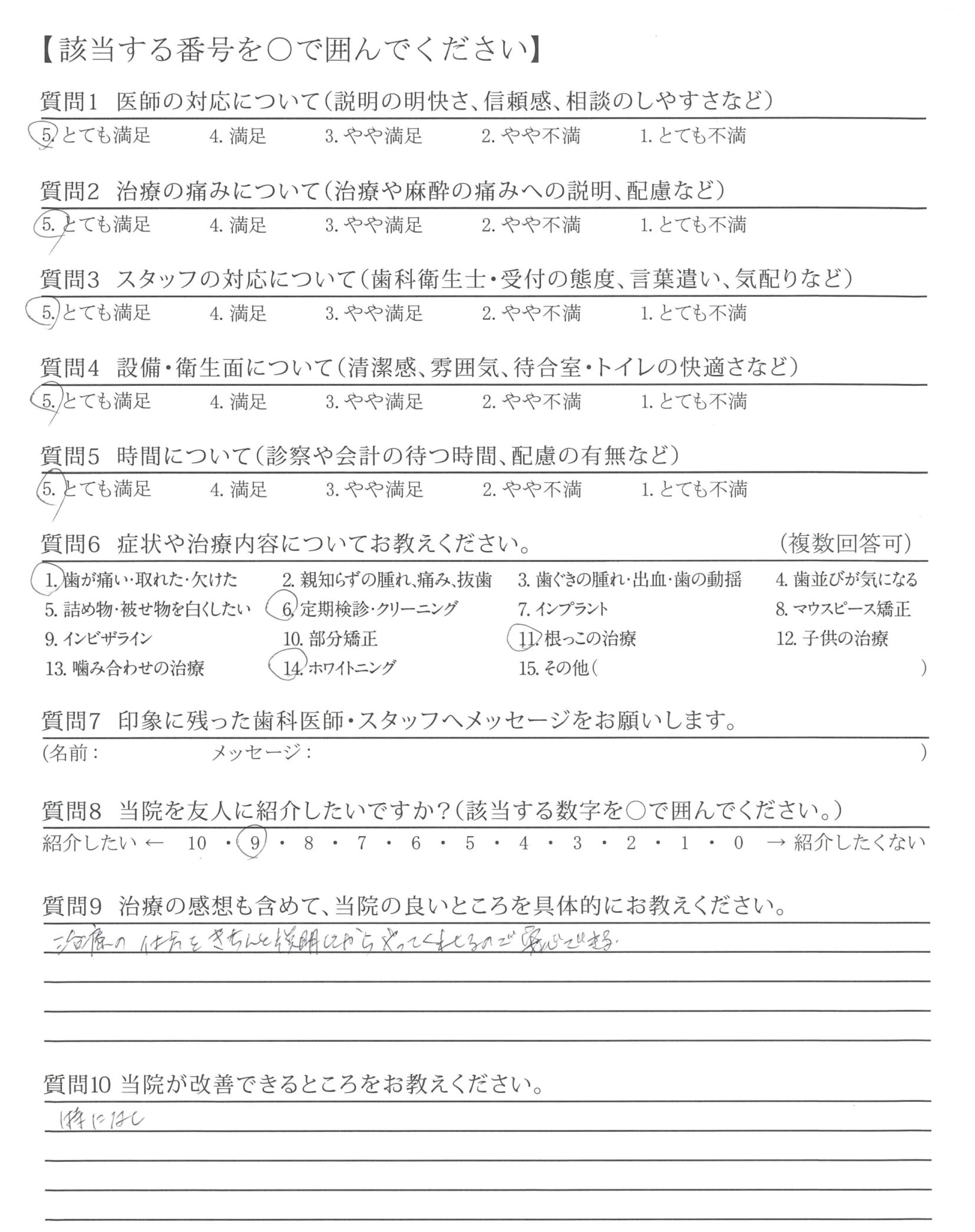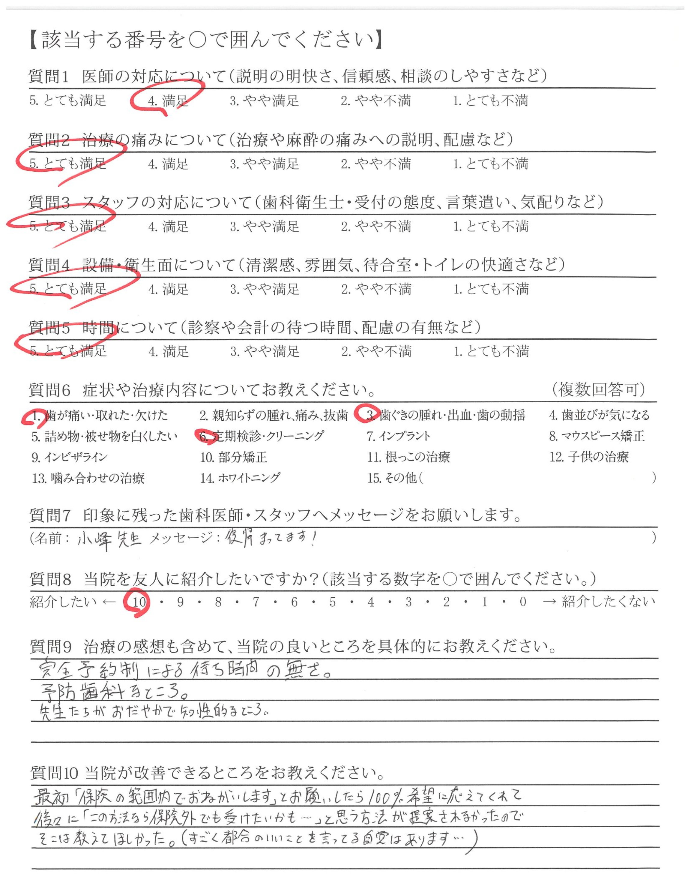 ・保険診療外のメンテナンスはどうしても高額なので、今後の課題です。診療代は高くならないようにしていただければ嬉しい。