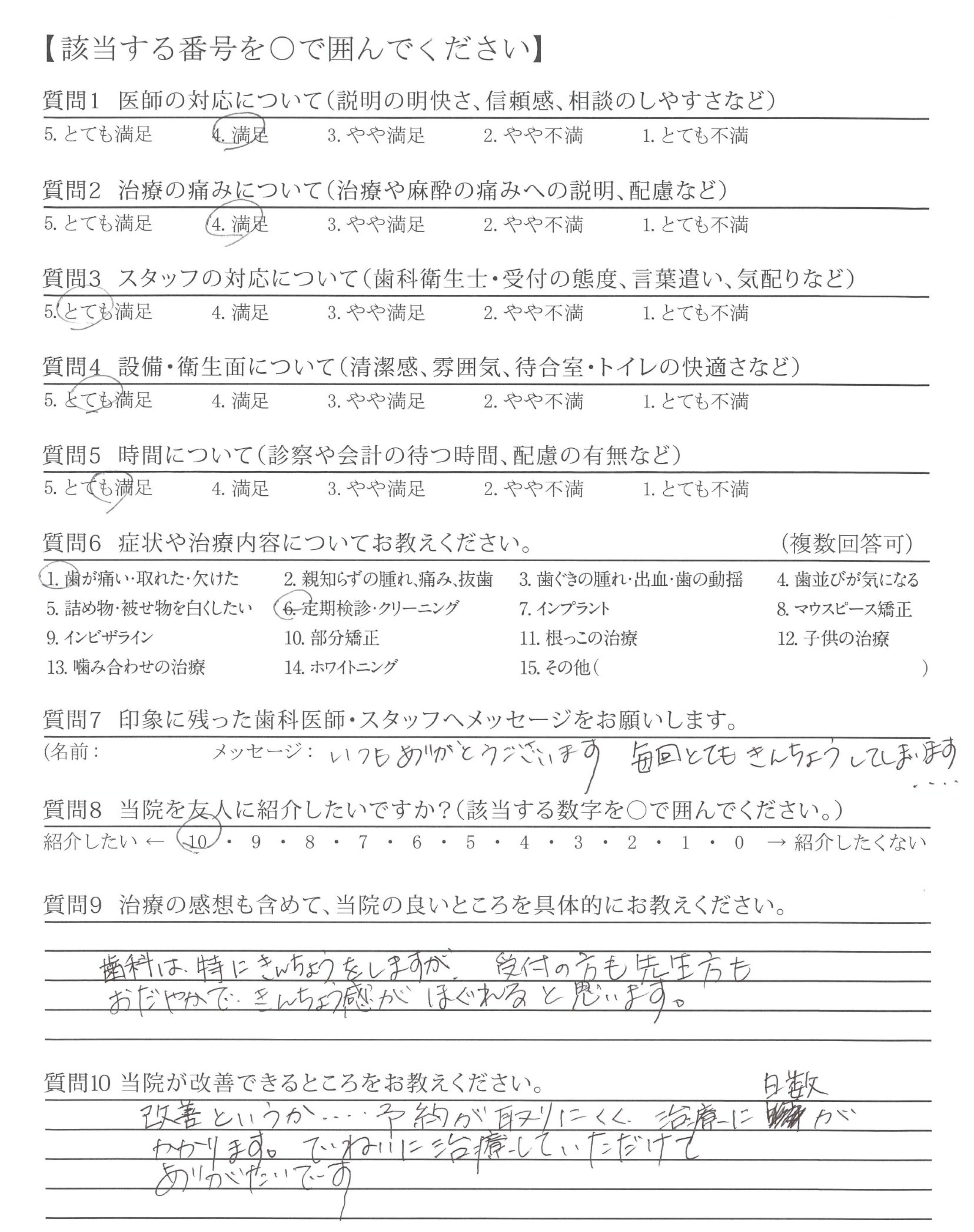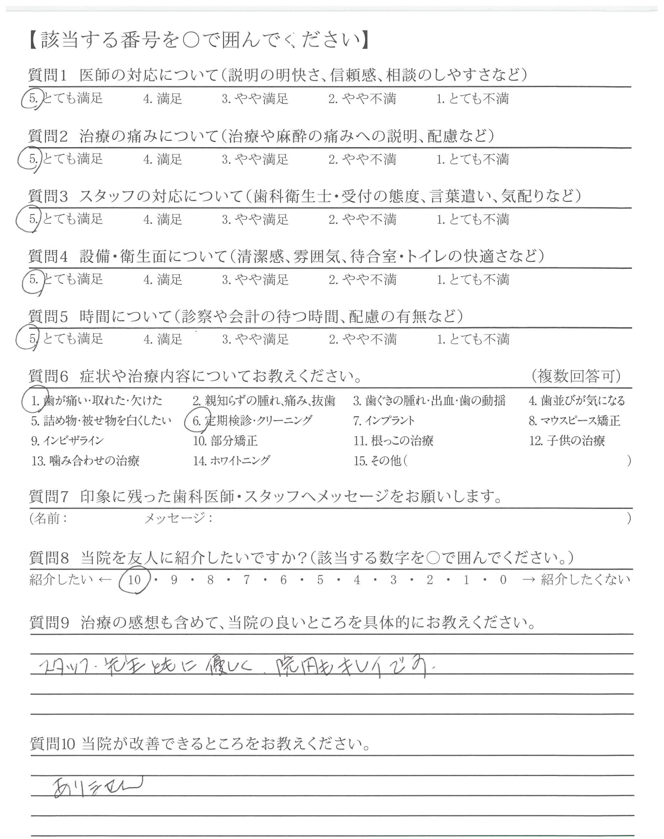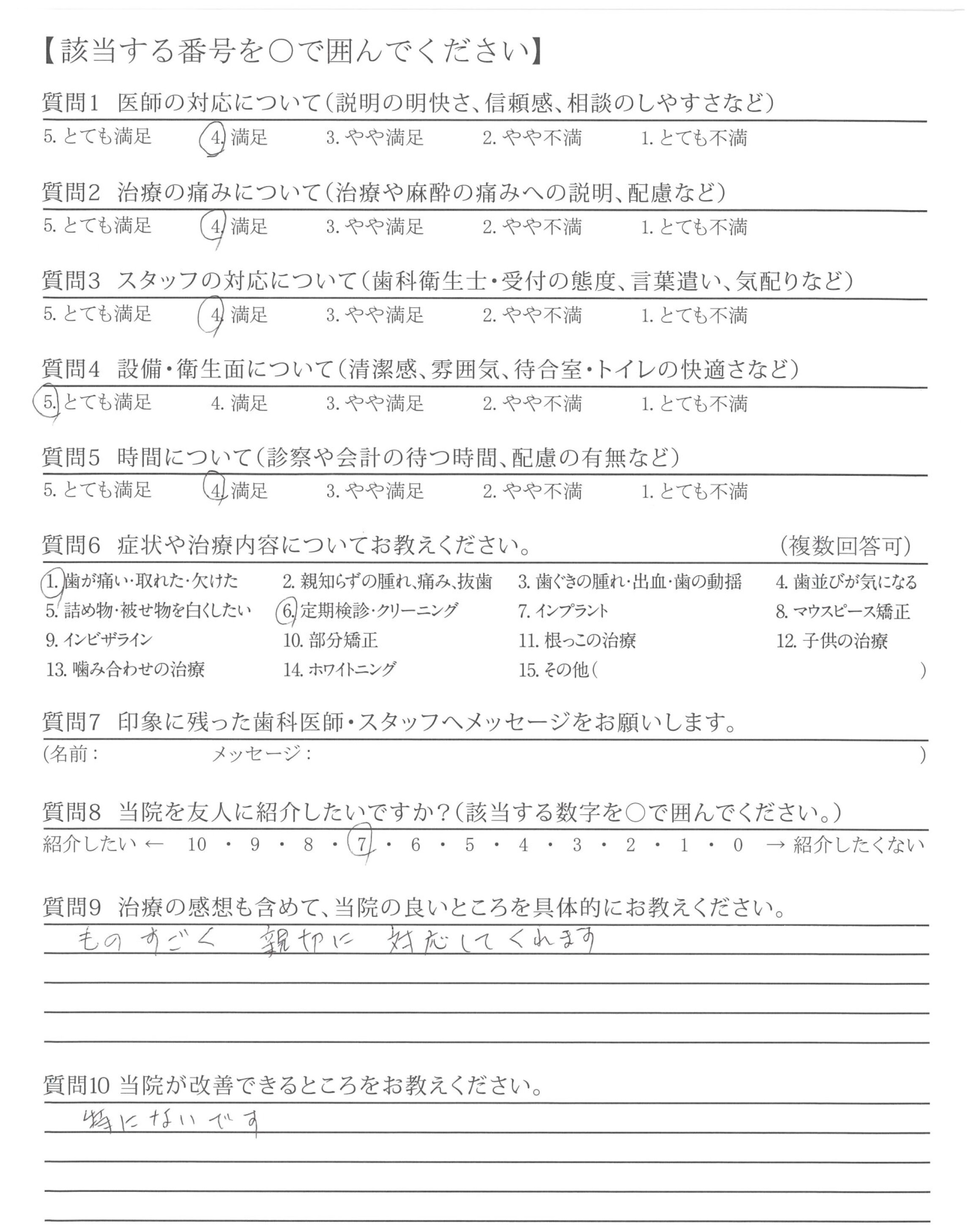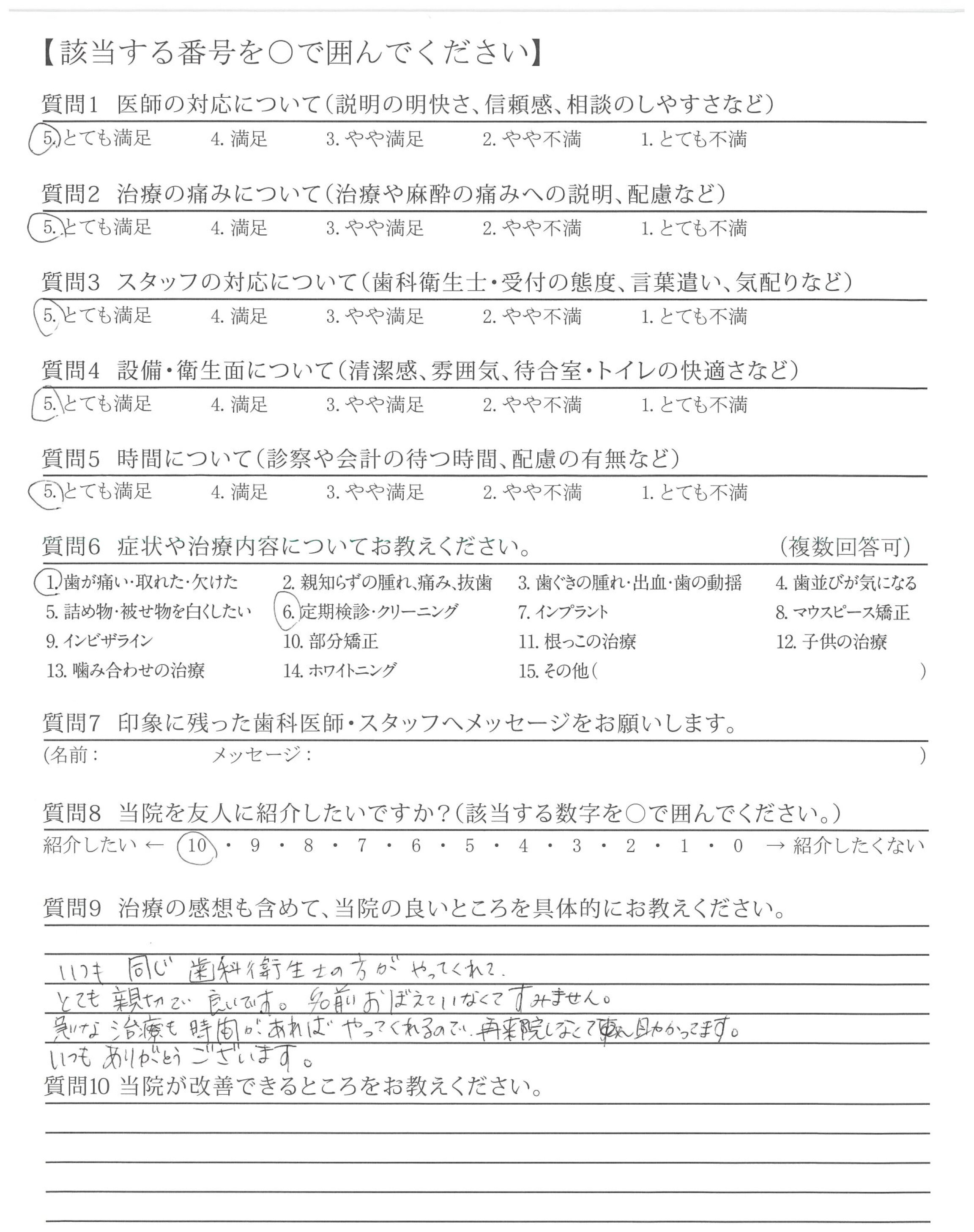 いつも同じ歯科衛生士の方がやってくれて、とても親切で良いです。名前おぼえてなくてすみません。