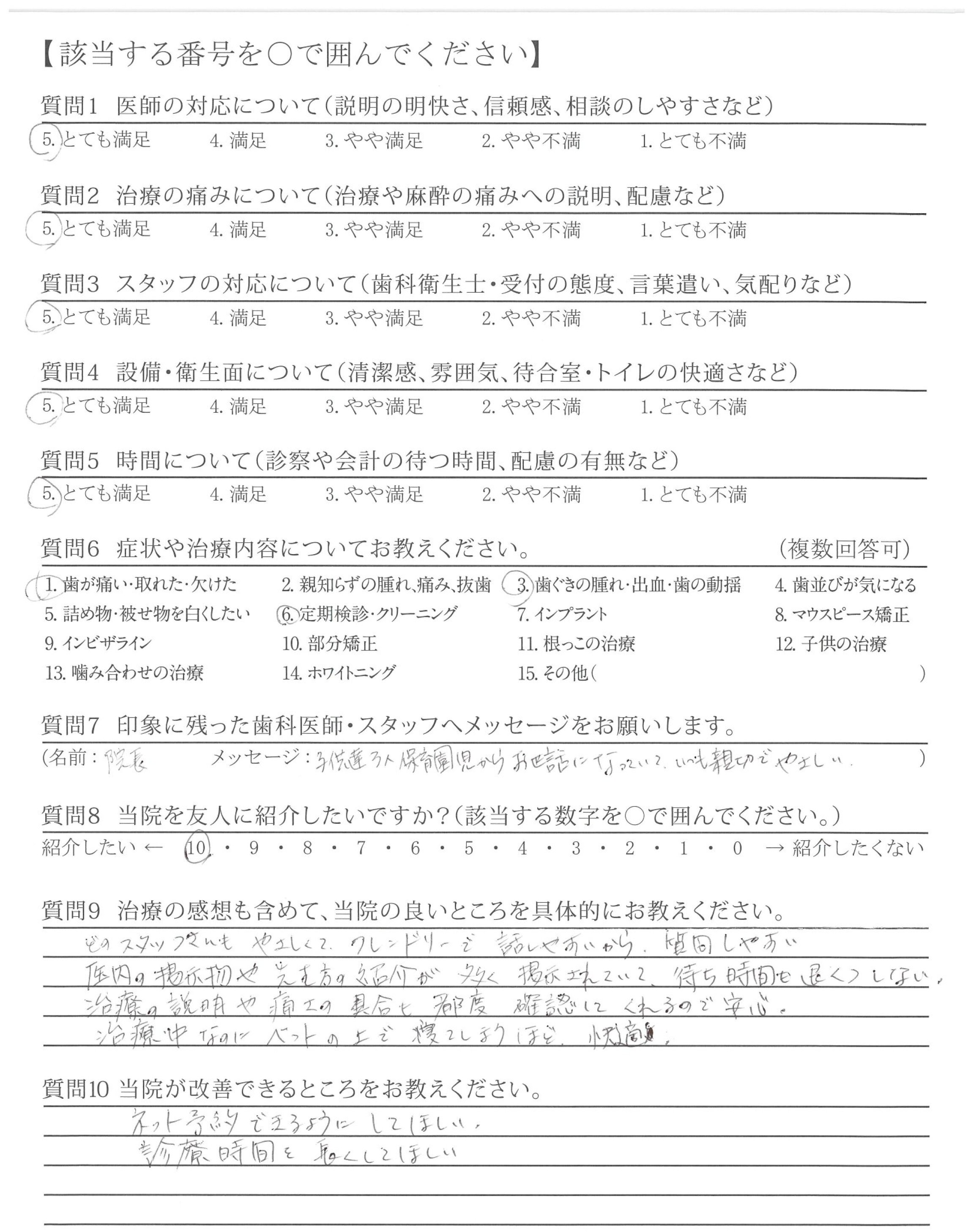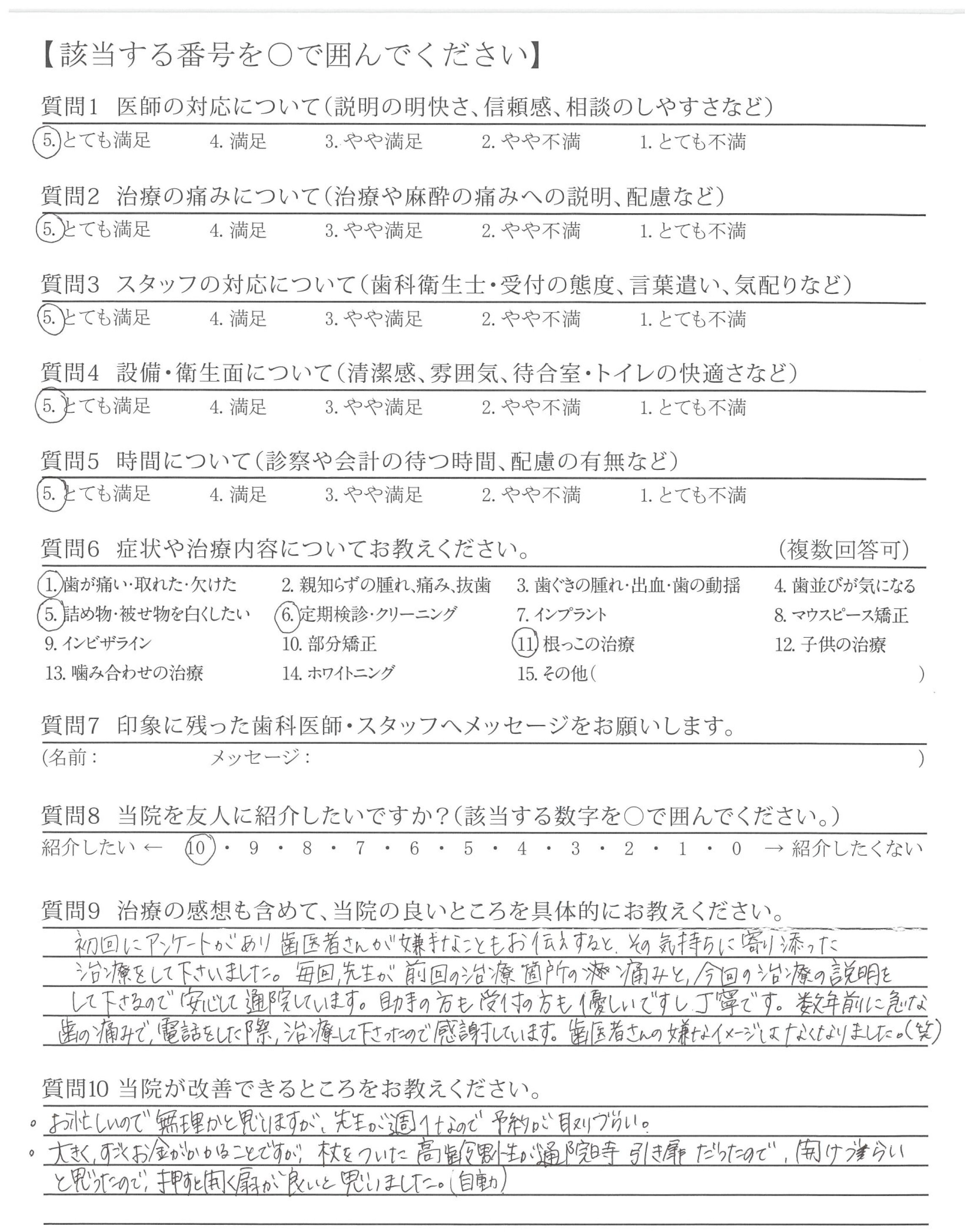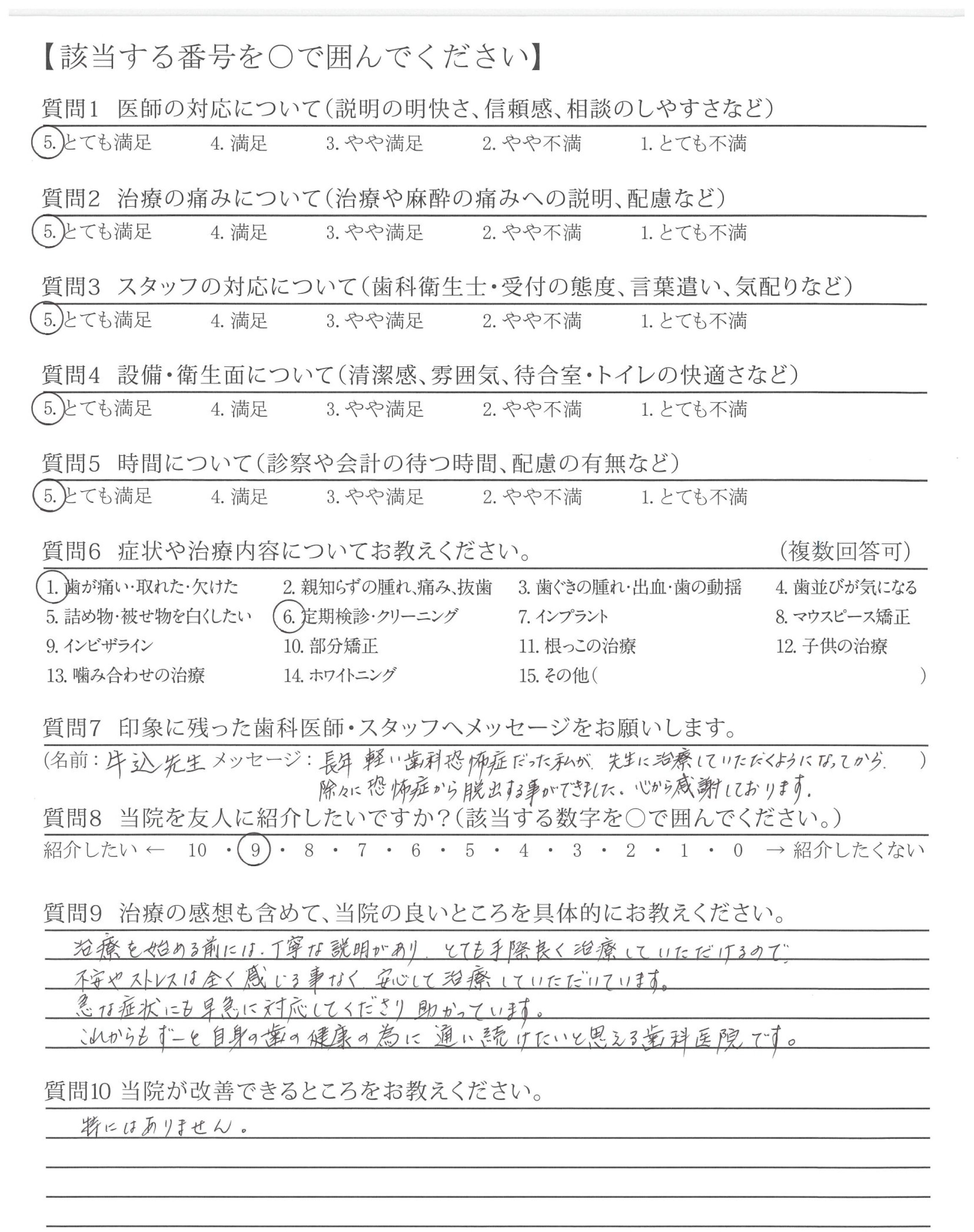 長年軽い歯科恐怖症だった私が、先生に治療していただくようになってから、徐々に恐怖症から脱出する事ができました。心から感謝しております。