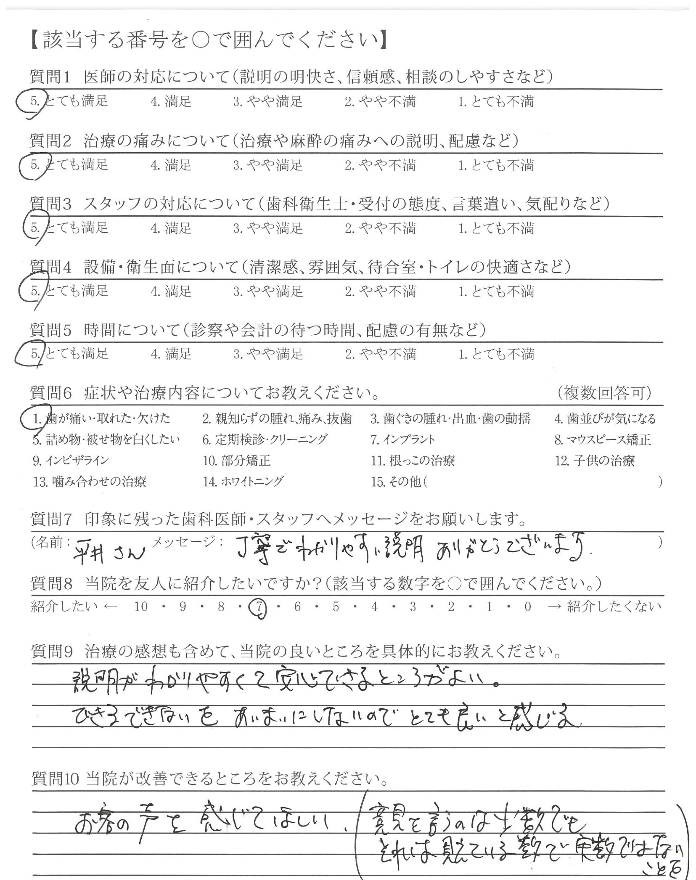 初回にアンケートがあり歯医者さんが嫌いなこともお伝えすると、その気持ちに寄り添った治療をして下さいました。
