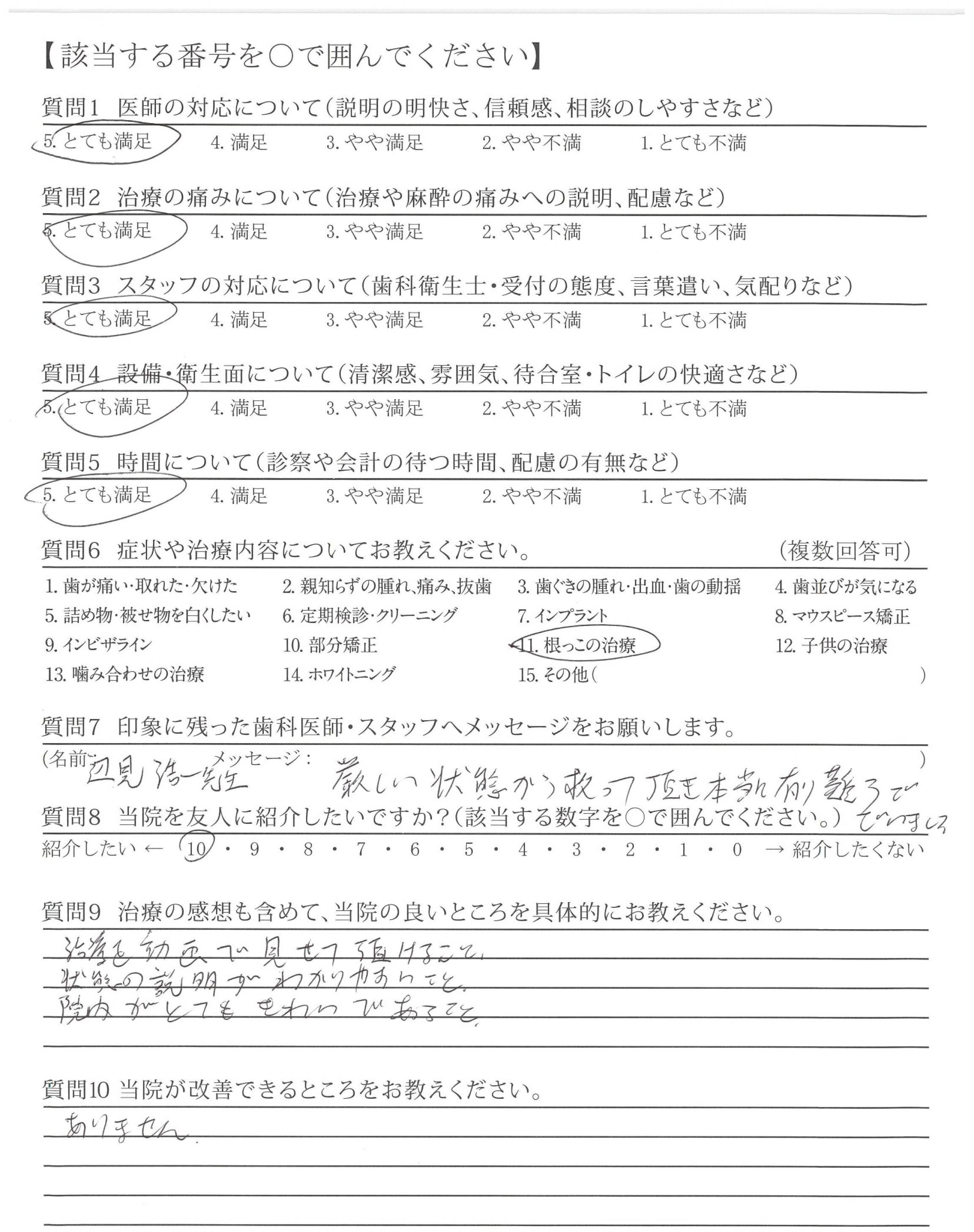 数年前、他の歯科医院に通っており、歯根端切除の手術で大学病院を紹介された。そこで手術したものの、再発してしまい、辺見先生に手術してもらい完治した。この治療(手術)に限らず、今までの治療は何だったのかと思う。
