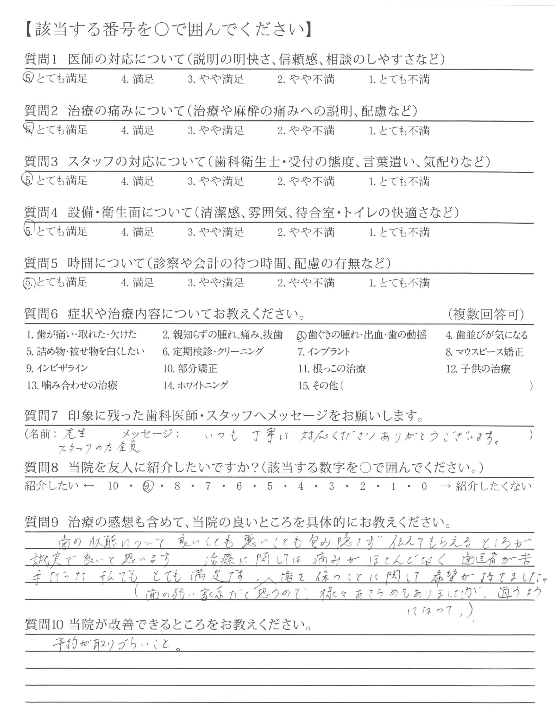 治療しづらい私の口腔内を丁寧に綺麗にしてくださり感謝しております。どうもありがとうございます。