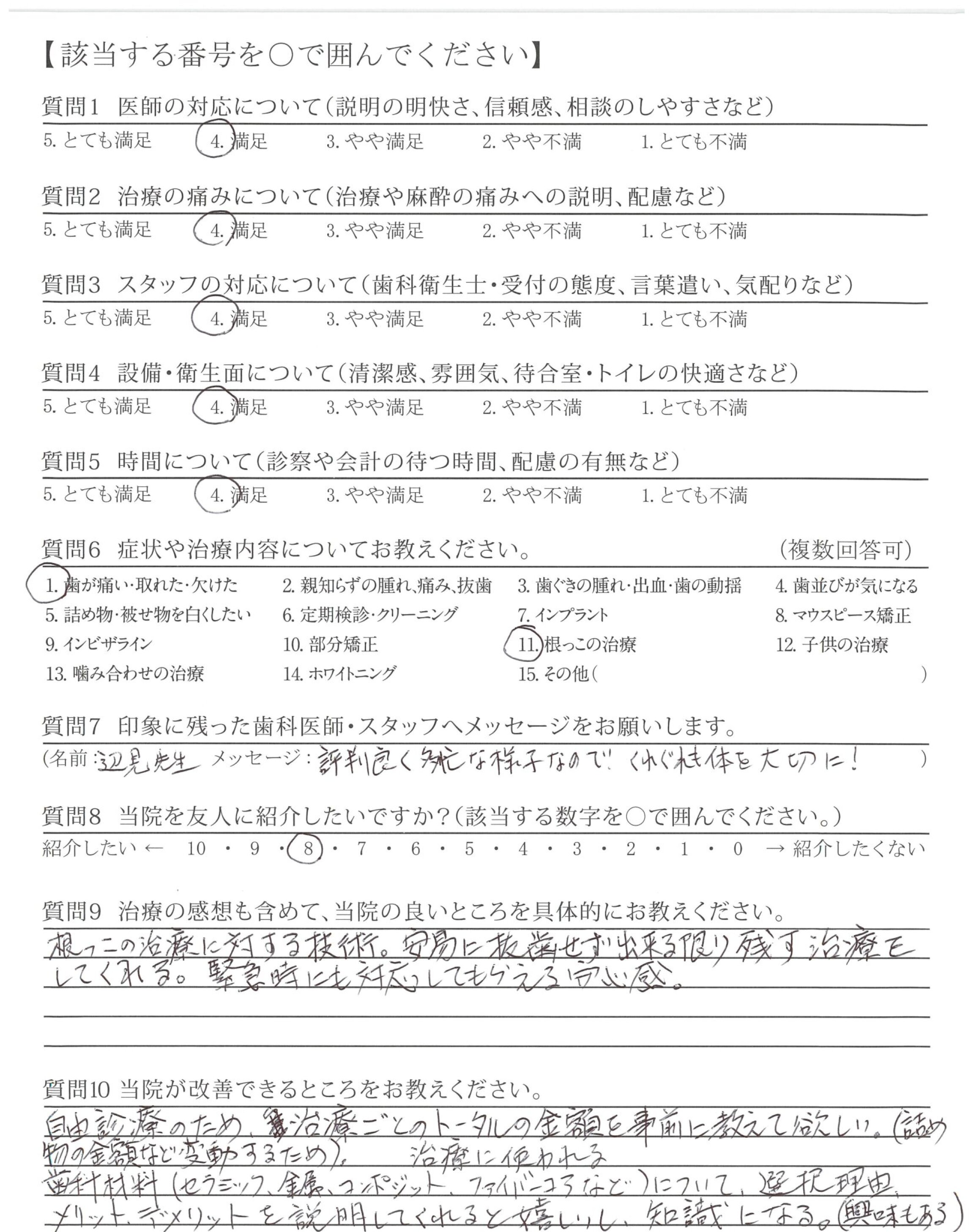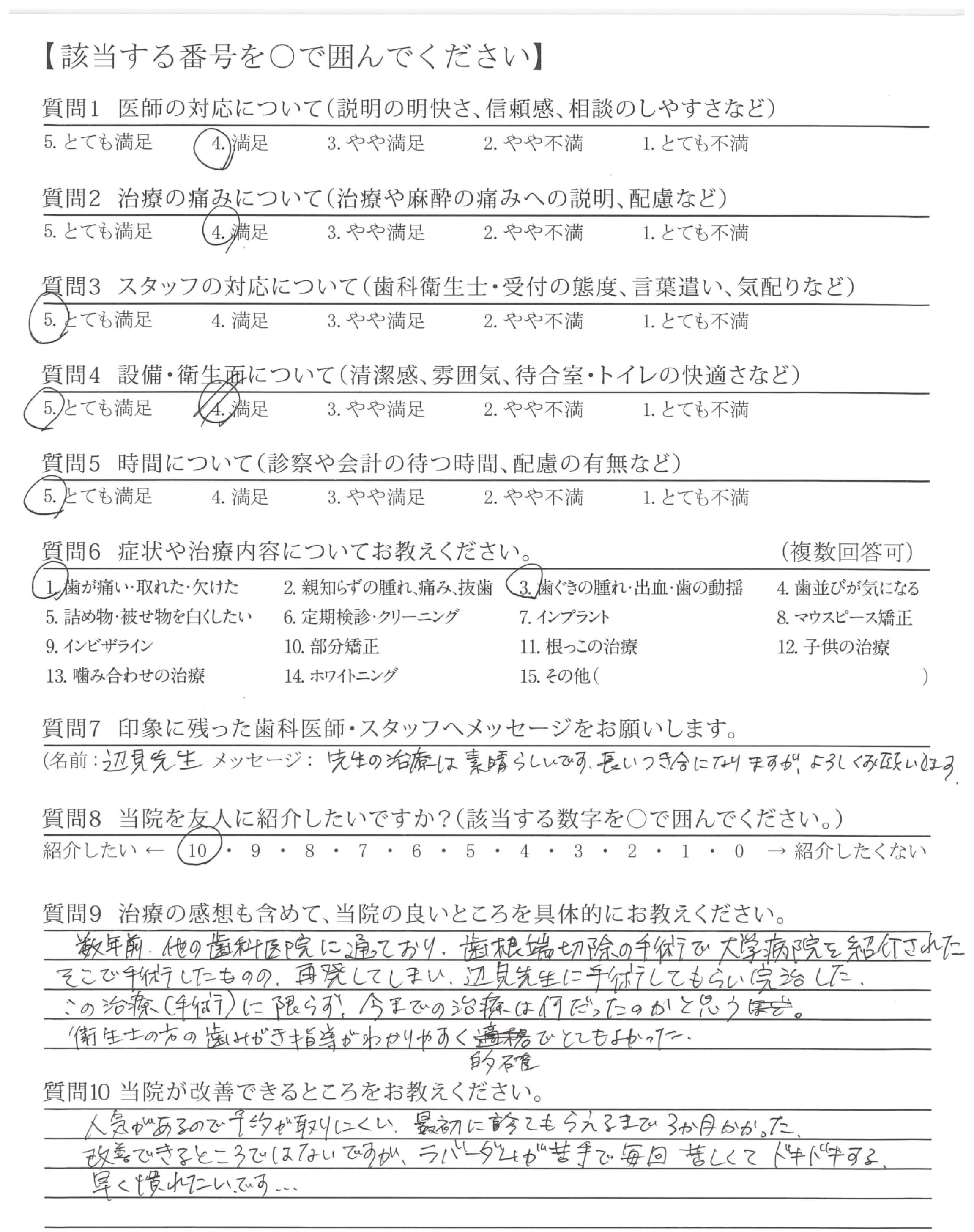 数年前、他の歯科医院に通っており、歯根端切除の手術で大学病院を紹介された。そこで手術したものの、再発してしまい、辺見先生に手術してもらい完治した。この治療(手術)に限らず、今までの治療は何だったのかと思う。