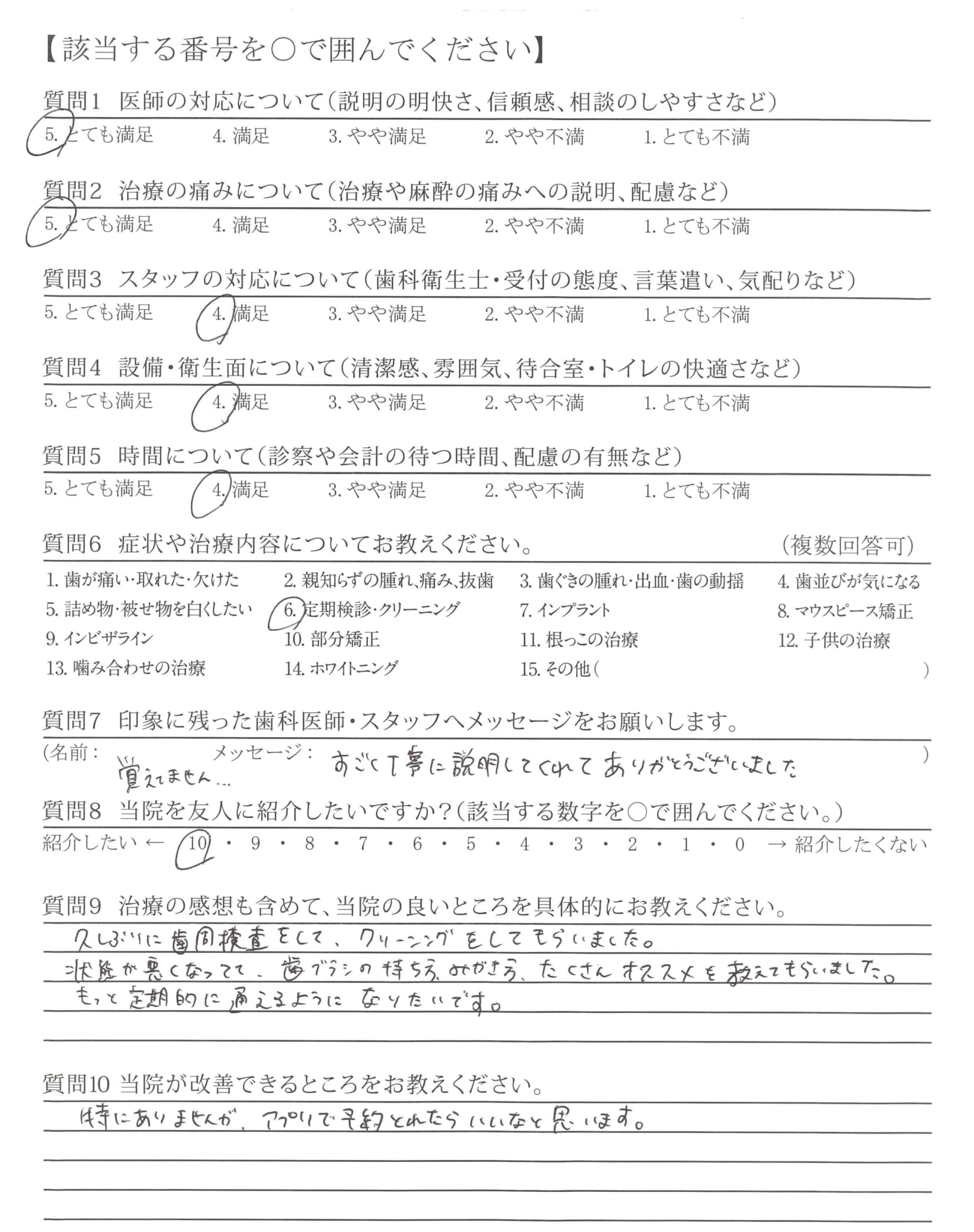 親身にブラッシング、フロスの方法を案内していただきありがとうございました。私の生活スタイルに合わせて、マウスウォッシュをご提案していただいたこと、とても嬉しかったです。