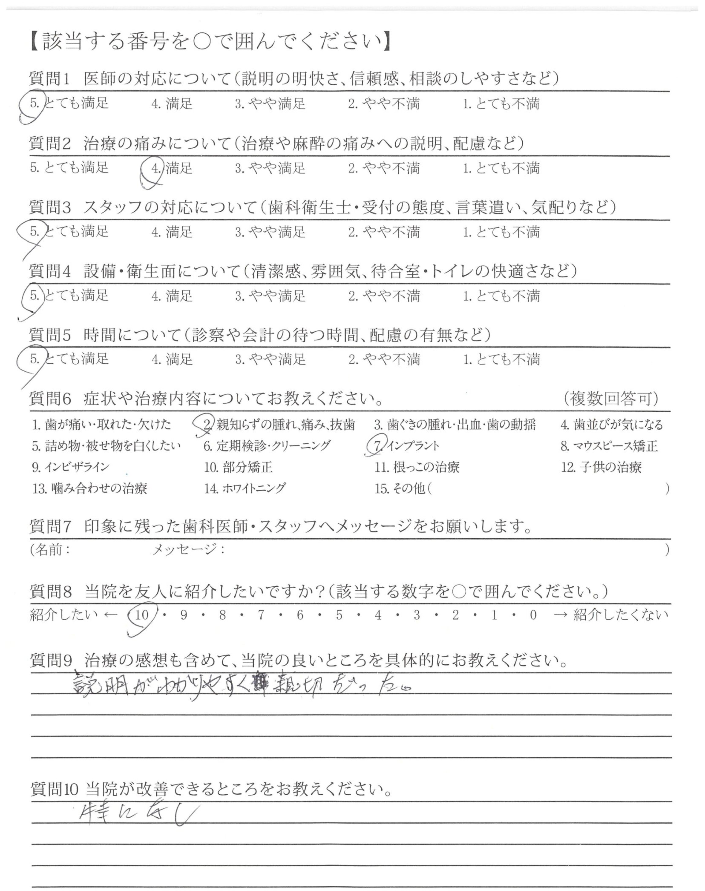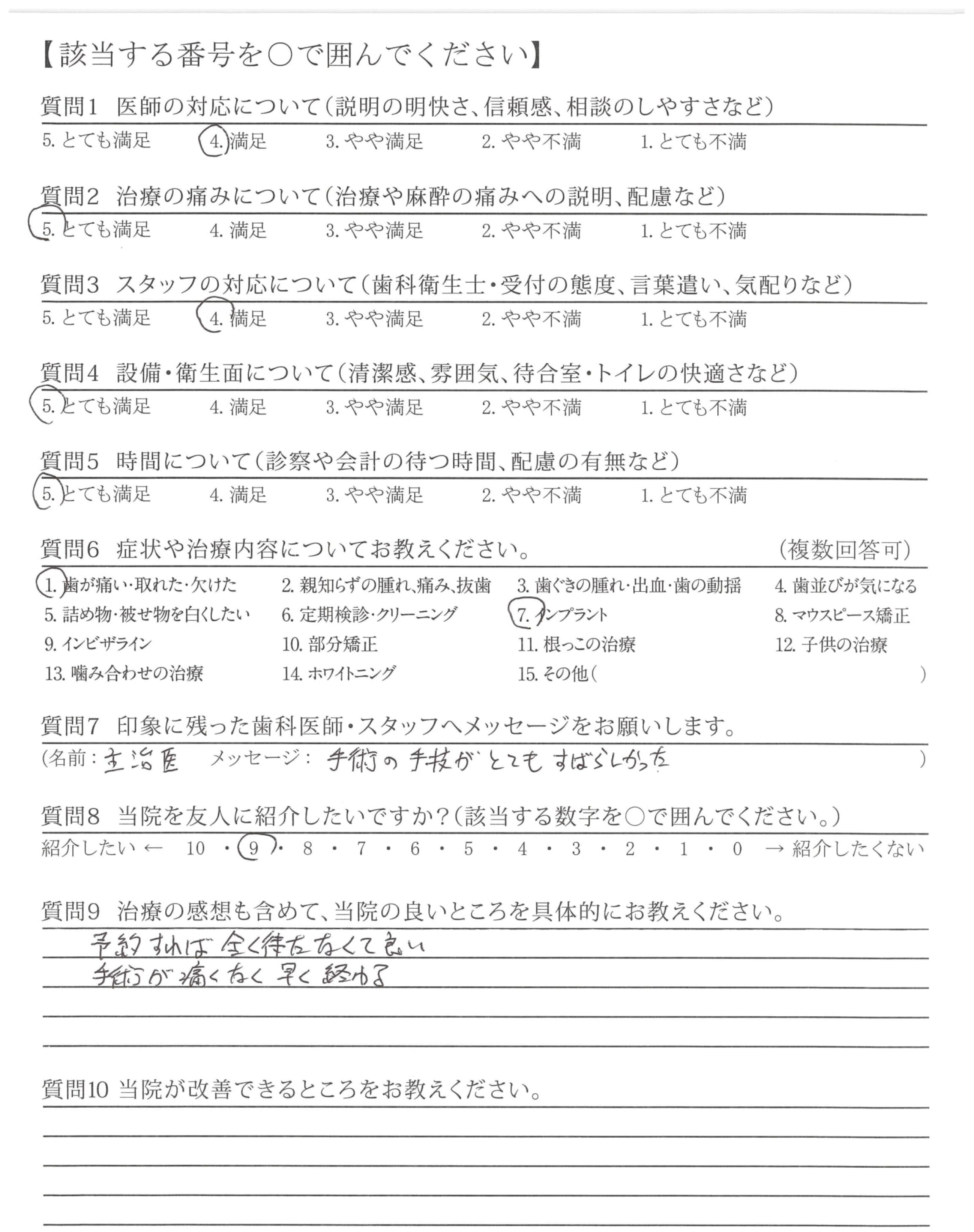 インプラント手術は、土台の形成をしっかりやっていただけたことと、サージカルテンプレートを使用することで、確実な施術が行なわれるなど、安心感を感じました。
