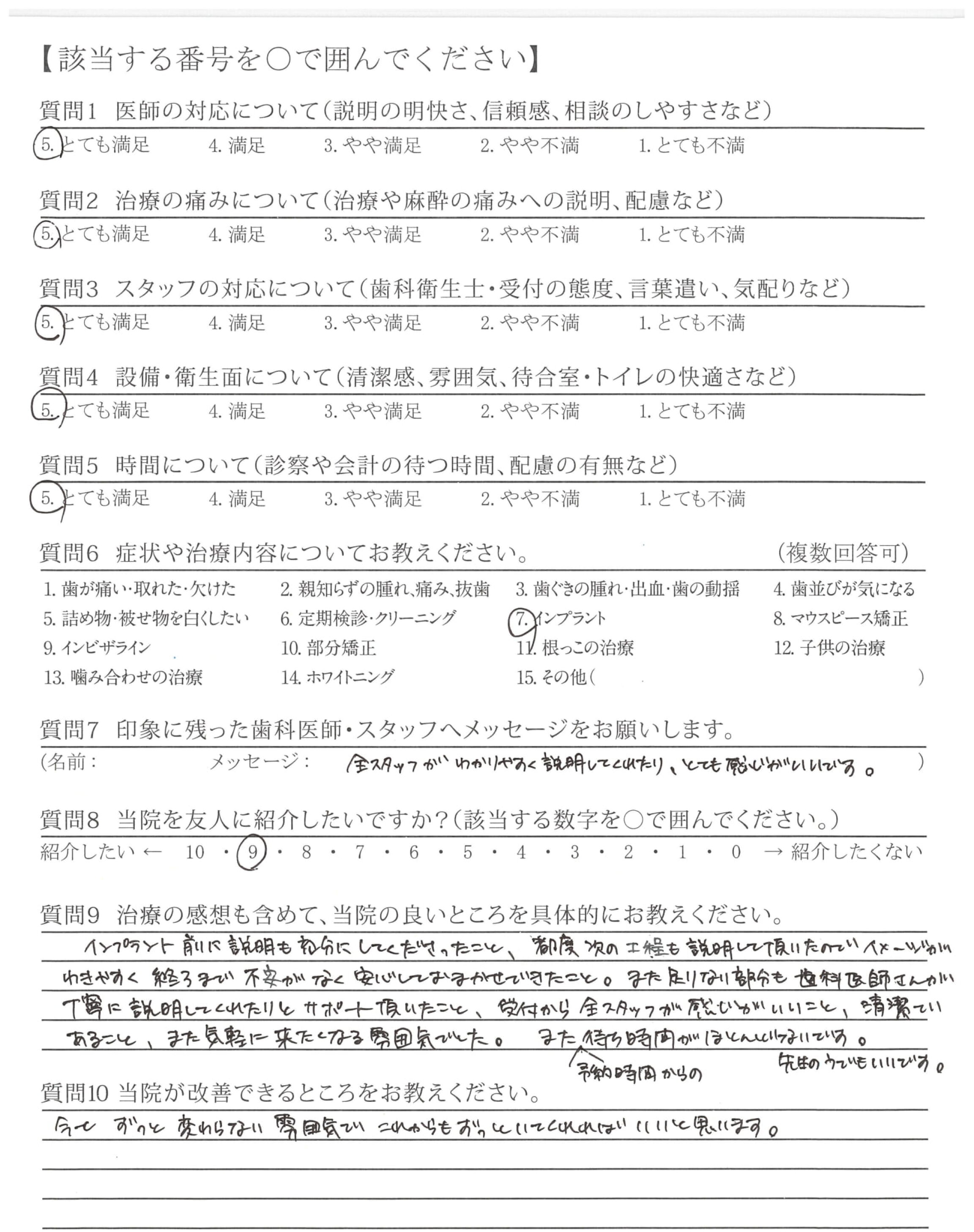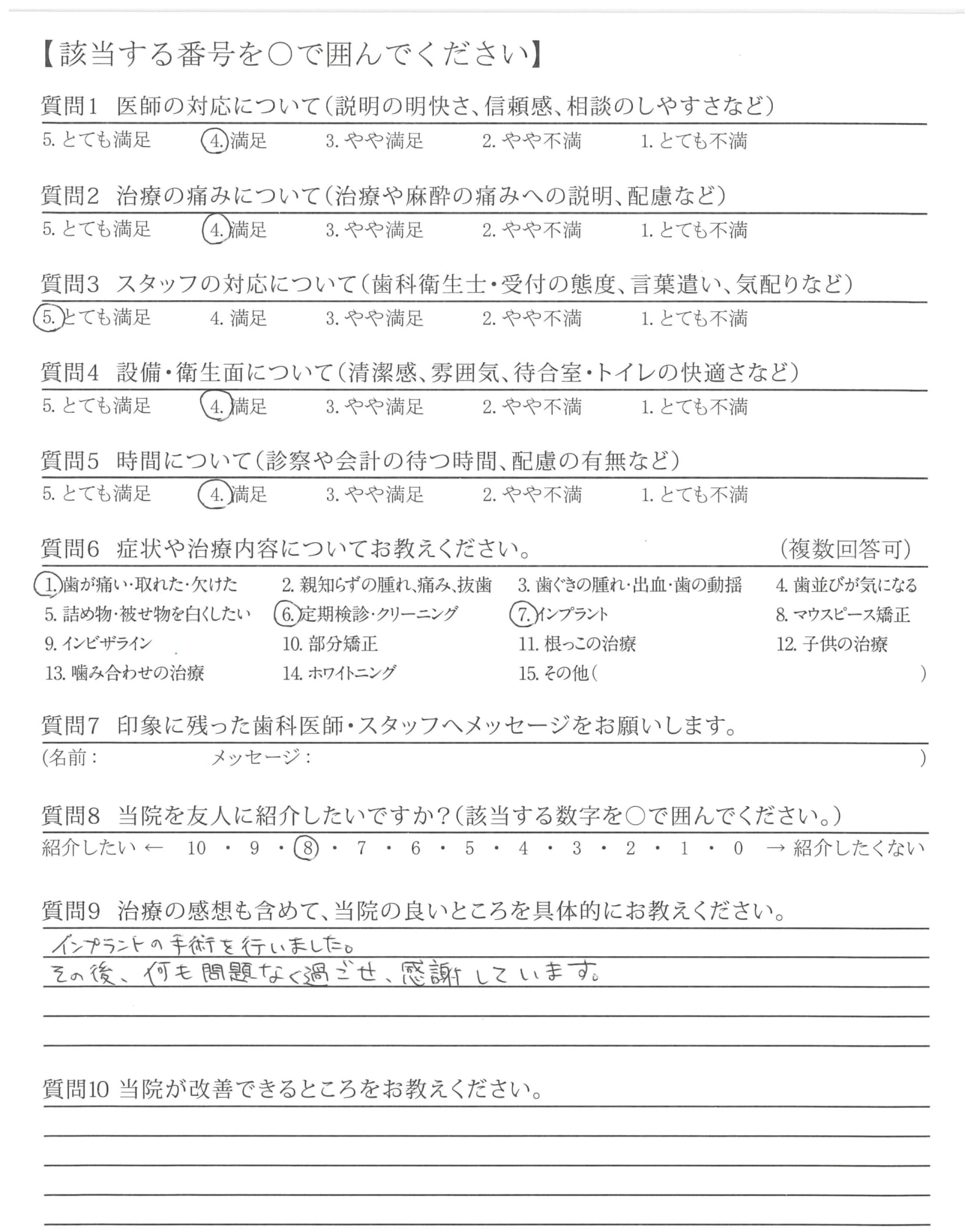 インプラントを入れていただいて7年目となりますが、不具合もなく快適に生活しております。