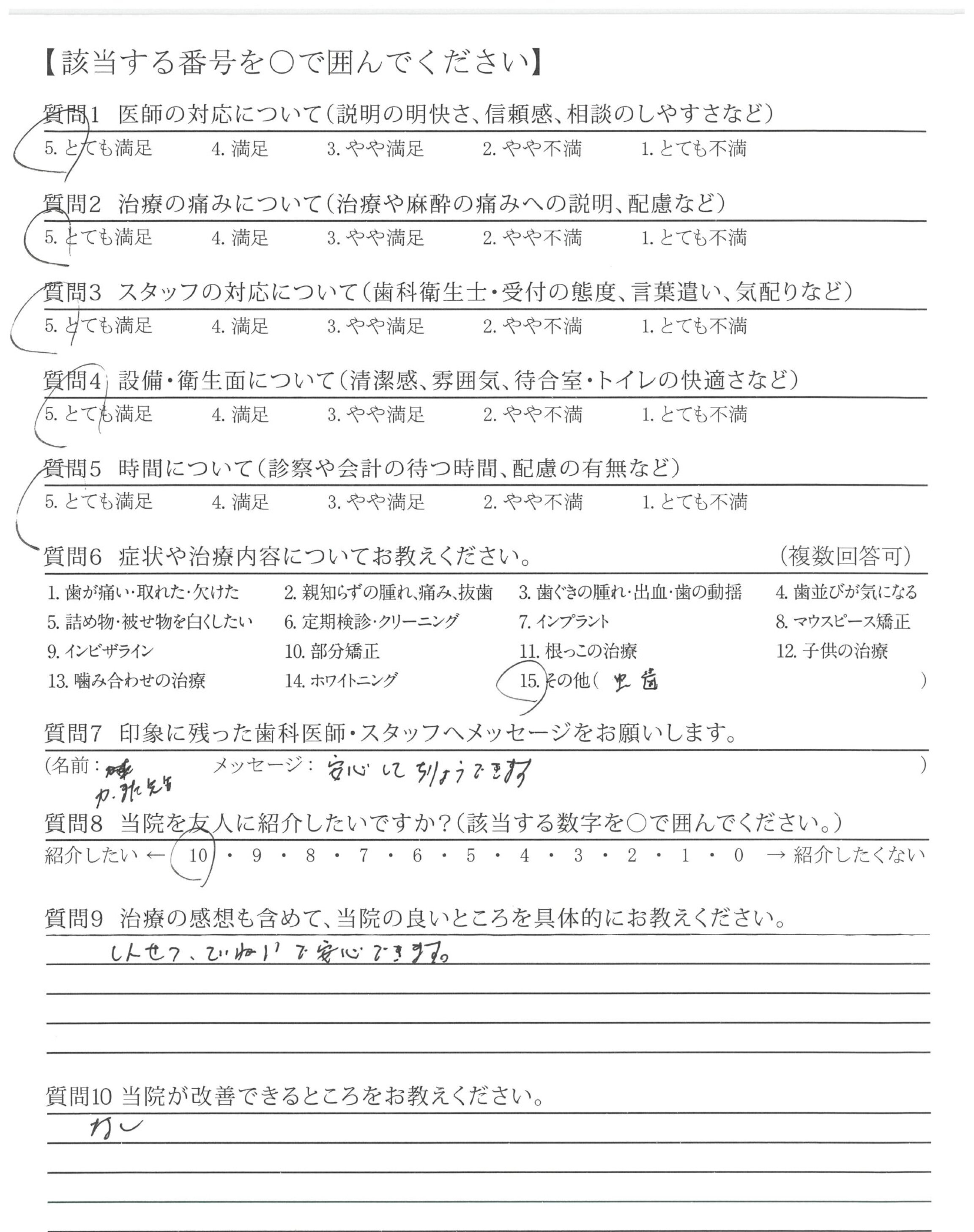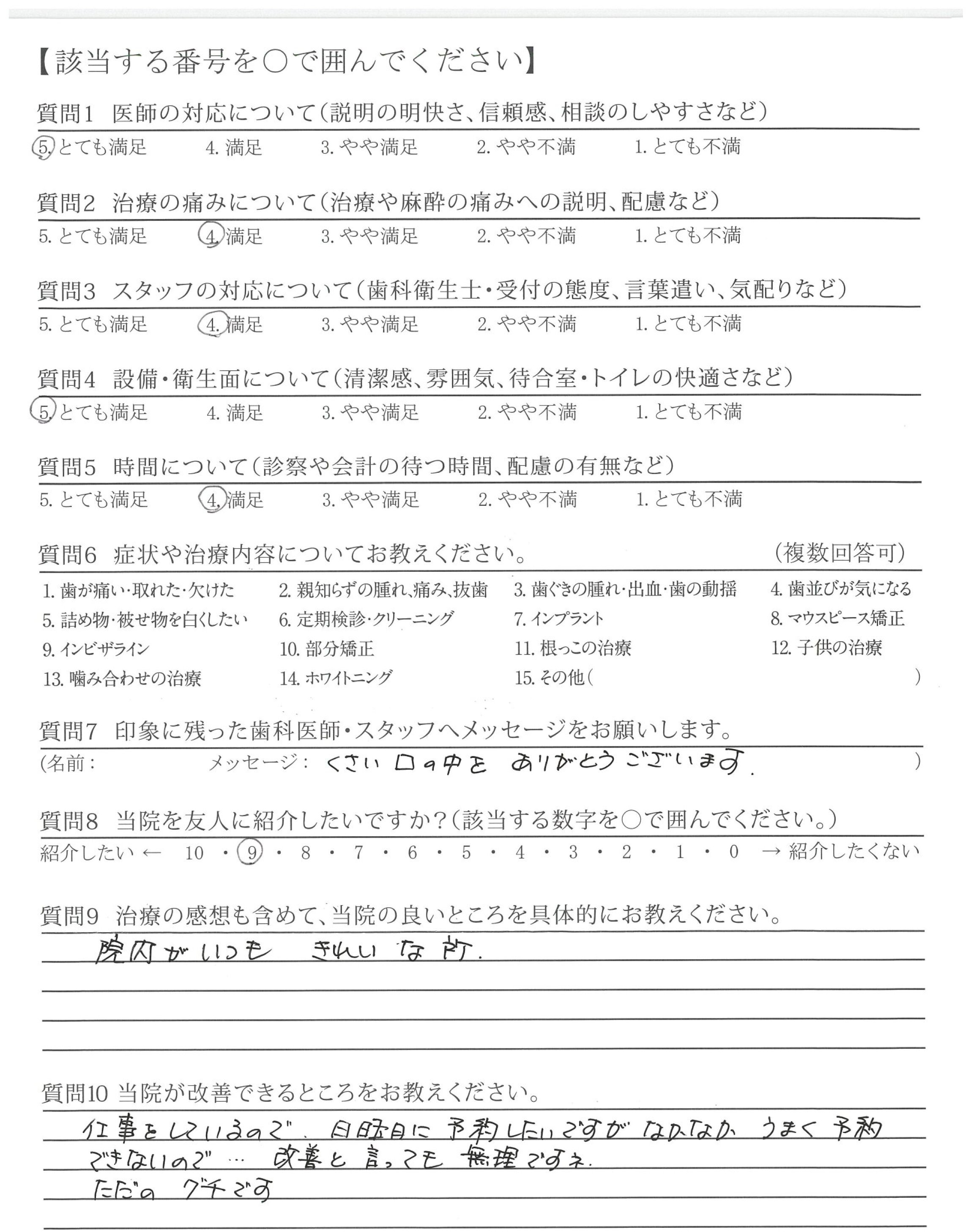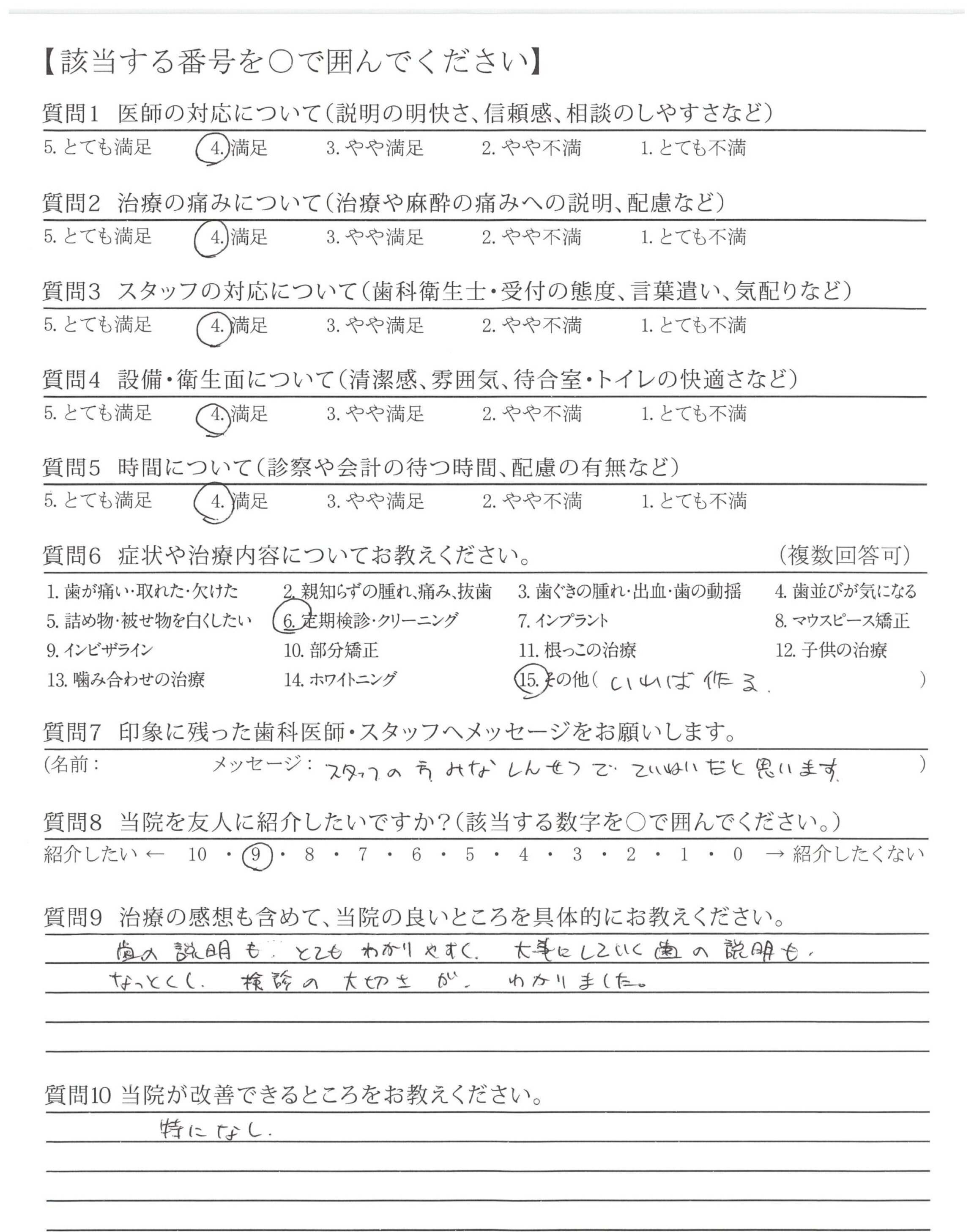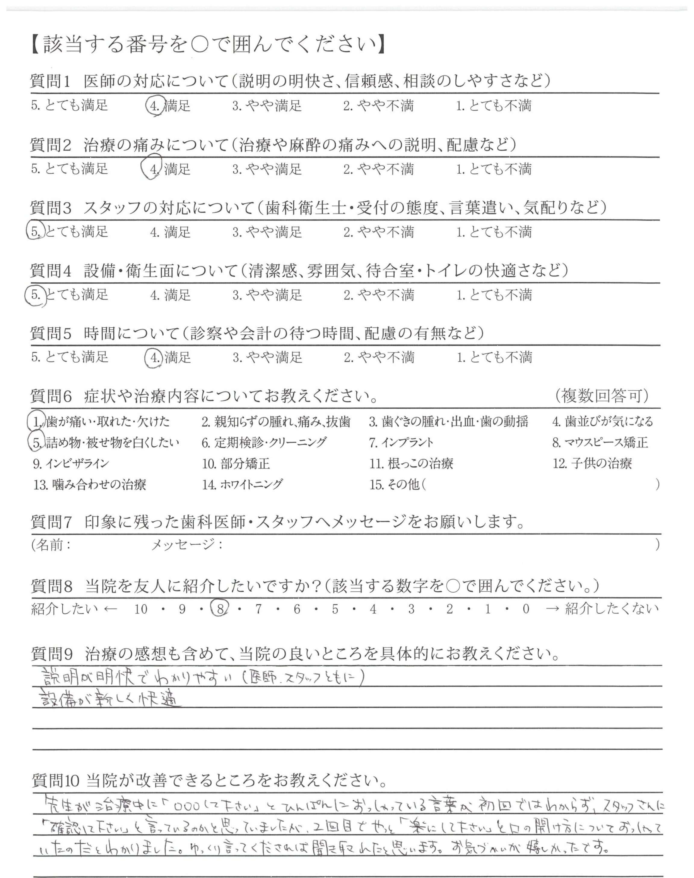 先生が治療中に「〇〇〇して下さい」とひんぱんにおっしゃっている言葉が初回ではわからず、スタッフさんに「確認して下さい」と言っているのかと思っていましたが、2回目でやっと「楽にして下さい」と口の開け方についてずっとおっしゃっていたのだとわかりました。ゆっくり言ってくだされば聞き取れたと思います。お気づかいが嬉しかったです。