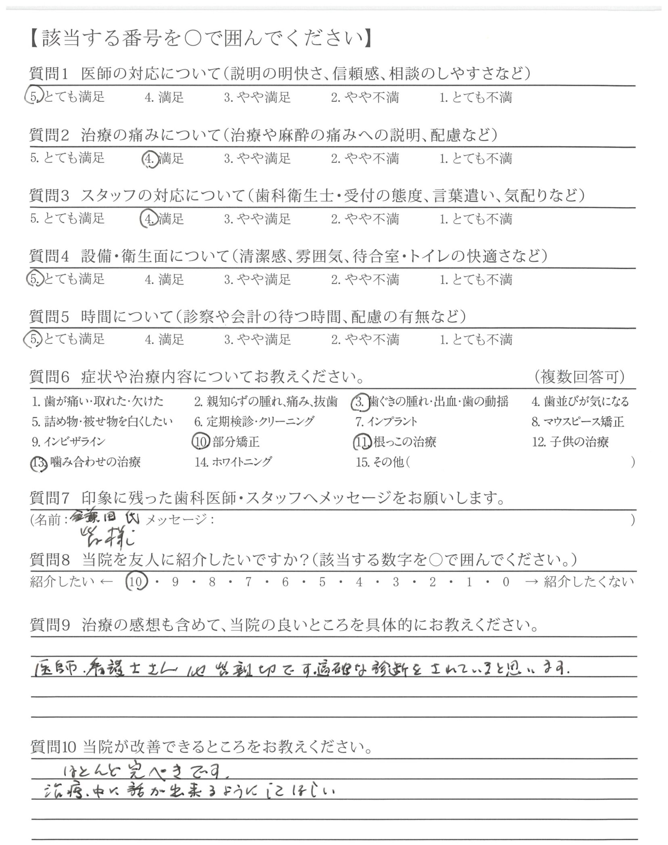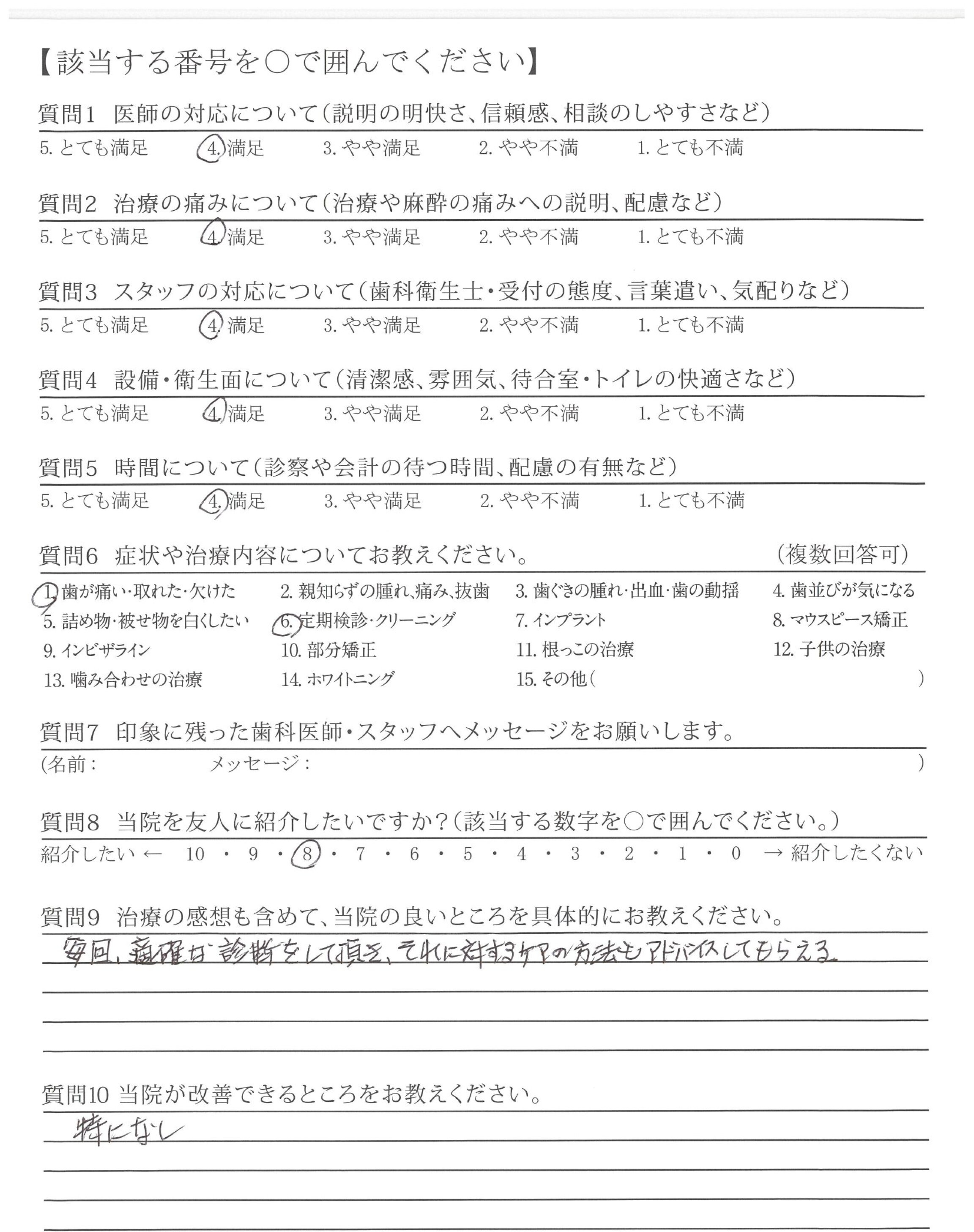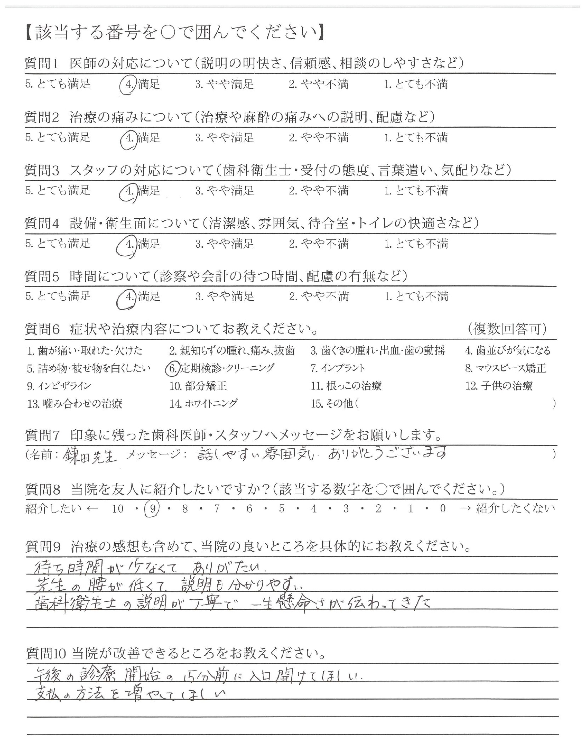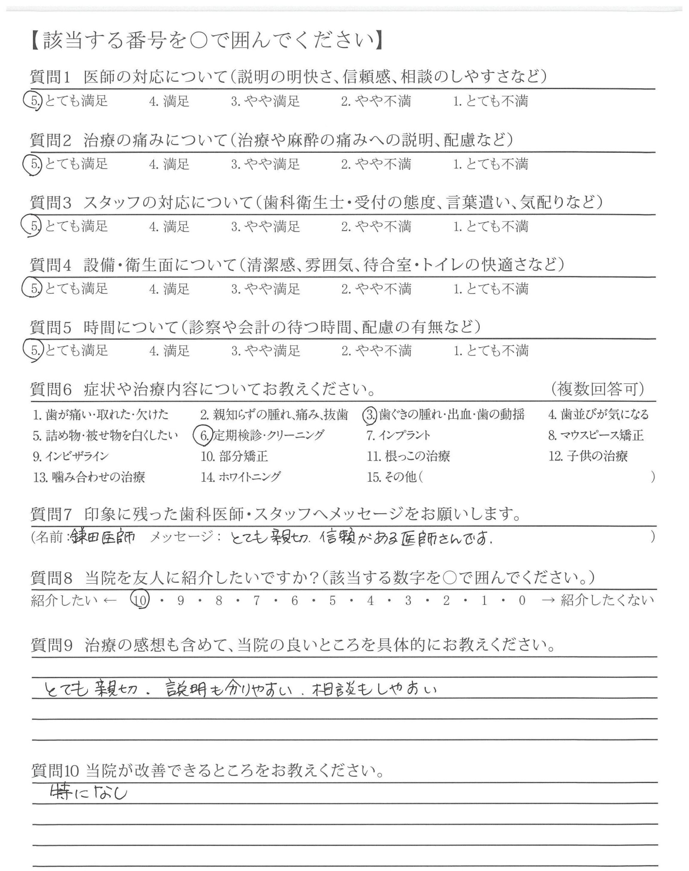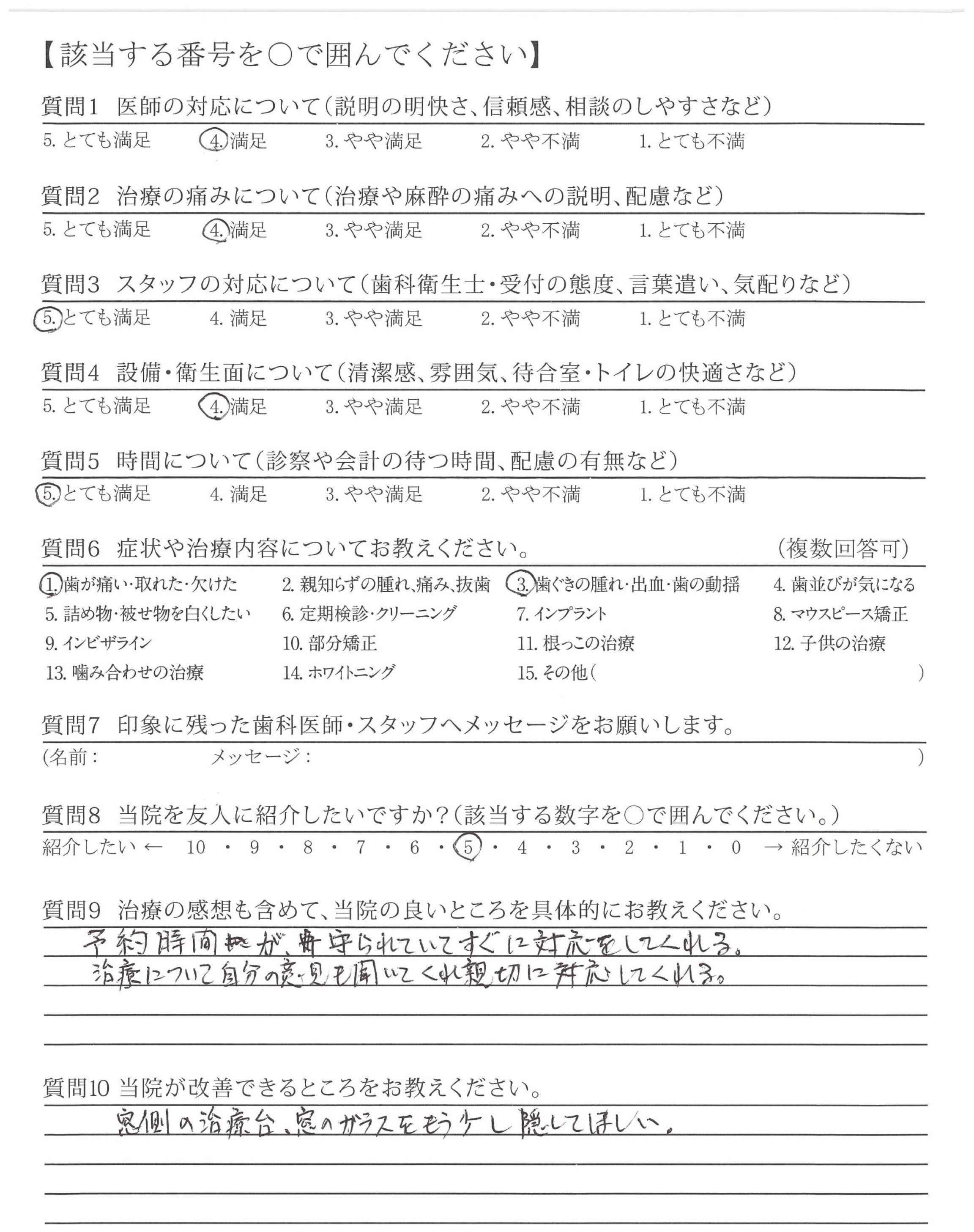 先生が治療中に「〇〇〇して下さい」とひんぱんにおっしゃっている言葉が初回ではわからず、スタッフさんに「確認して下さい」と言っているのかと思っていましたが、2回目でやっと「楽にして下さい」と口の開け方についてずっとおっしゃっていたのだとわかりました。ゆっくり言ってくだされば聞き取れたと思います。お気づかいが嬉しかったです。