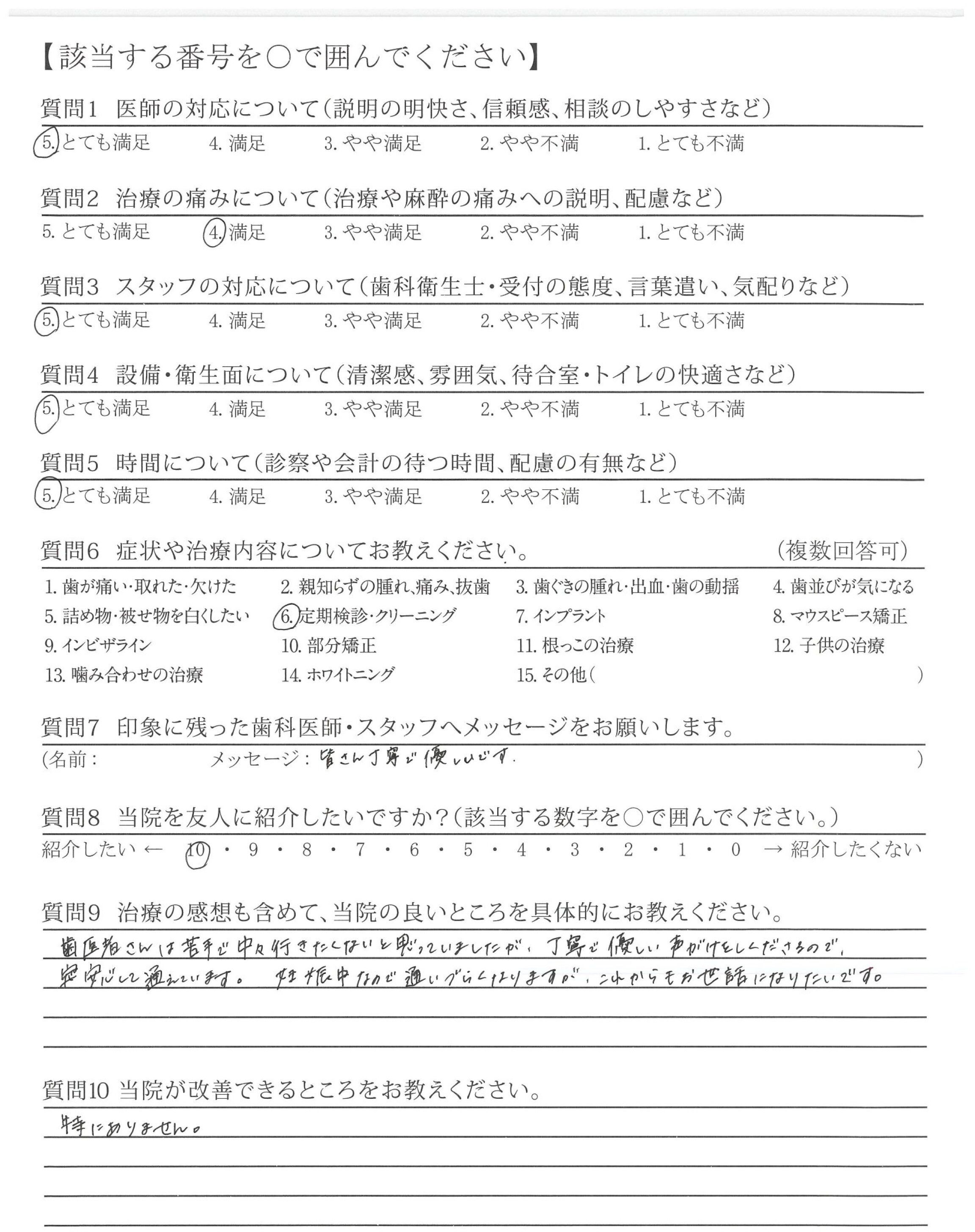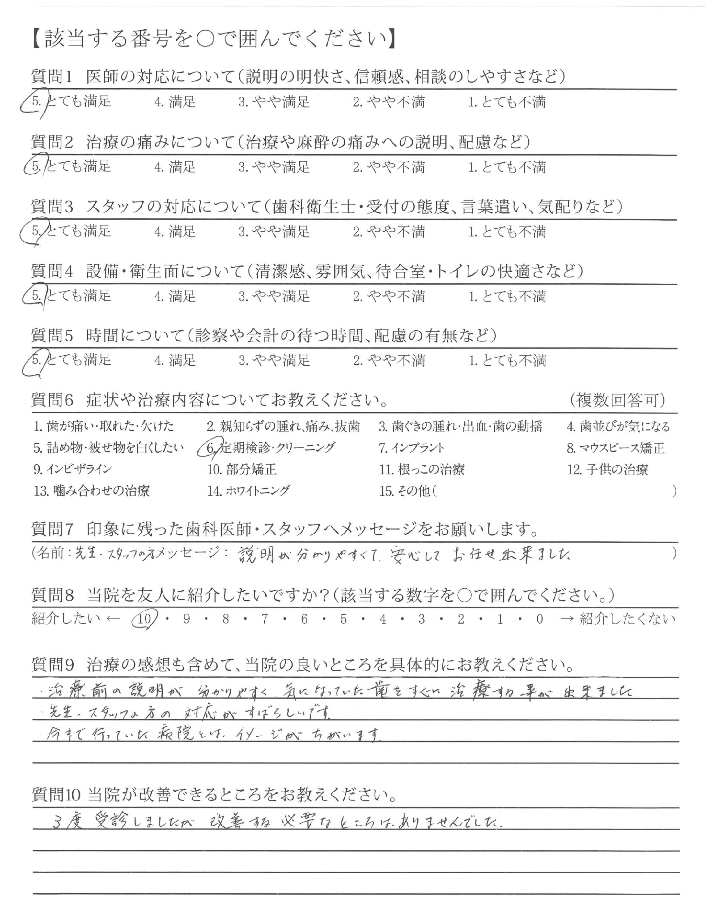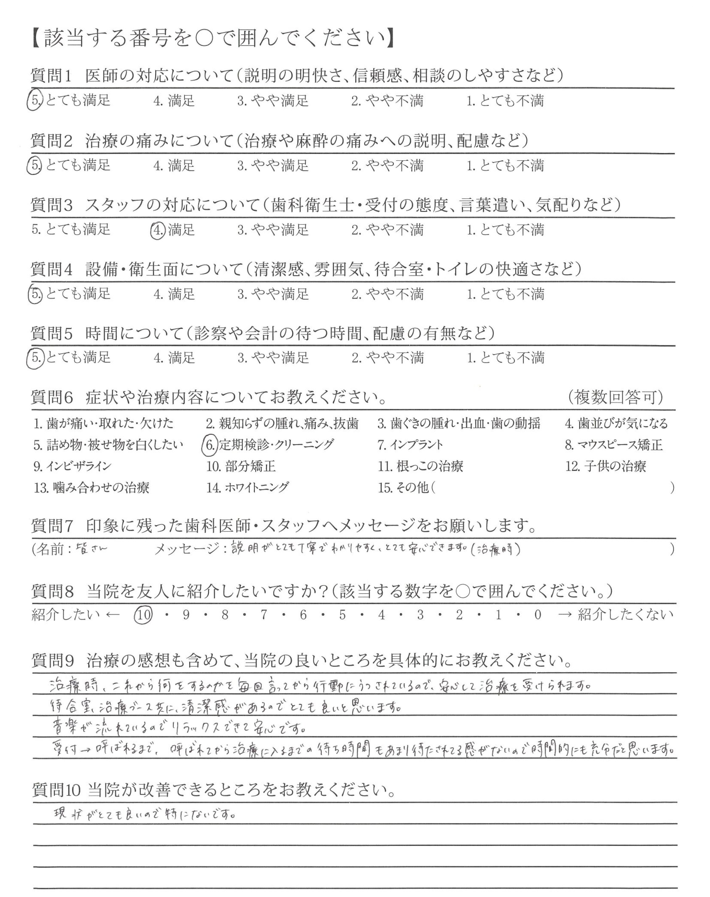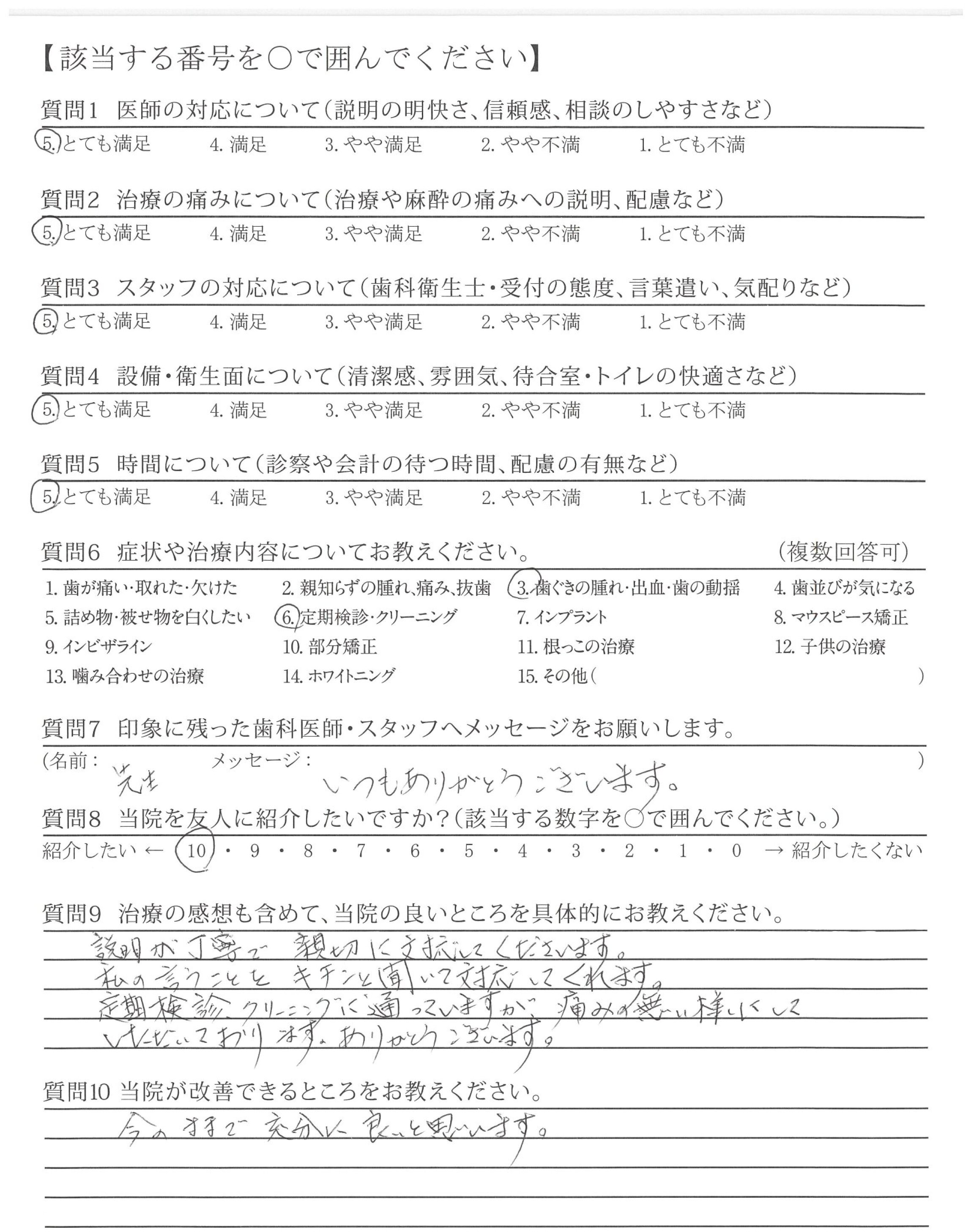 定期検診、クリーニングに通っていますが、痛みの無い様にしていただいております。ありがとうございます。