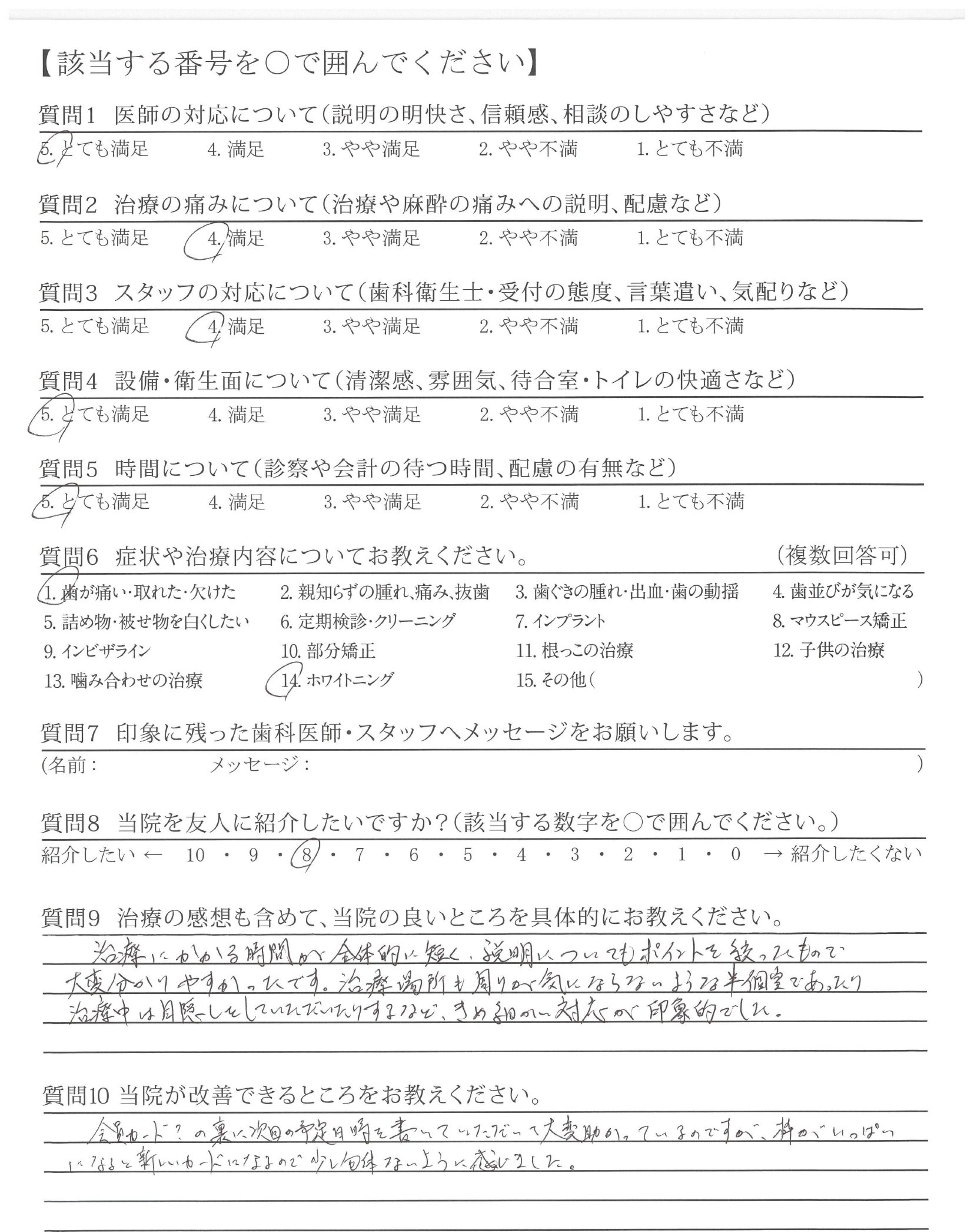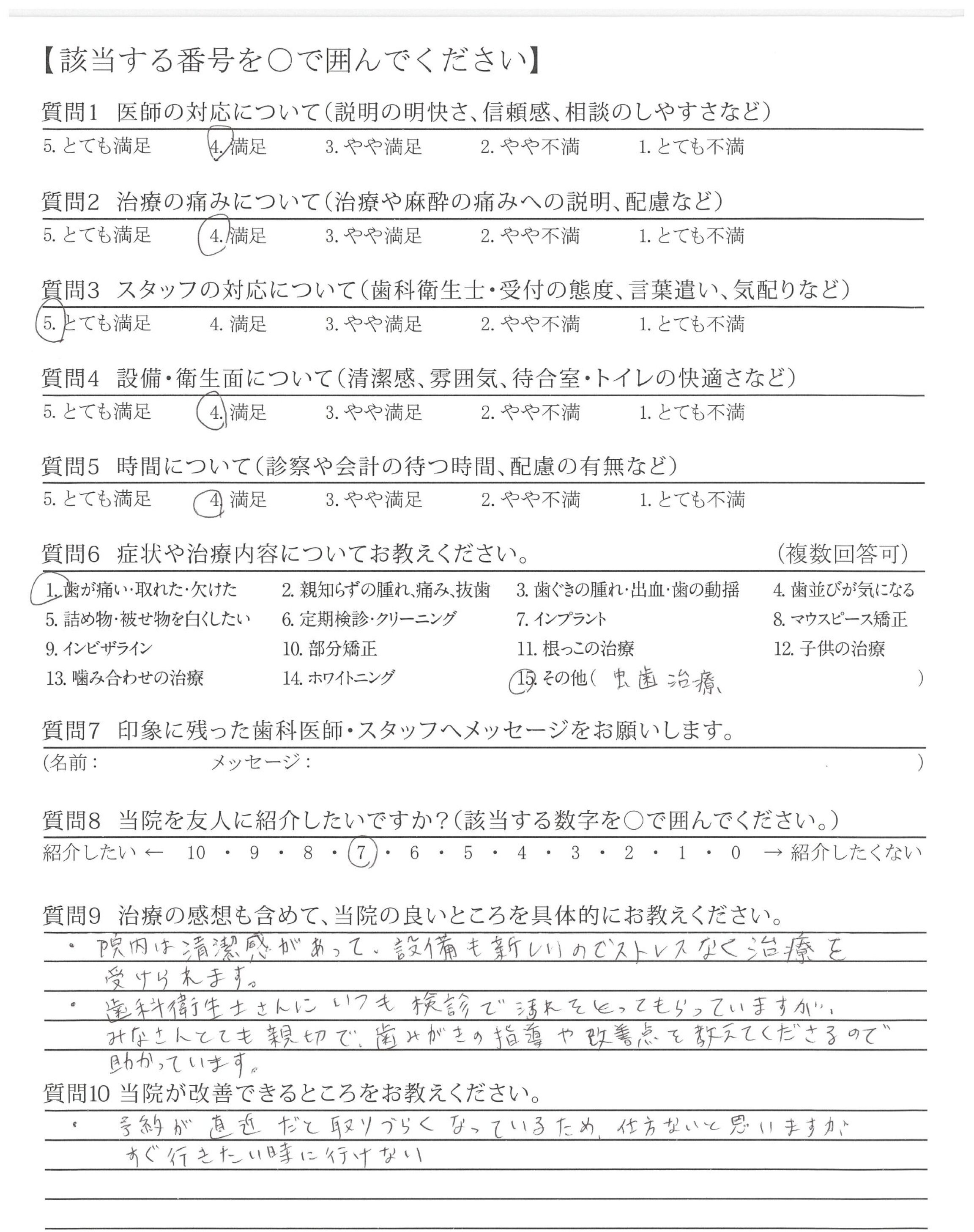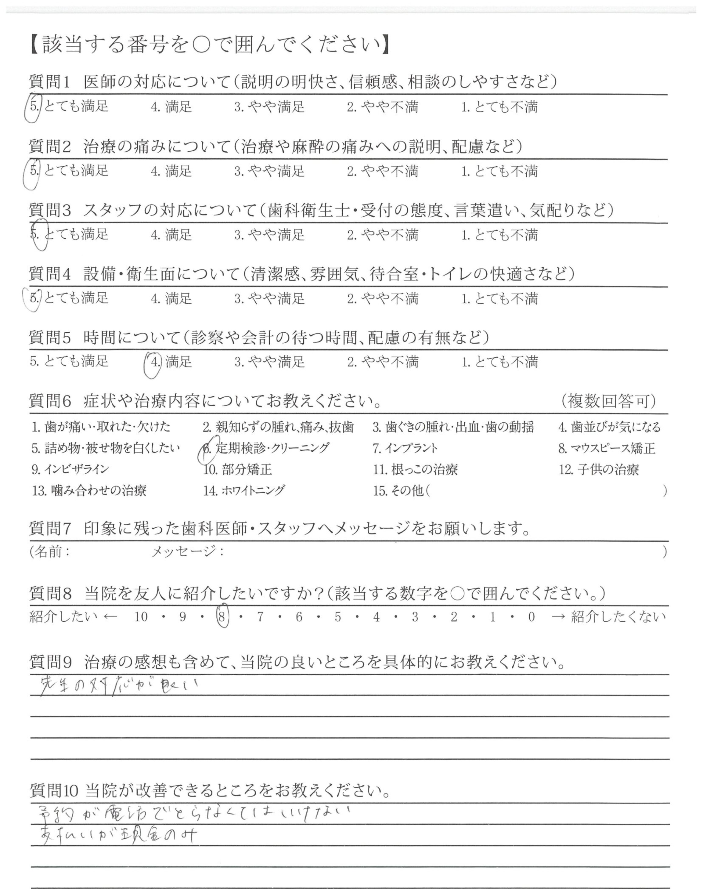 治療にかかる時間が全体的に短く、説明についてもポイントを絞ったもので大変分かりやすかったです。