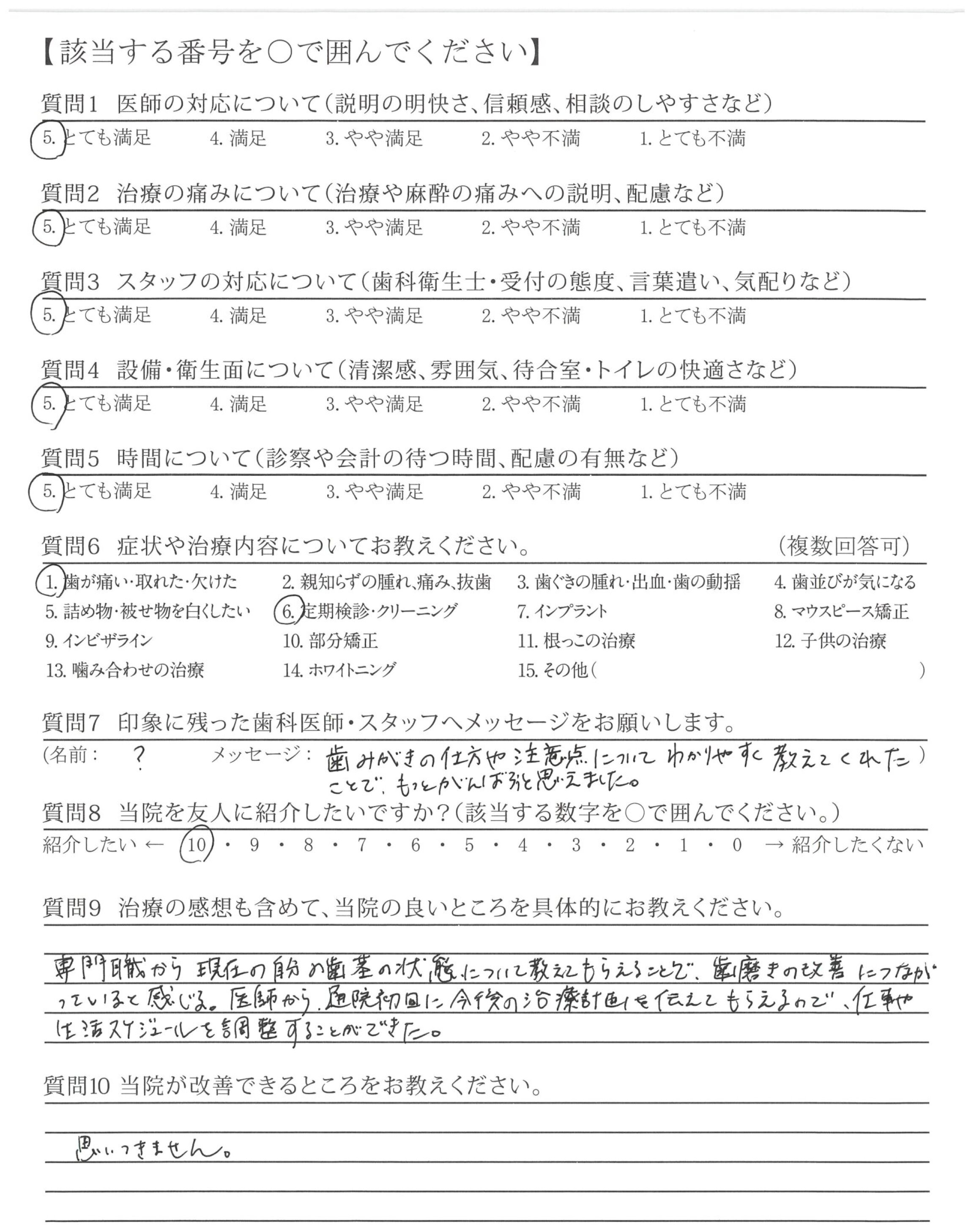 ・歯科衛生士さんにいつも検診で汚れをとってもらっていますが、みなさんとても親切で、歯みがきの指導や改善点を教えてくださるので助かっています。