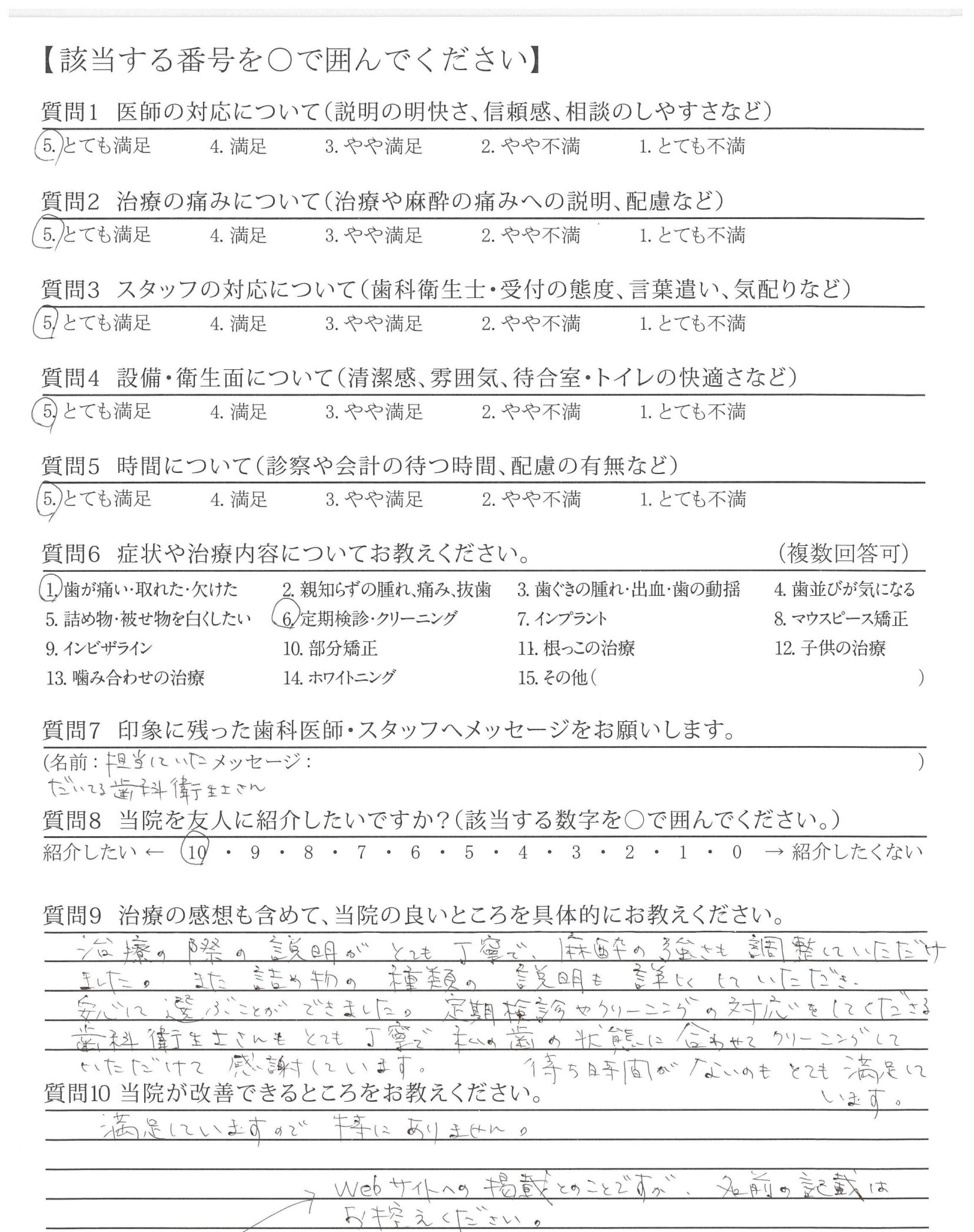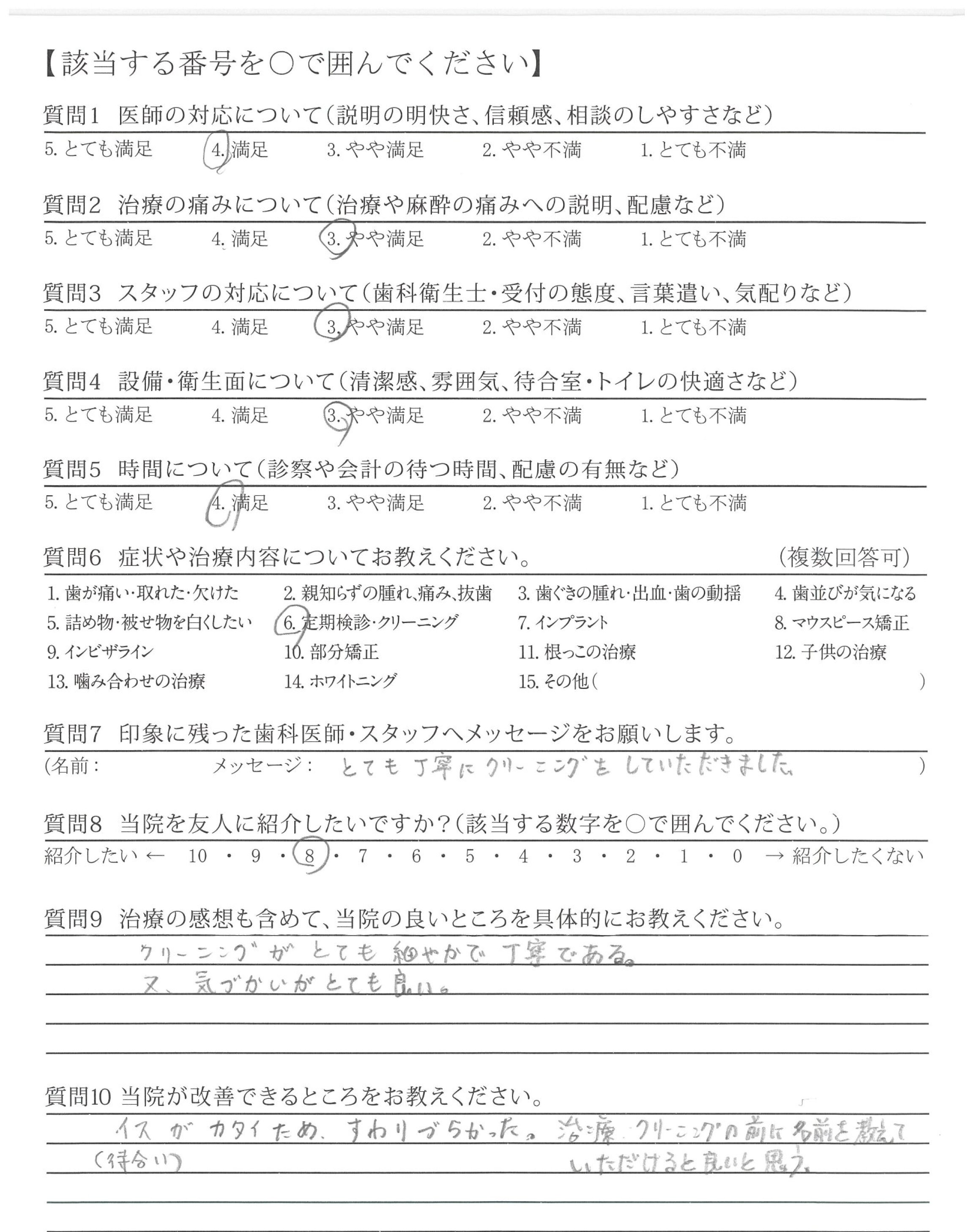 治療、クリーニングの前に名前を教えていただけると良いと思う。