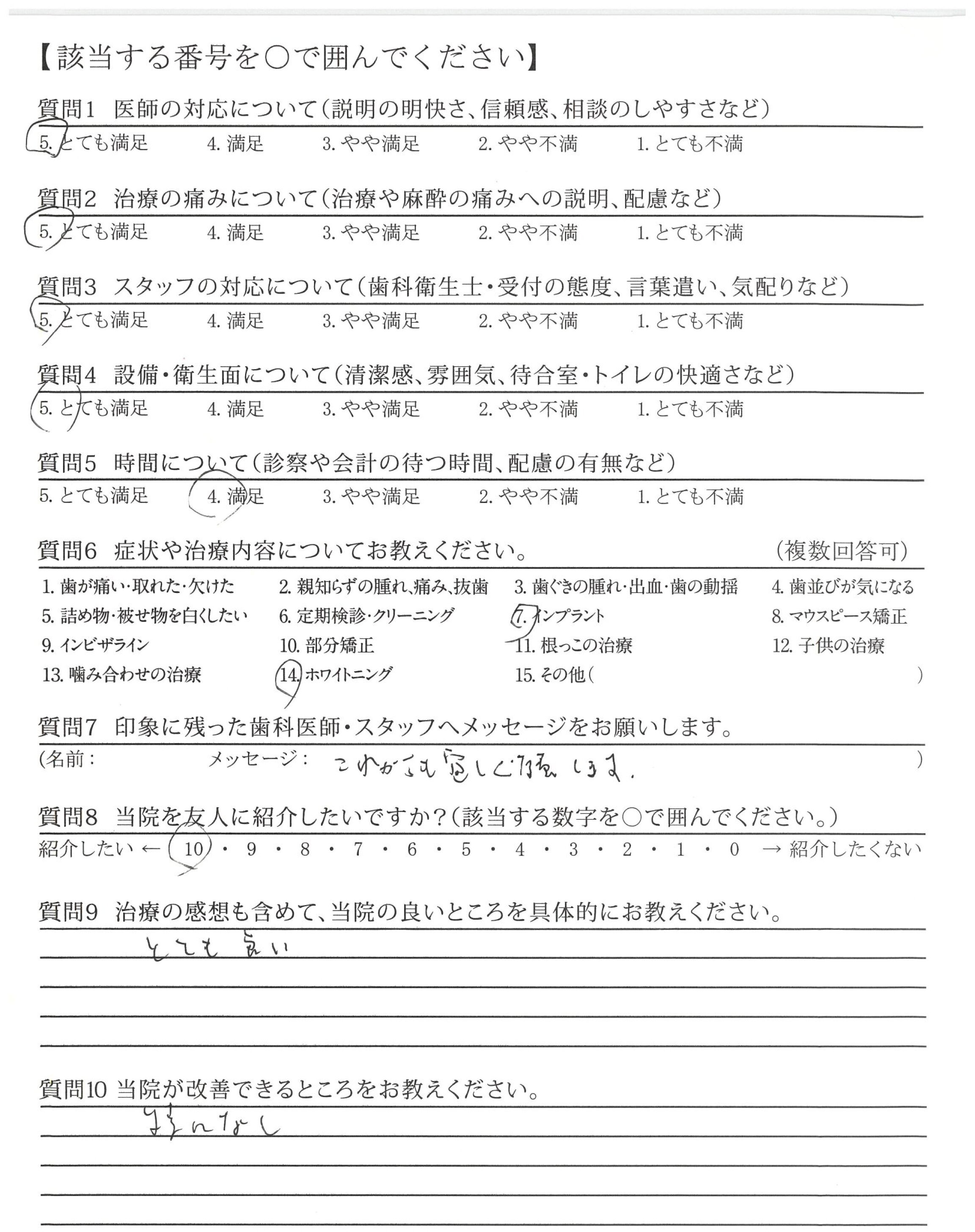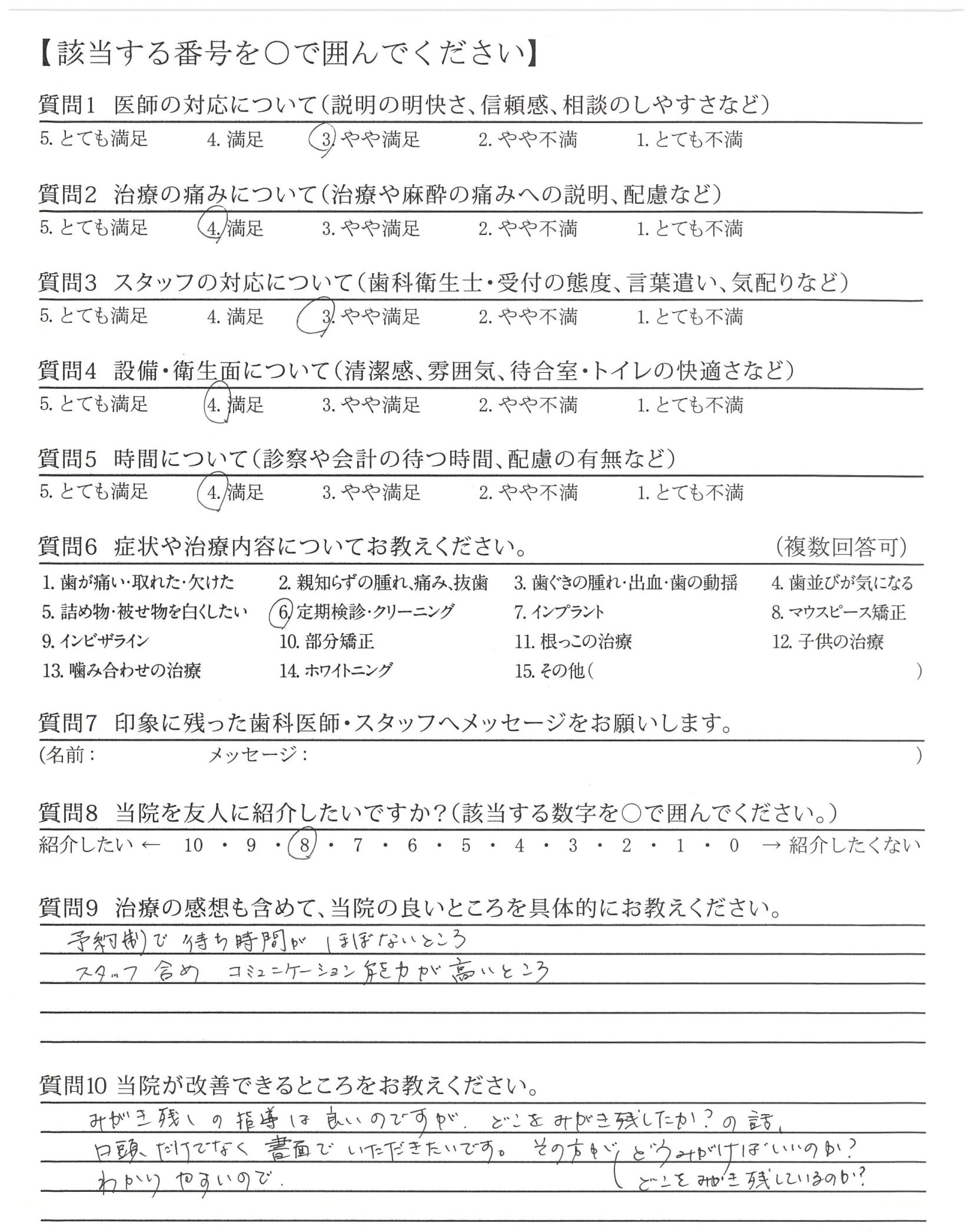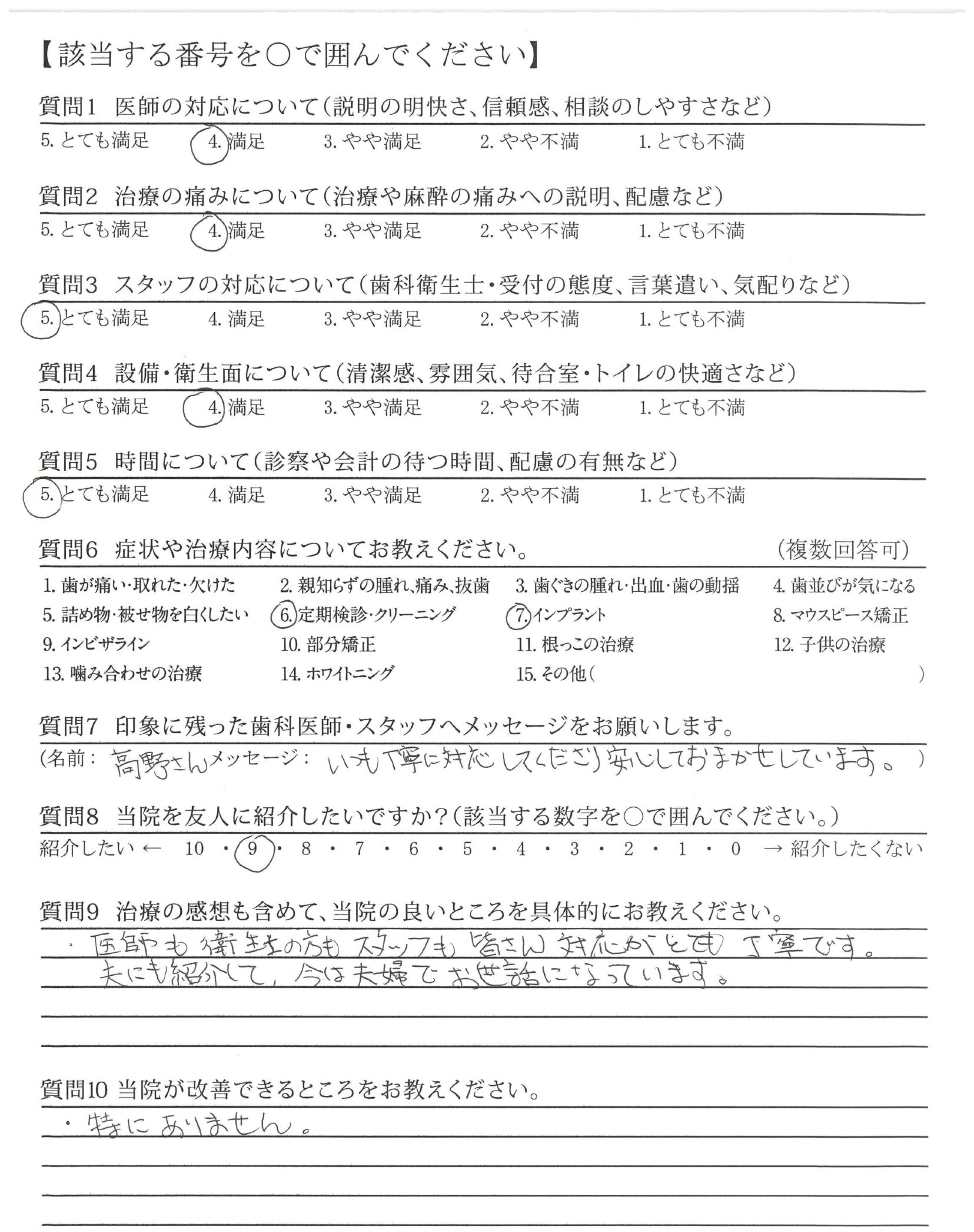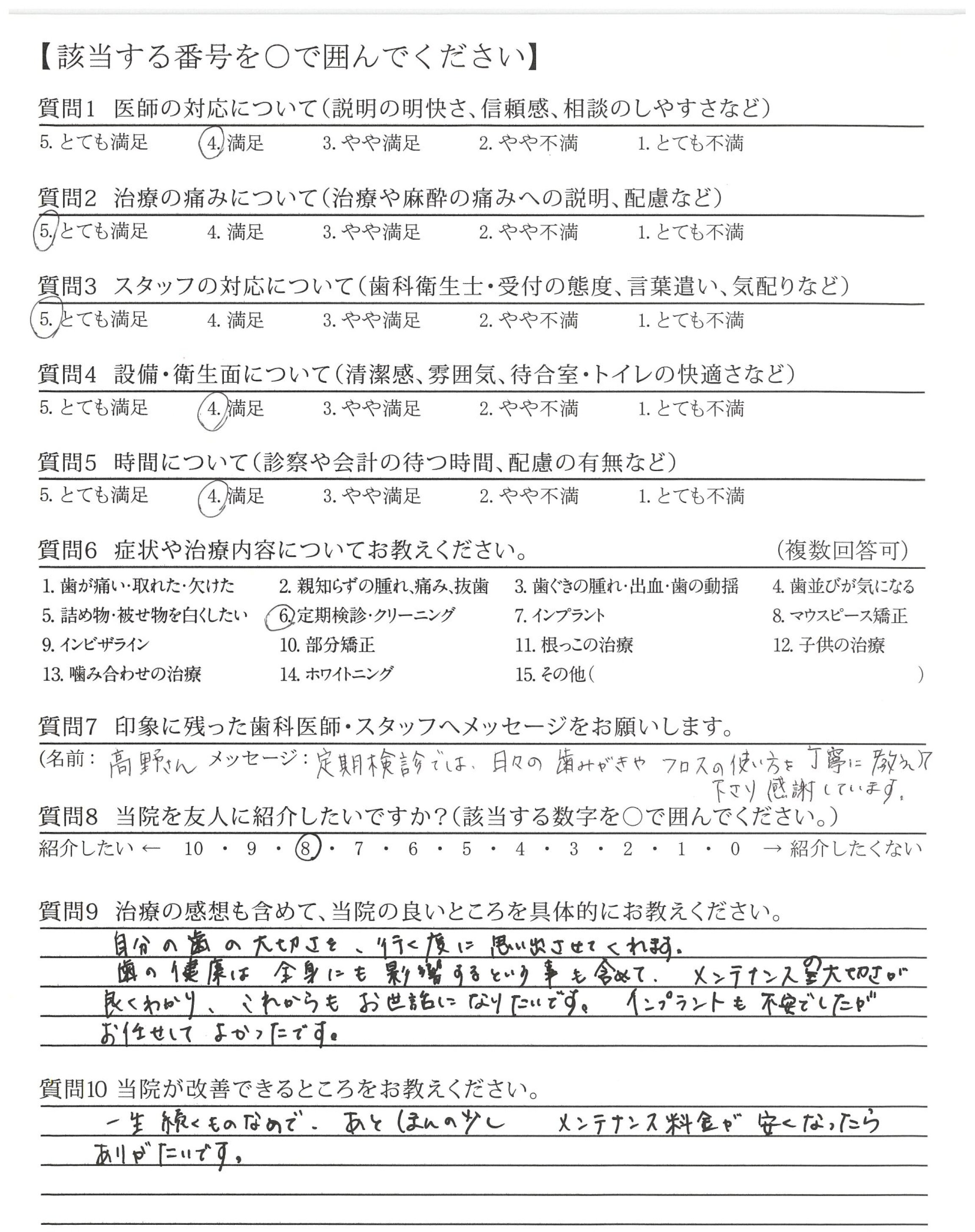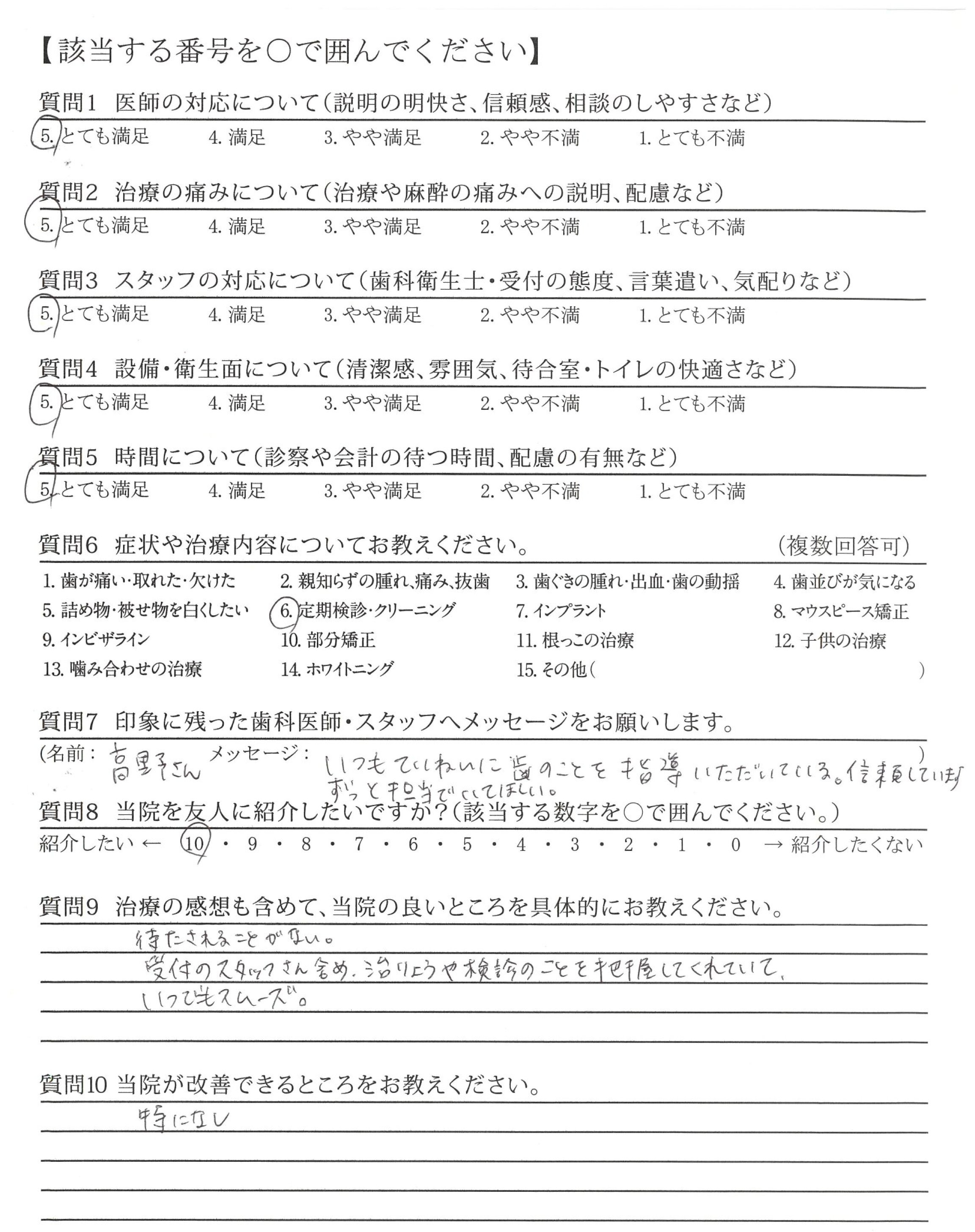 いつもていねいに歯のことを指導いただいている。信頼しています。ずっと担当でいてほしい。