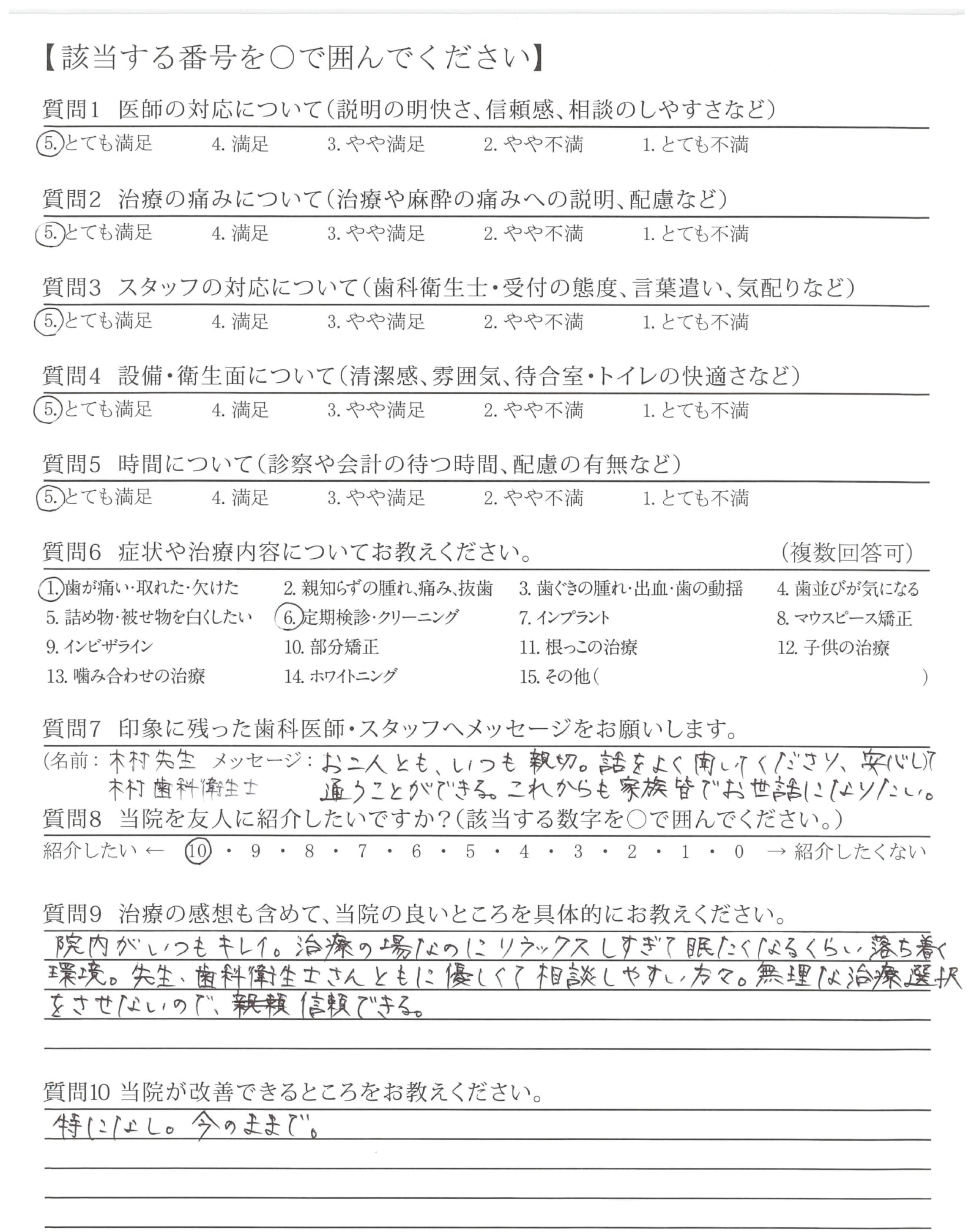 お二人とも、いつも親切。話をよく聞いてくださり、安心して通うことができる。これからも家族皆でお世話になりたい。