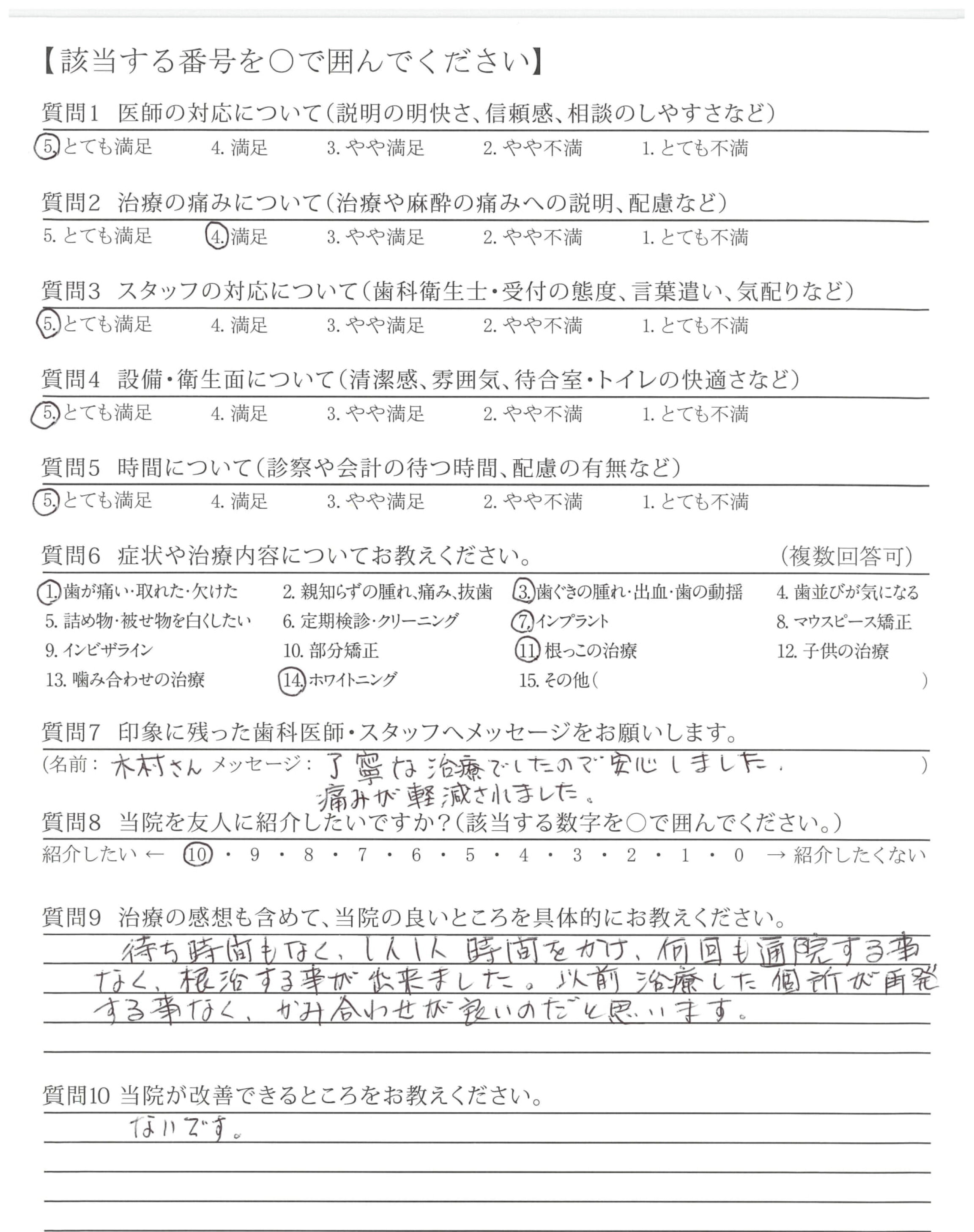 待ち時間もなく、1人1人時間をかけ、何回も通院する事なく、根治する事が出来ました。