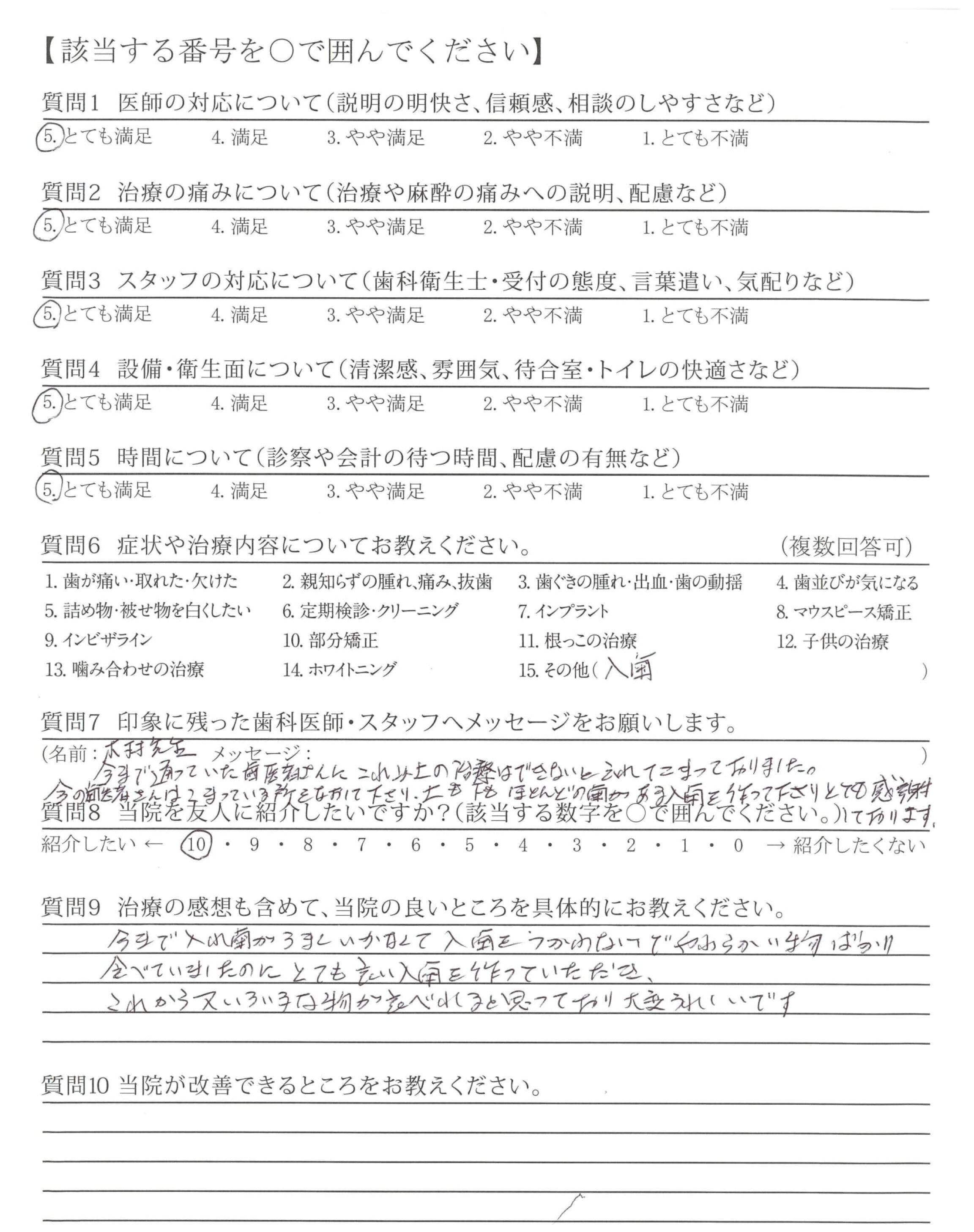 今まで入れ歯がうまくいかなくて入歯をつかわないでやわらかい物ばかり食べていましたのにとても良い入歯を作っていただき、これから又いろいろな物が食べれると思っており大変うれしいです