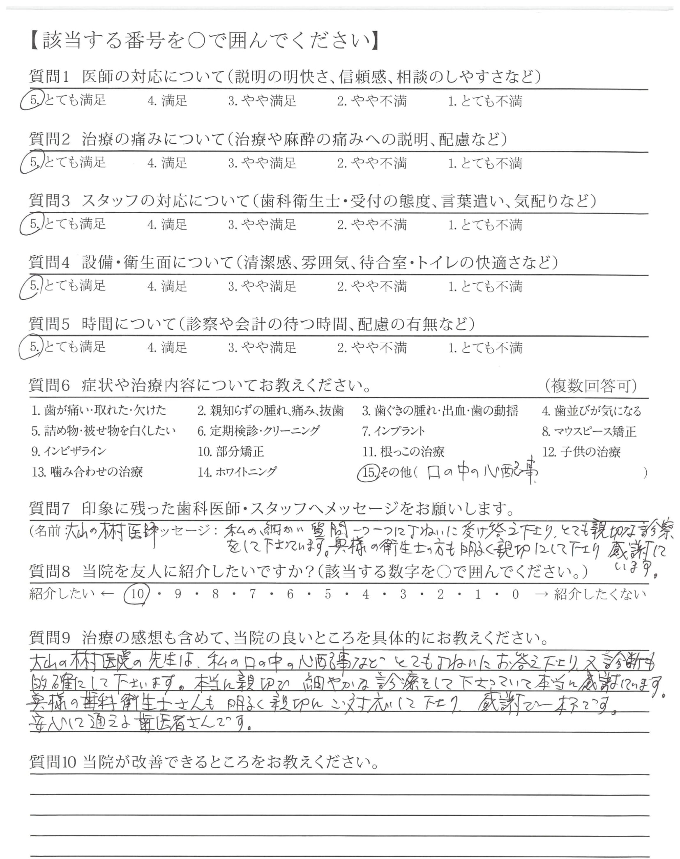 医院が家から近い上、どんな小さい事でも電話でお願いしますと、先生の時間のゆるす最短の時間で診察して頂けますので、とっても助かって居ります。食べ物を、かみしめる時は、先生に感謝致して居ります。