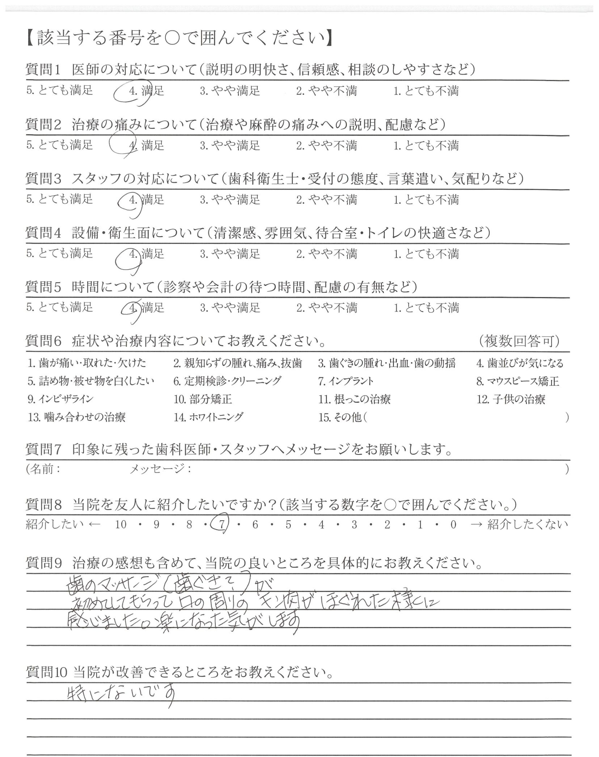 歯のマッサージ(歯ぐき?)が初めてしてもらって口の周りのキン肉がほぐれた様に感じました。楽になった気がします