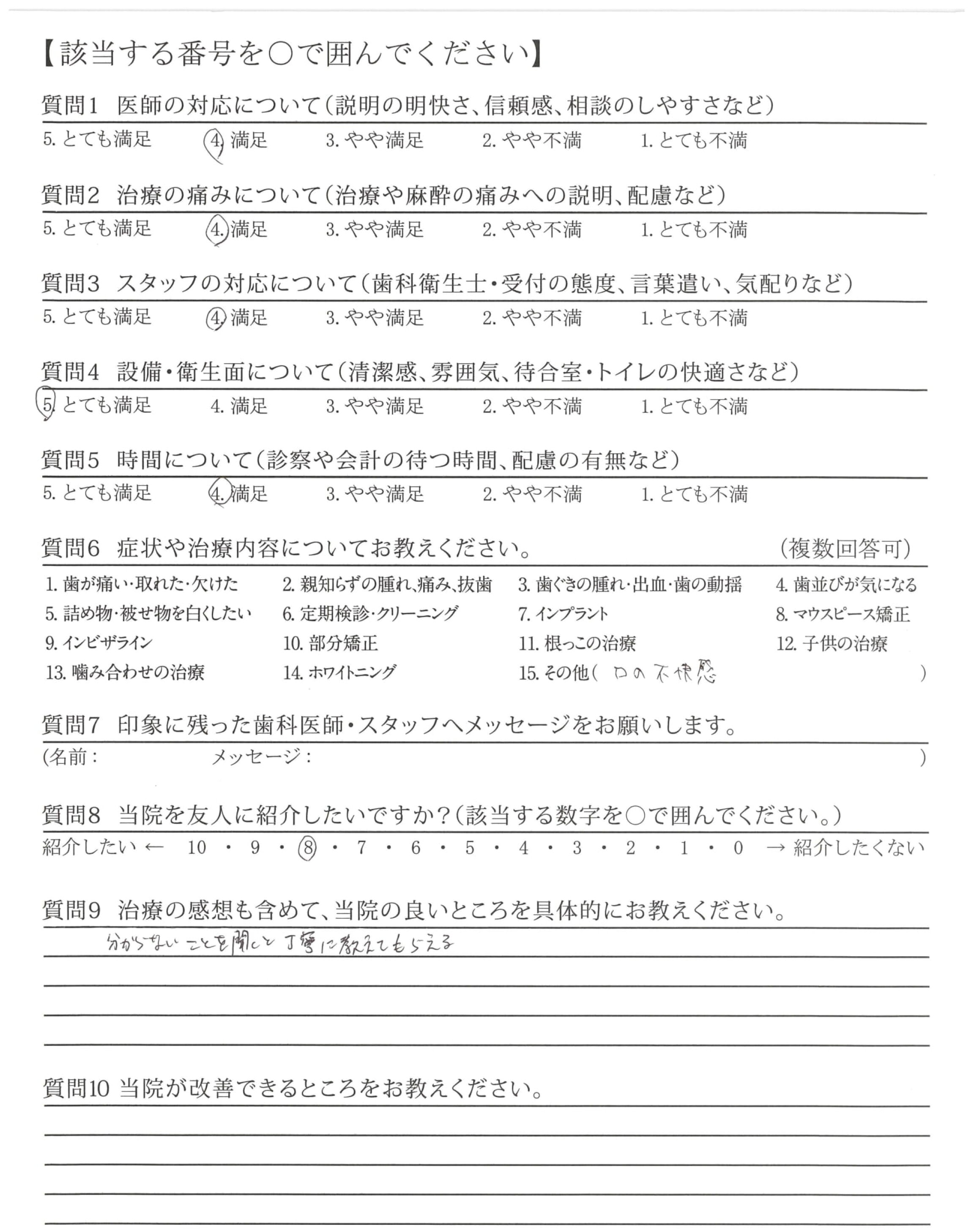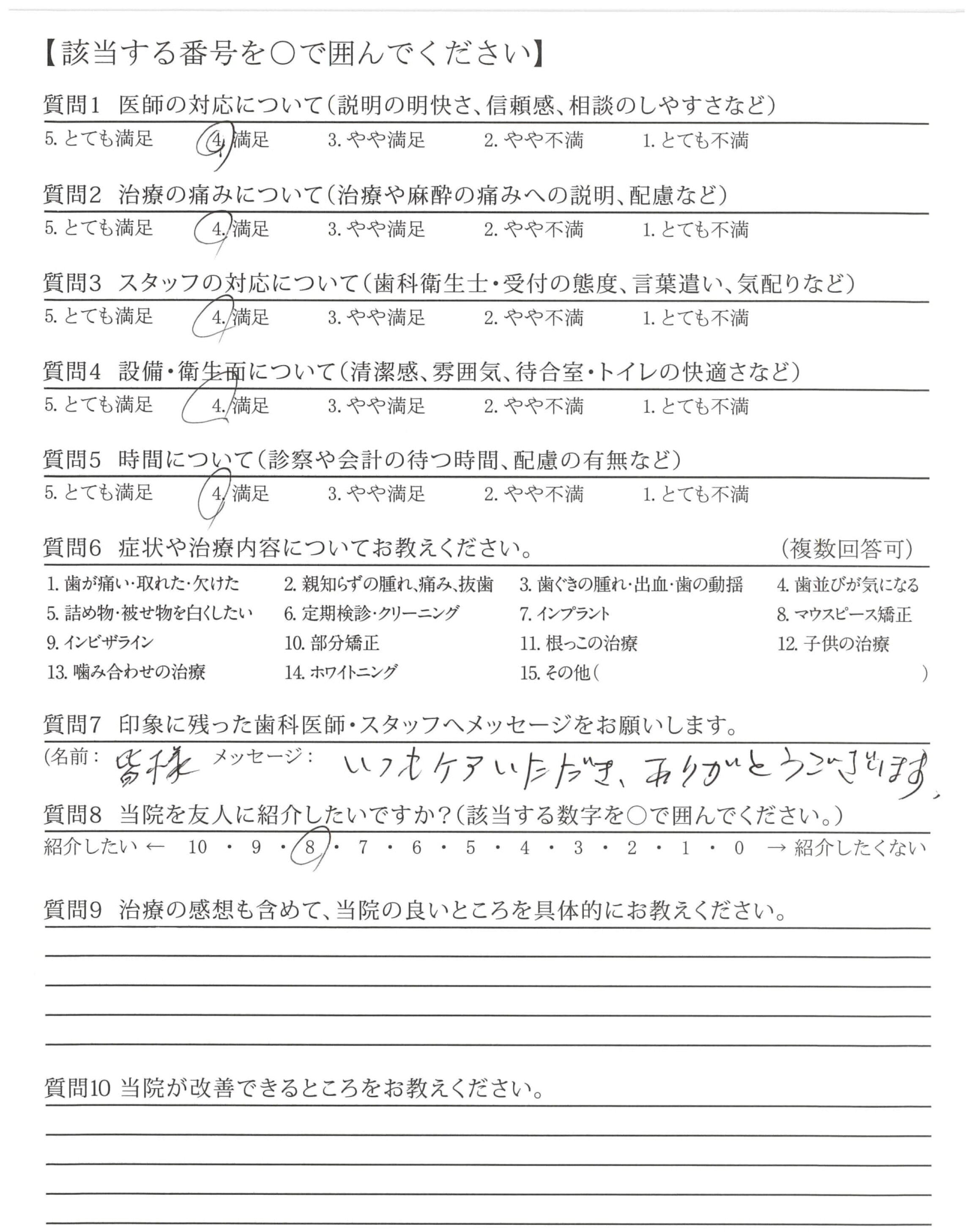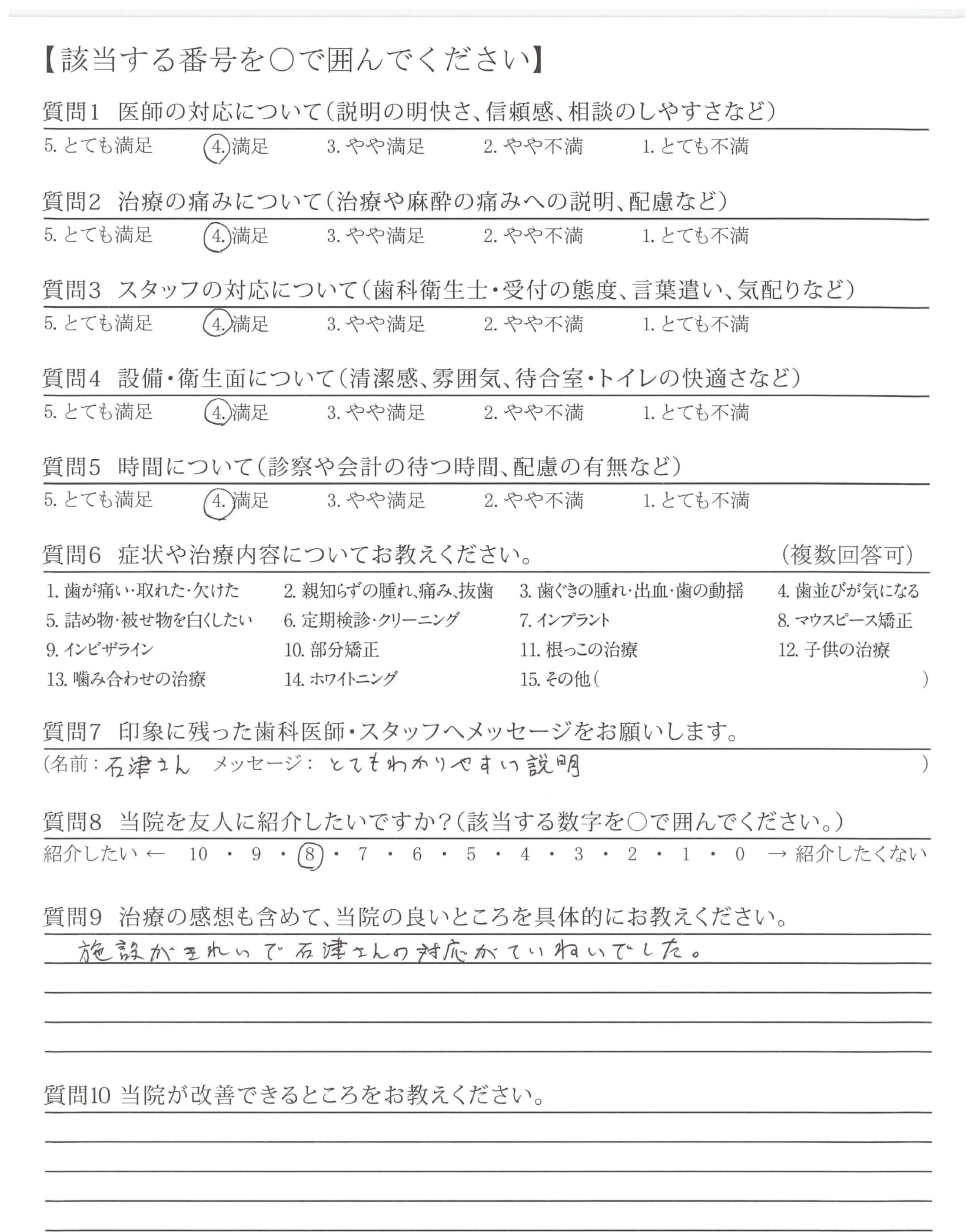 院長先生の治療のおかげで以前何度も問題があったかぶせものもこちらで治療して頂いてから歯の調子が良くなりました。石津さんには定期的にクリーニングをして頂き、丁寧で手際良くしてもらっており、感謝しています。今後もよろしくお願いします。