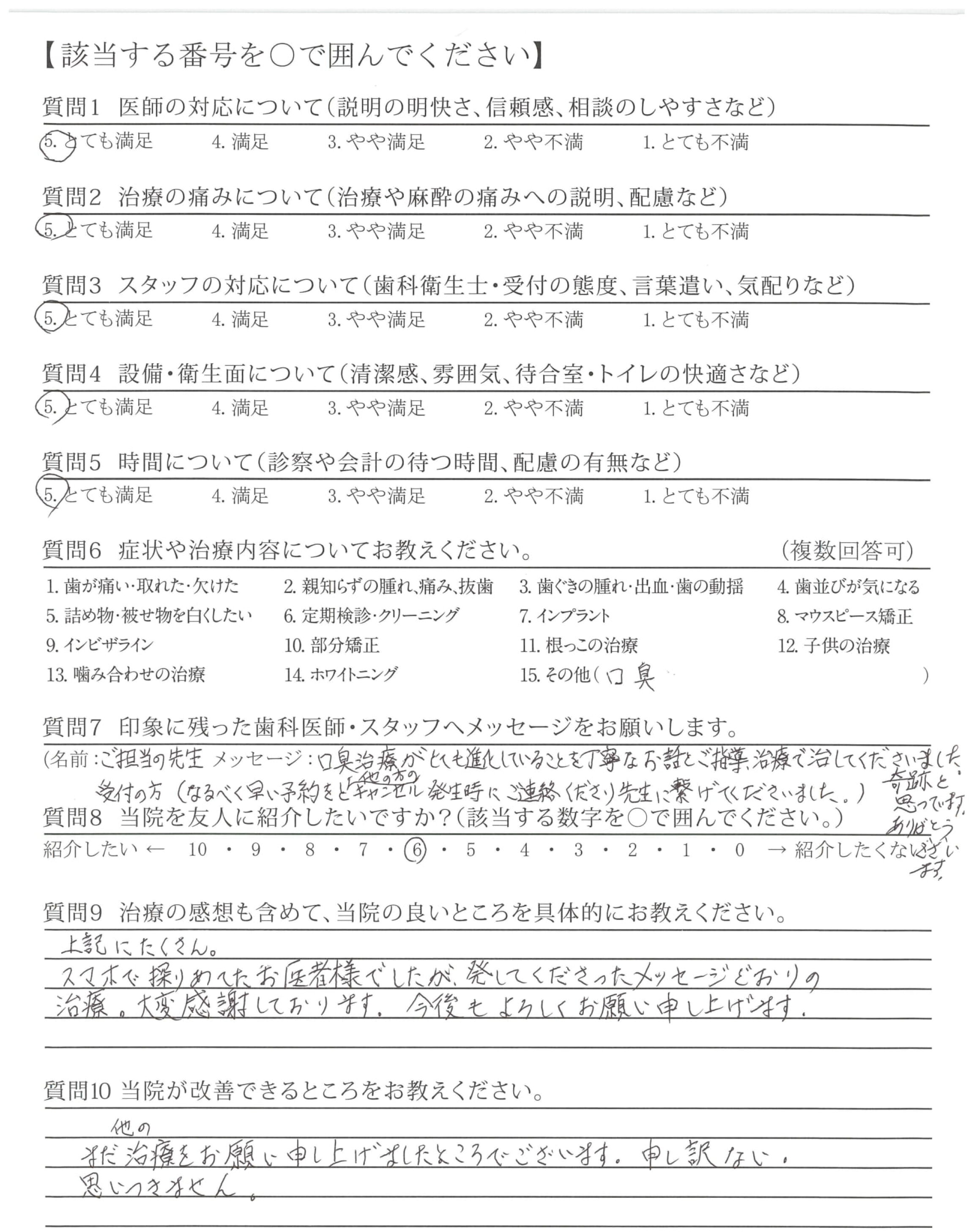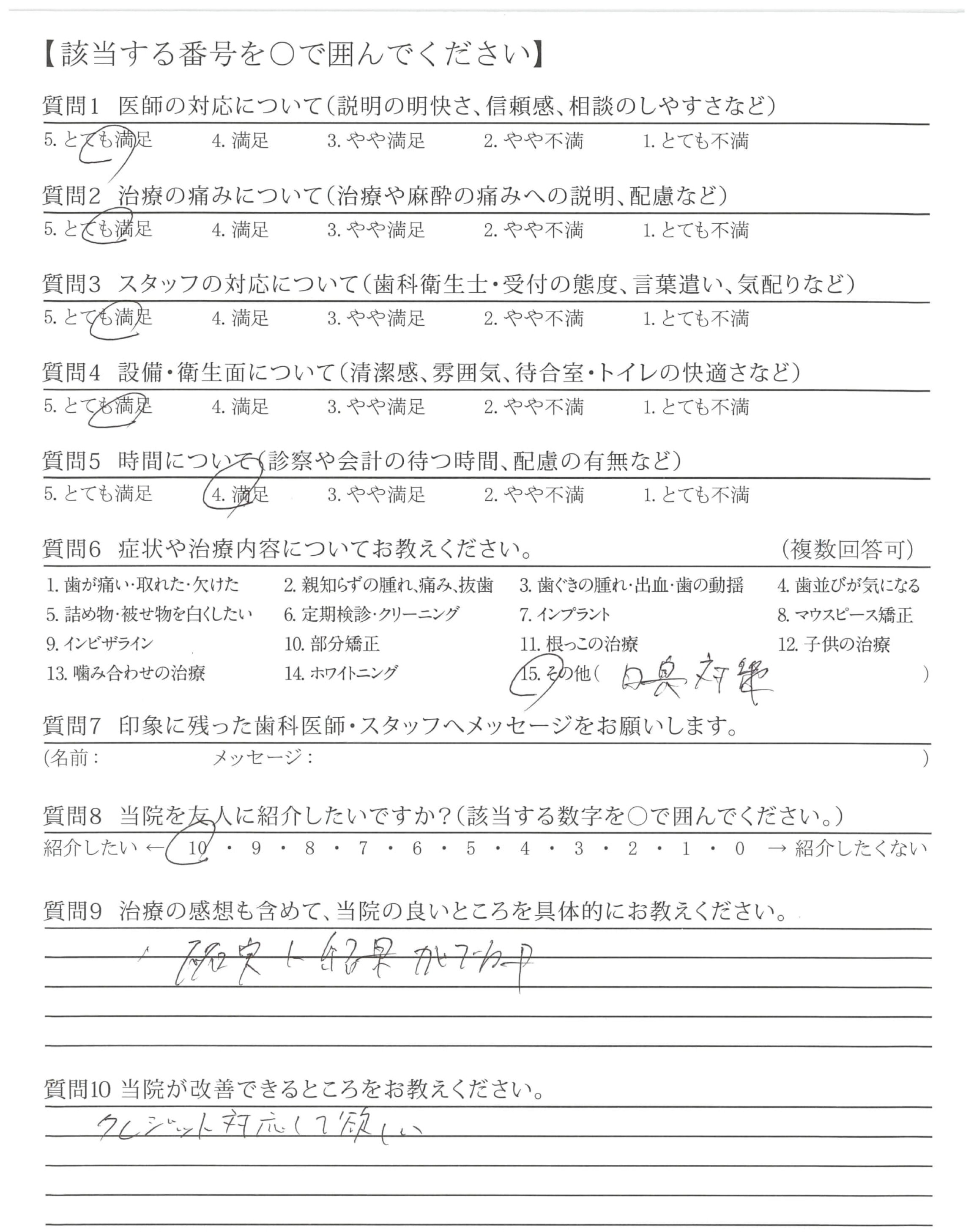 口臭治療がとても進化していることを丁寧なお話とご指導、治療で治してくださいました。奇跡と思っています。ありがとうございます。