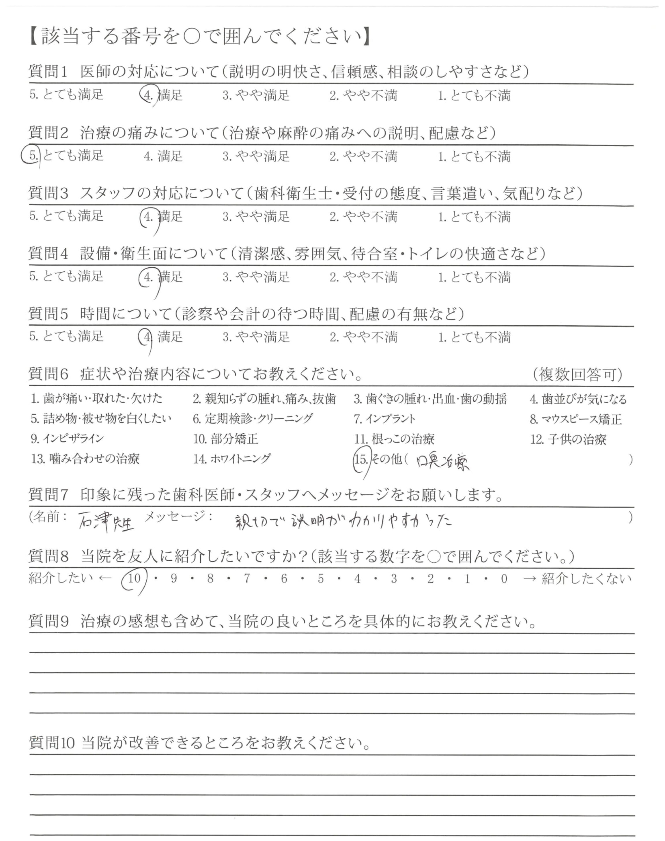衛生士さんも受付の方も明るくて親切でした。症状も改善して満足です。