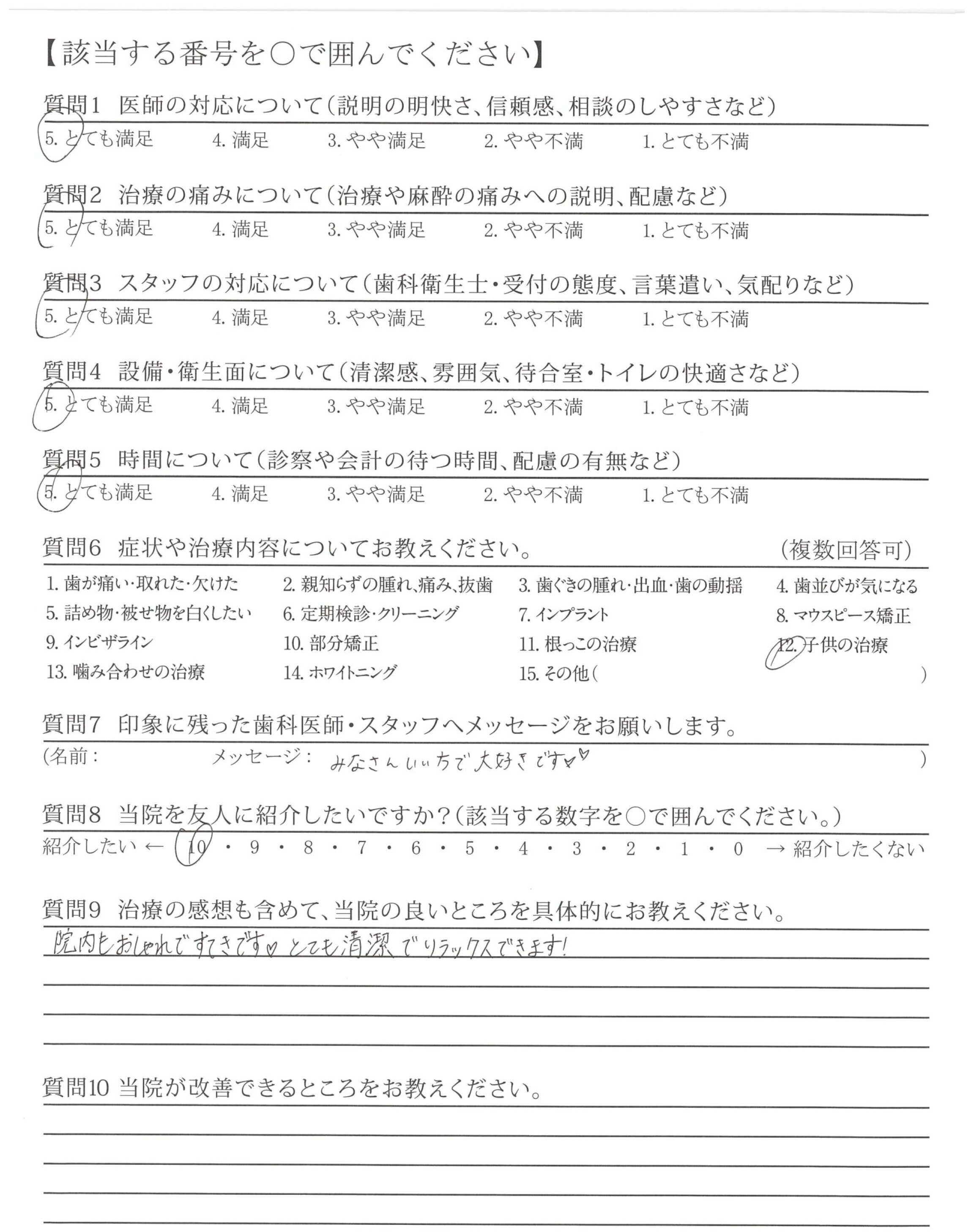 現在、子供も通院しており、先生だけでなく衛生士の方も優しく、わかりやすく接して頂き、子供も安心していますし、理解もしていて、自宅での歯磨きも率先してやってくれるので助かっています。