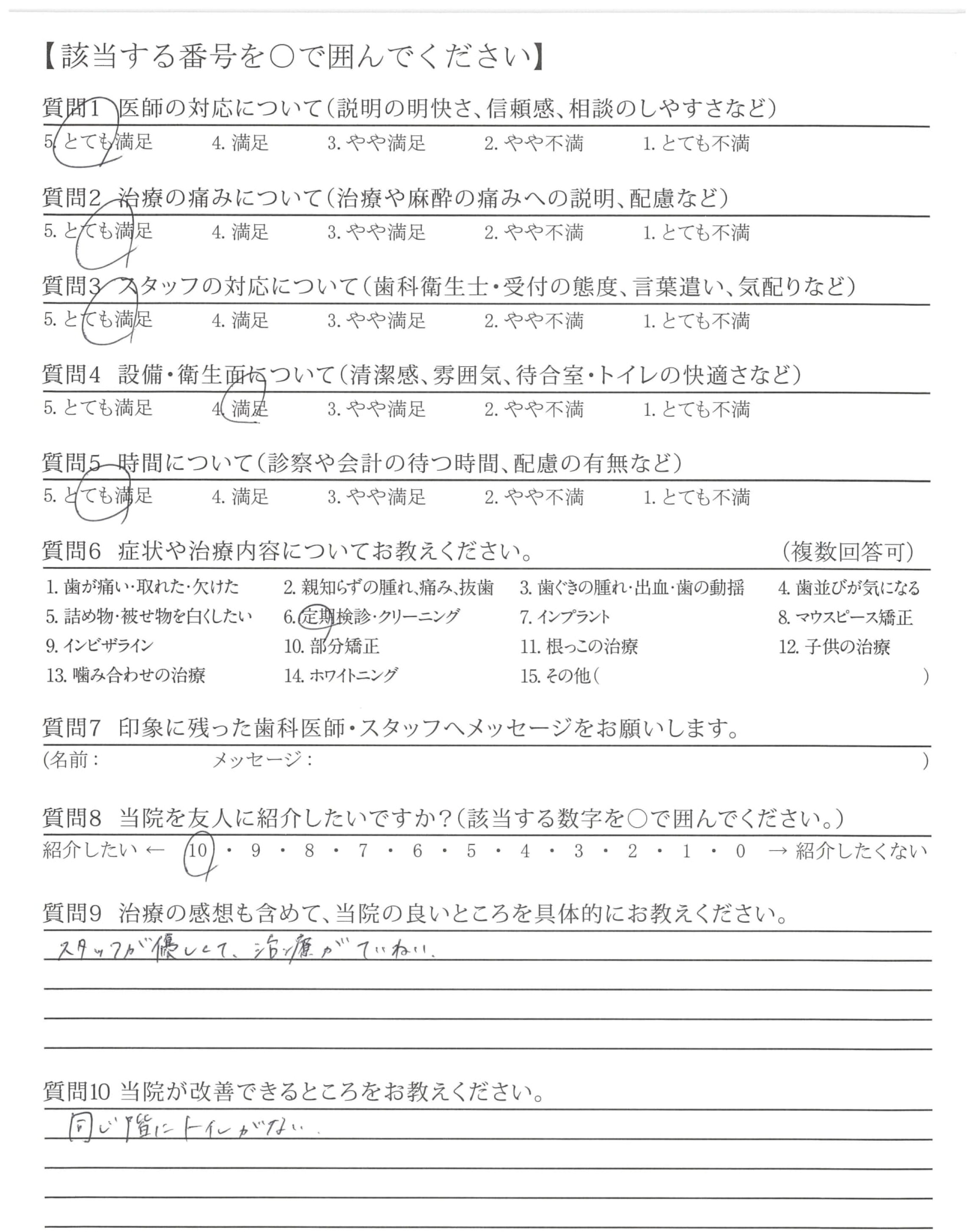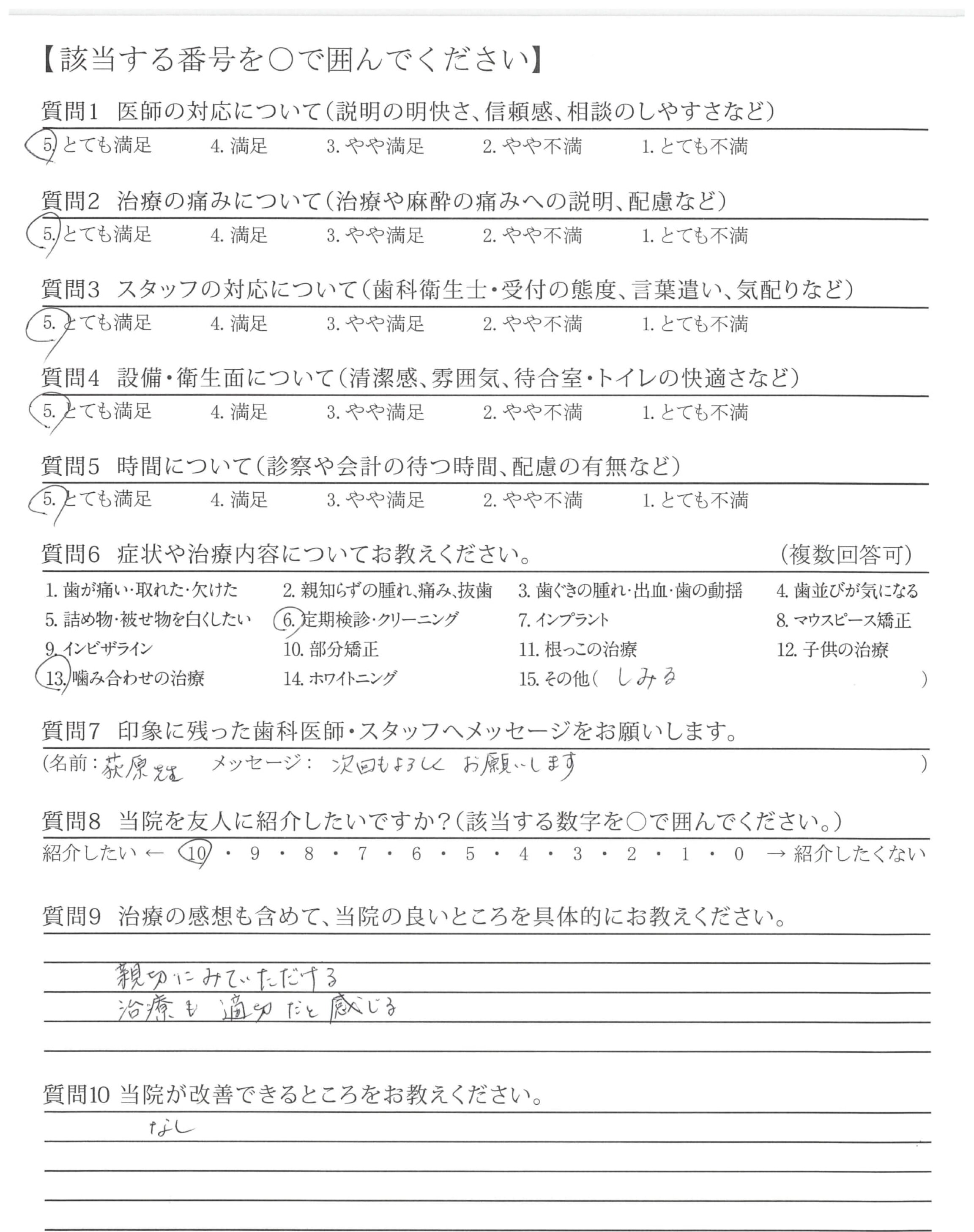 いつも丁寧に説明と対応をしてくれて安心して治療・検診が受けられています。ありがとうございます。