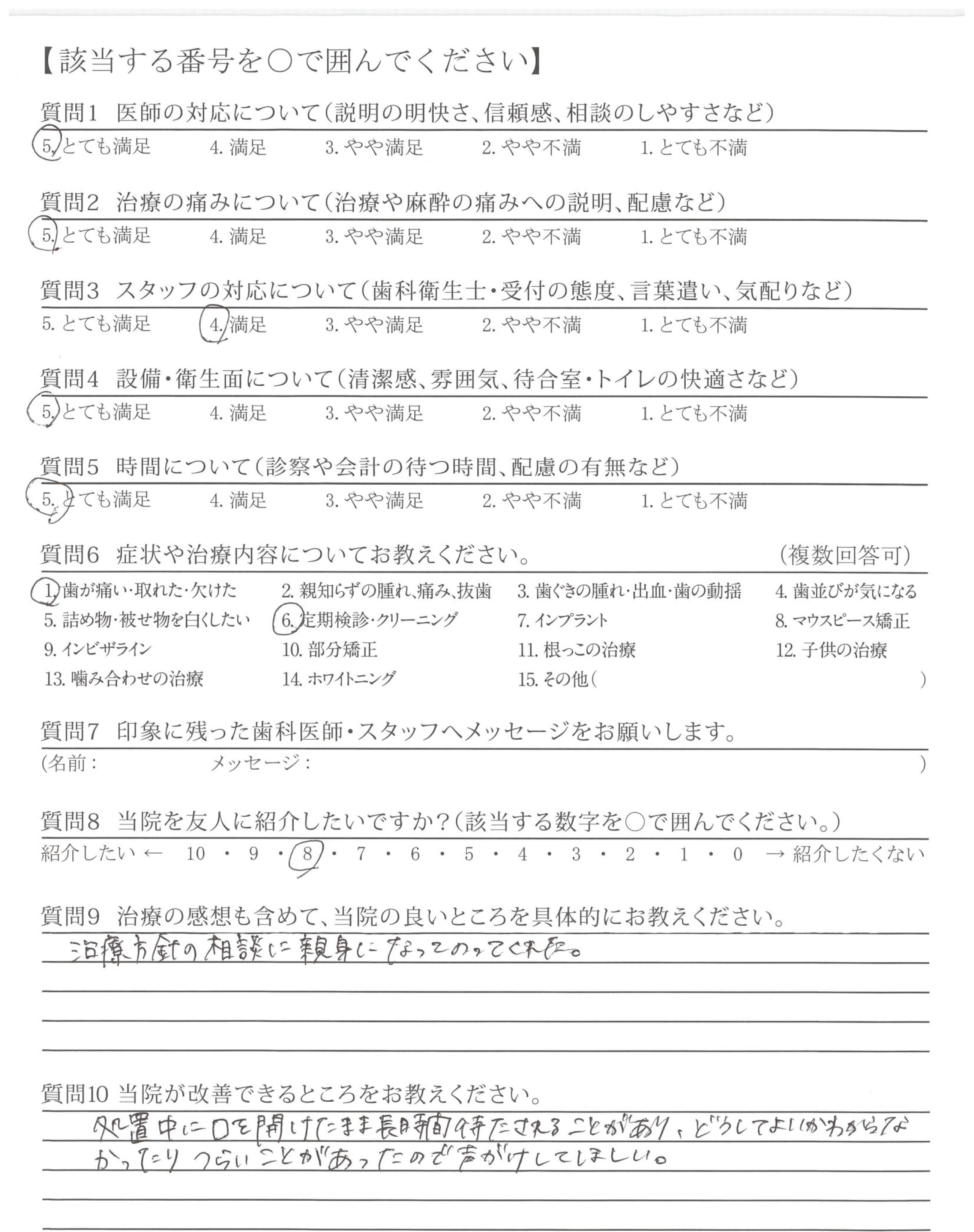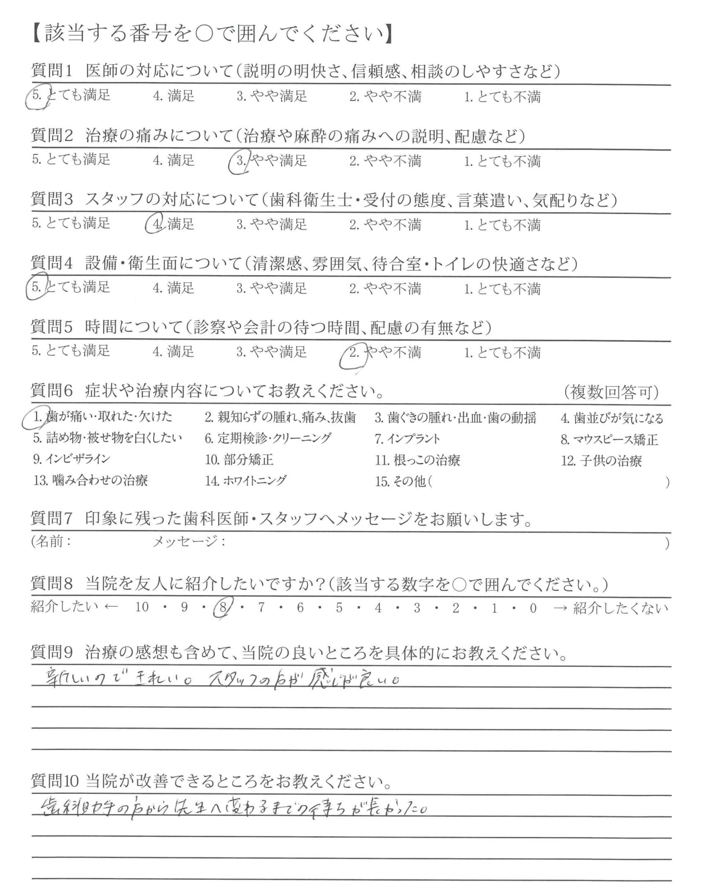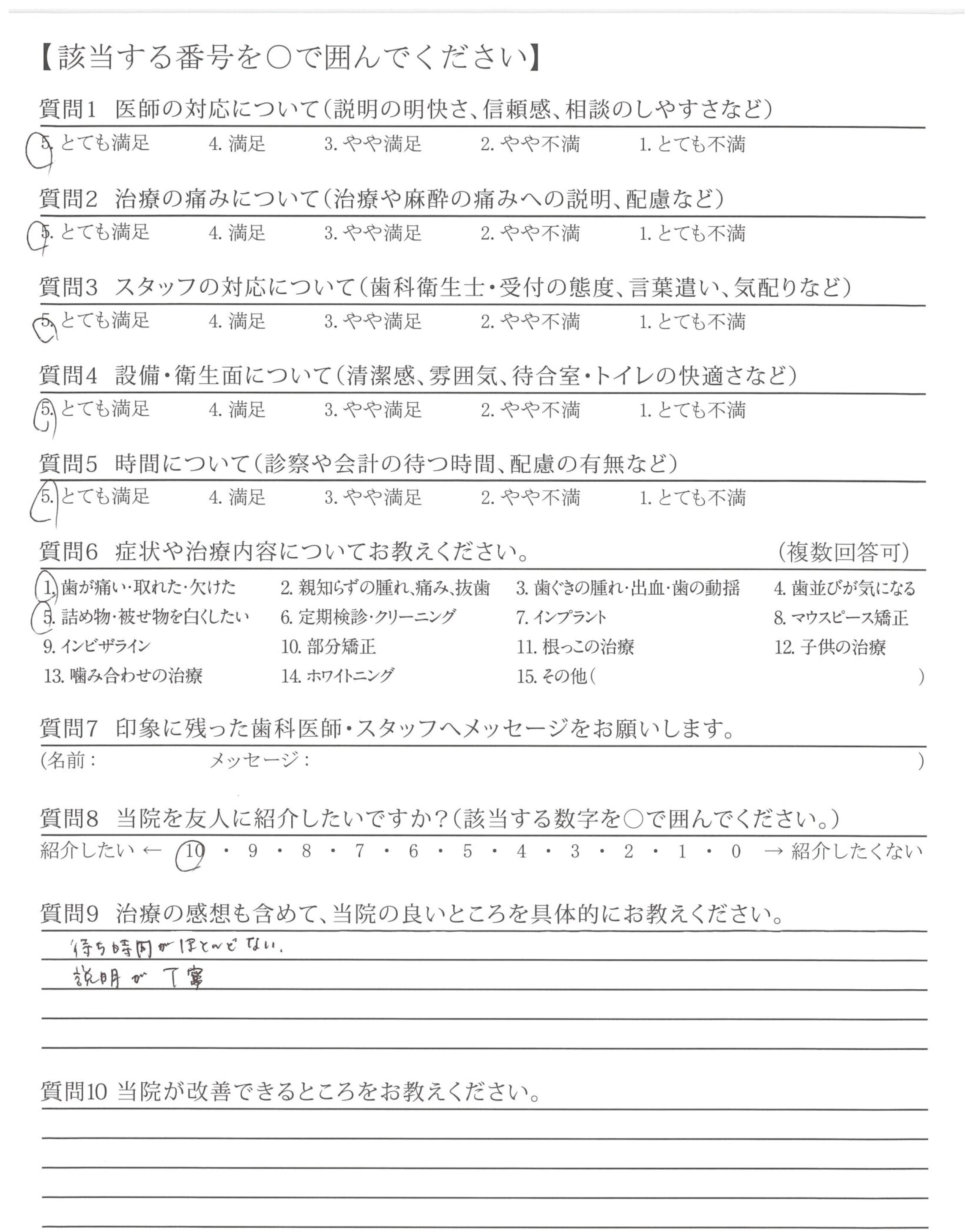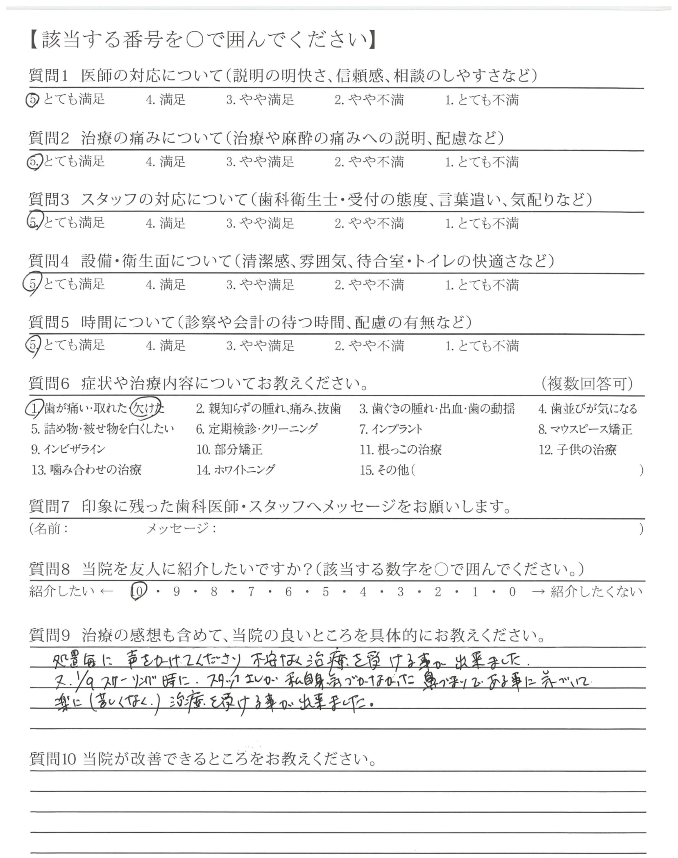 質問「医師の対応」「治療の痛み」「スタッフの対応」「設備・衛生面」「時間」ついてで「とても満足」と示した通り、悪い所を探す方が難しい程、よい医院です。