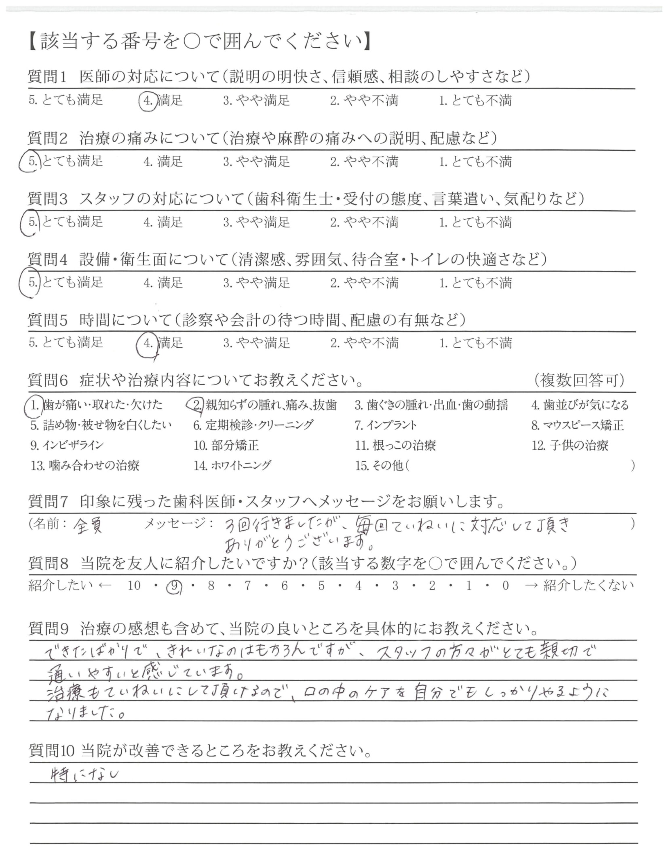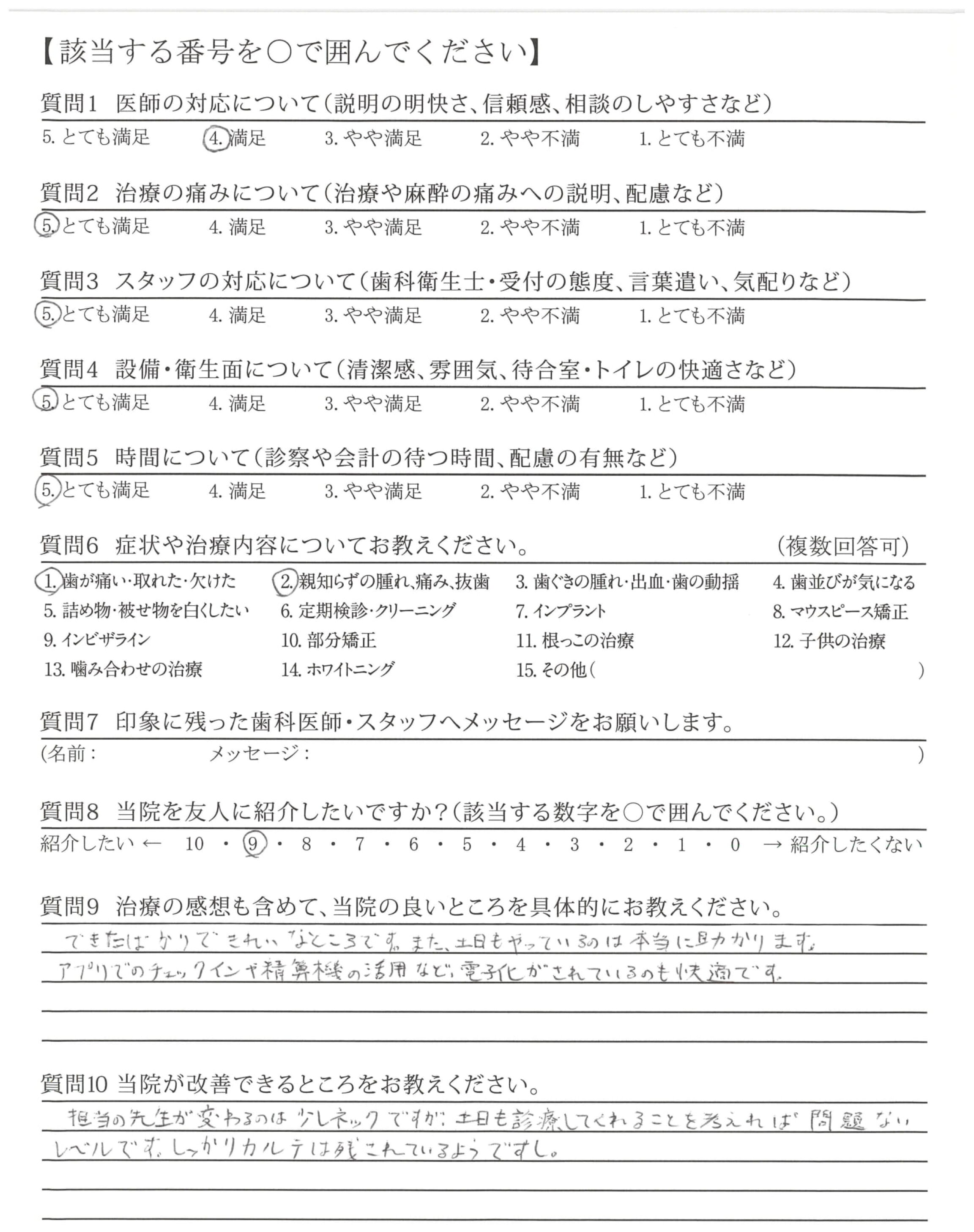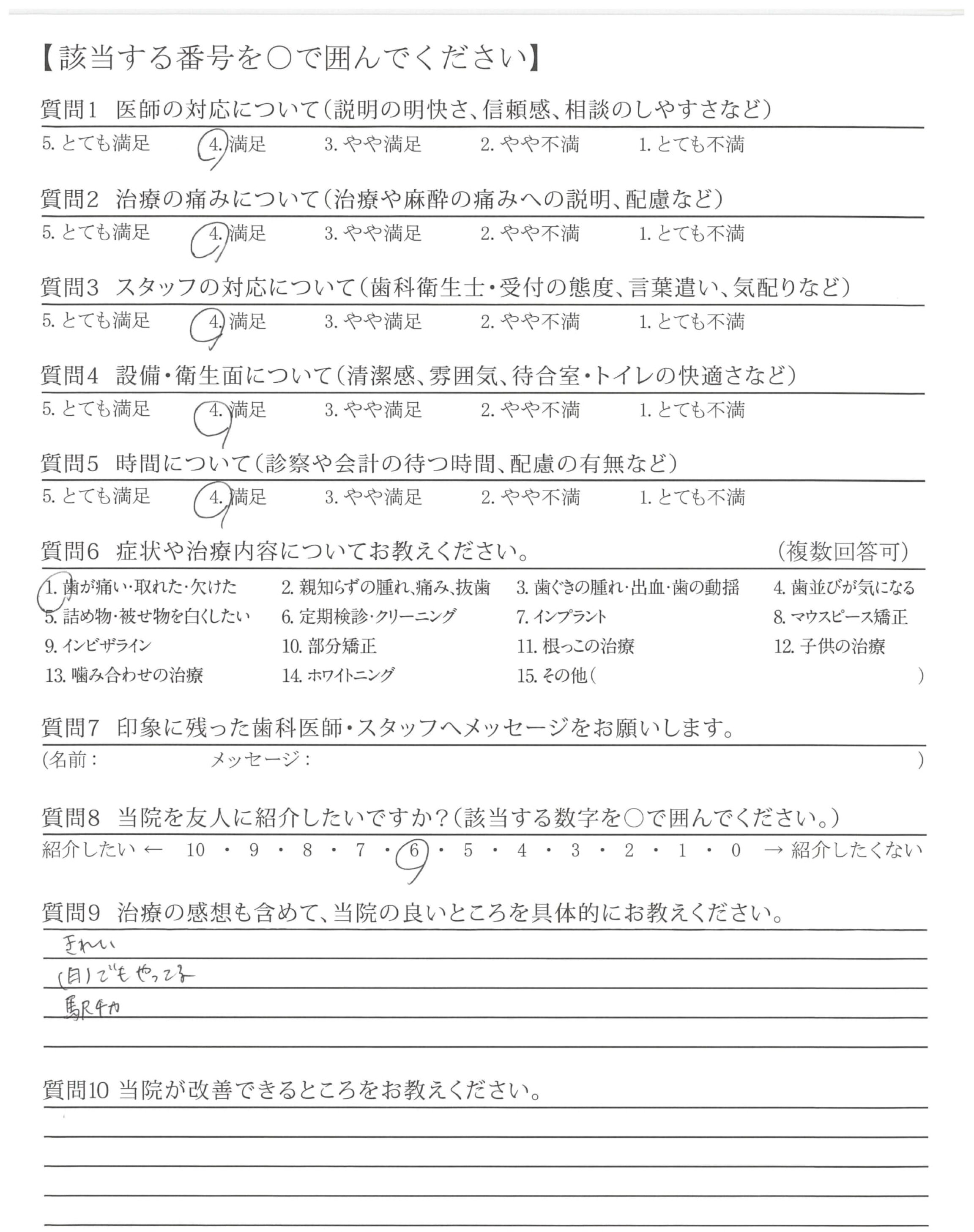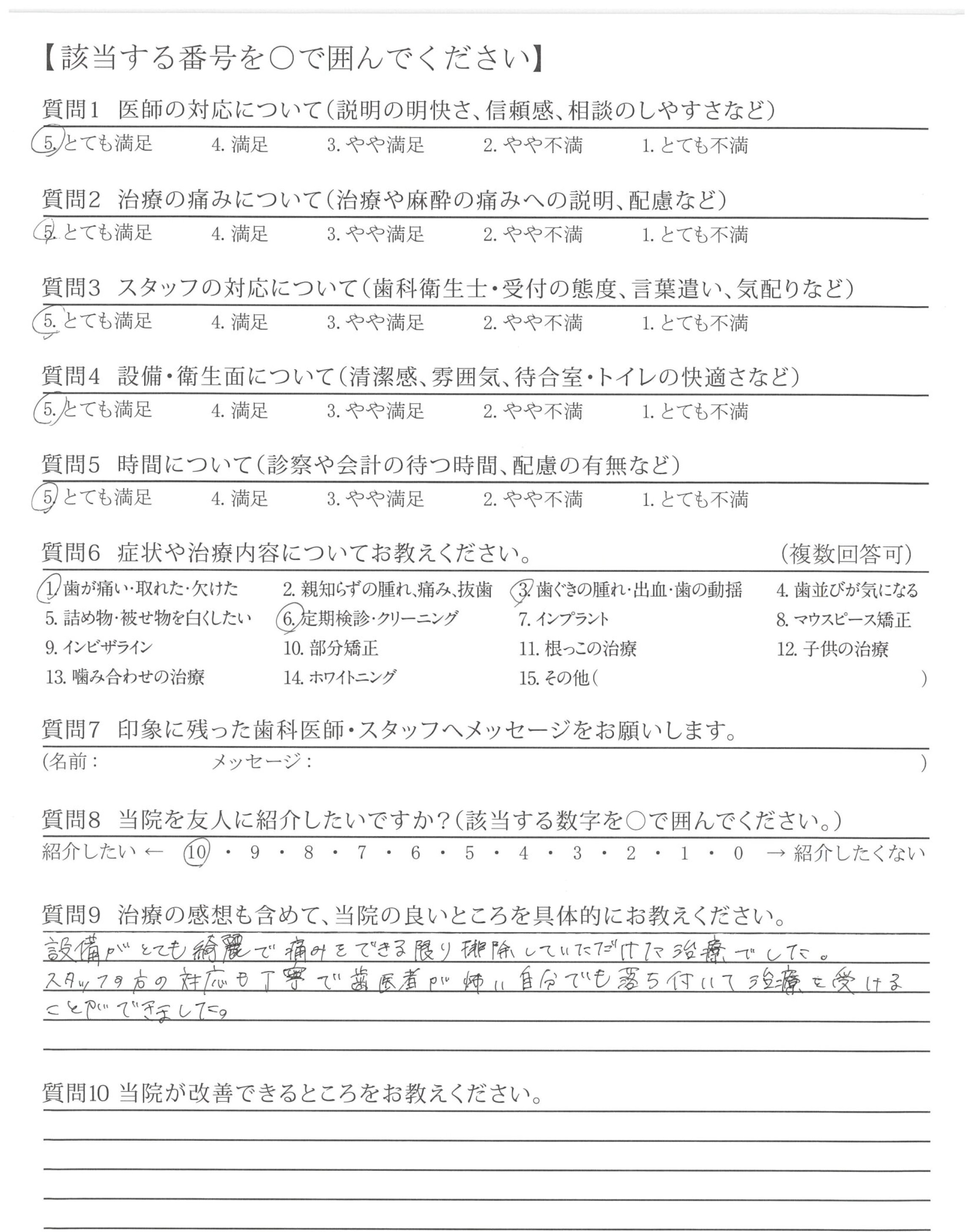 質問「医師の対応」「治療の痛み」「スタッフの対応」「設備・衛生面」「時間」ついてで「とても満足」と示した通り、悪い所を探す方が難しい程、よい医院です。