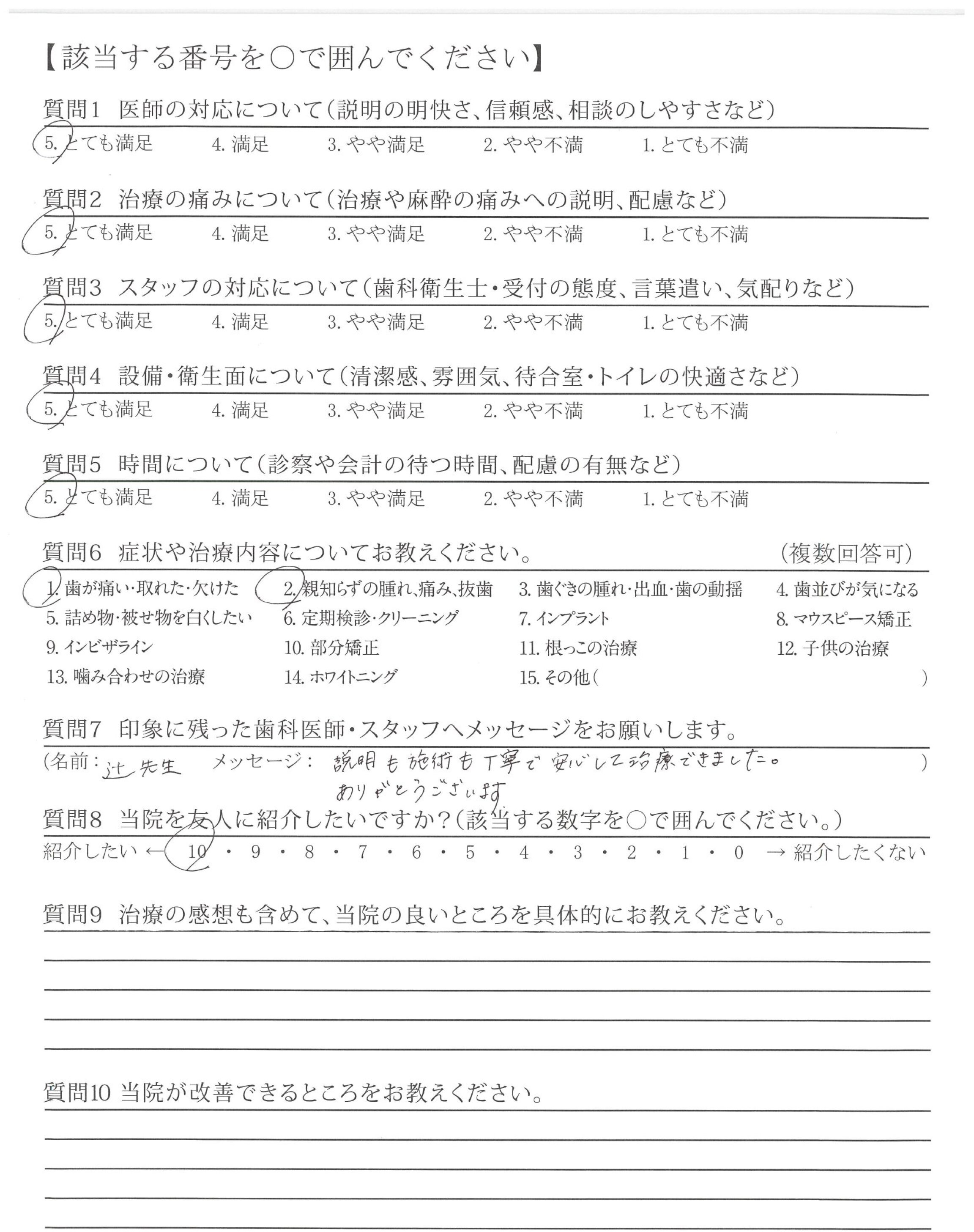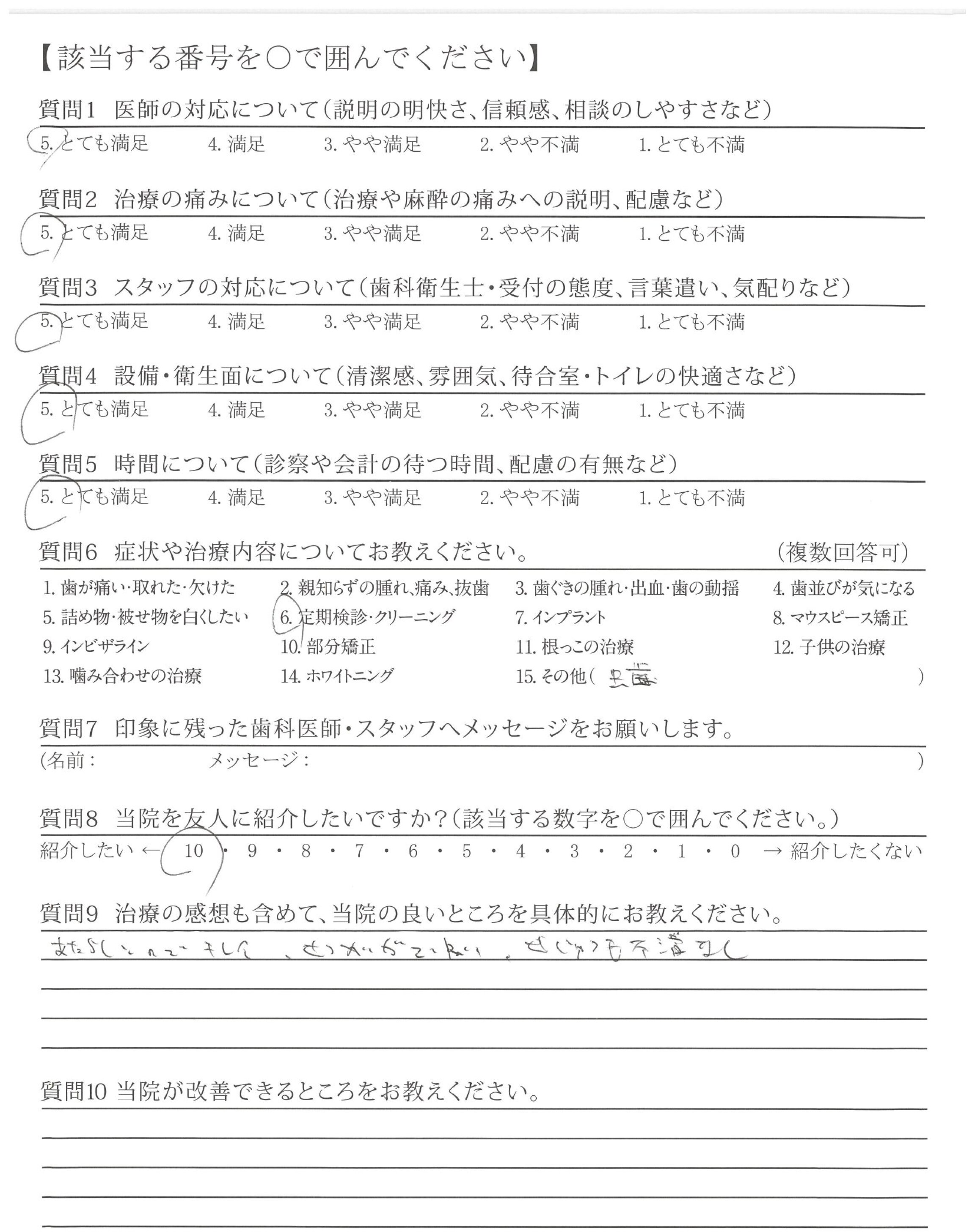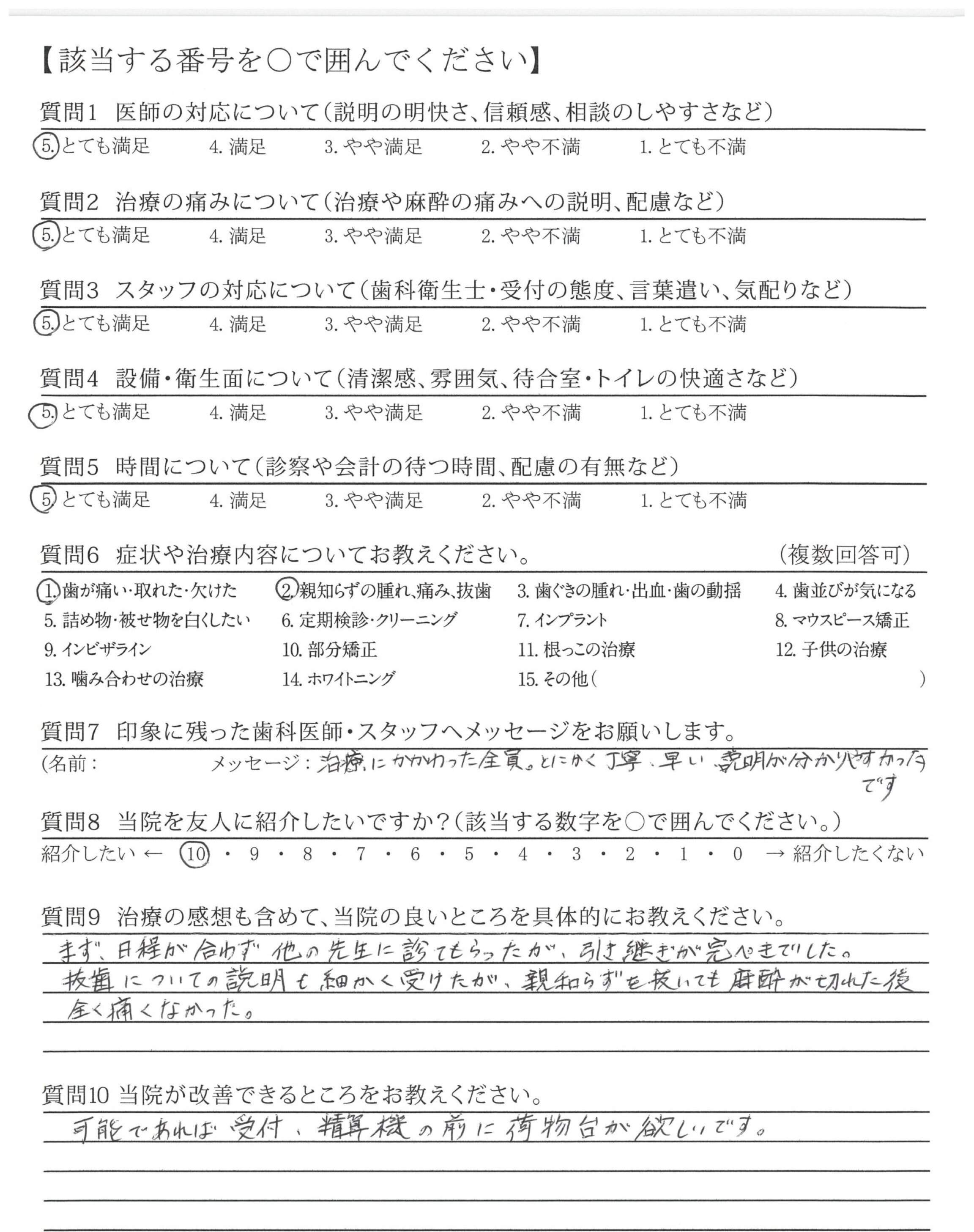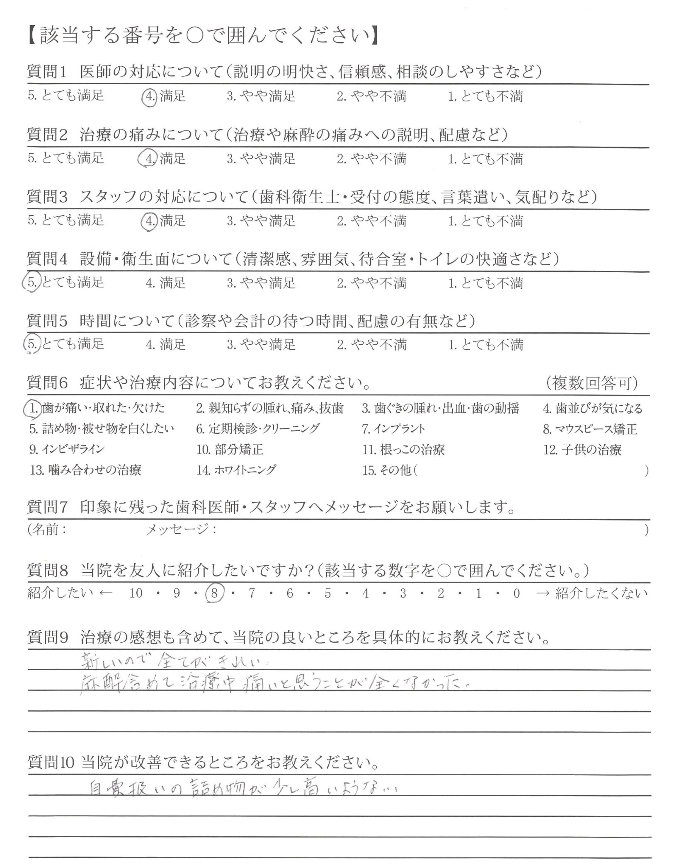 質問「医師の対応」「治療の痛み」「スタッフの対応」「設備・衛生面」「時間」ついてで「とても満足」と示した通り、悪い所を探す方が難しい程、よい医院です。