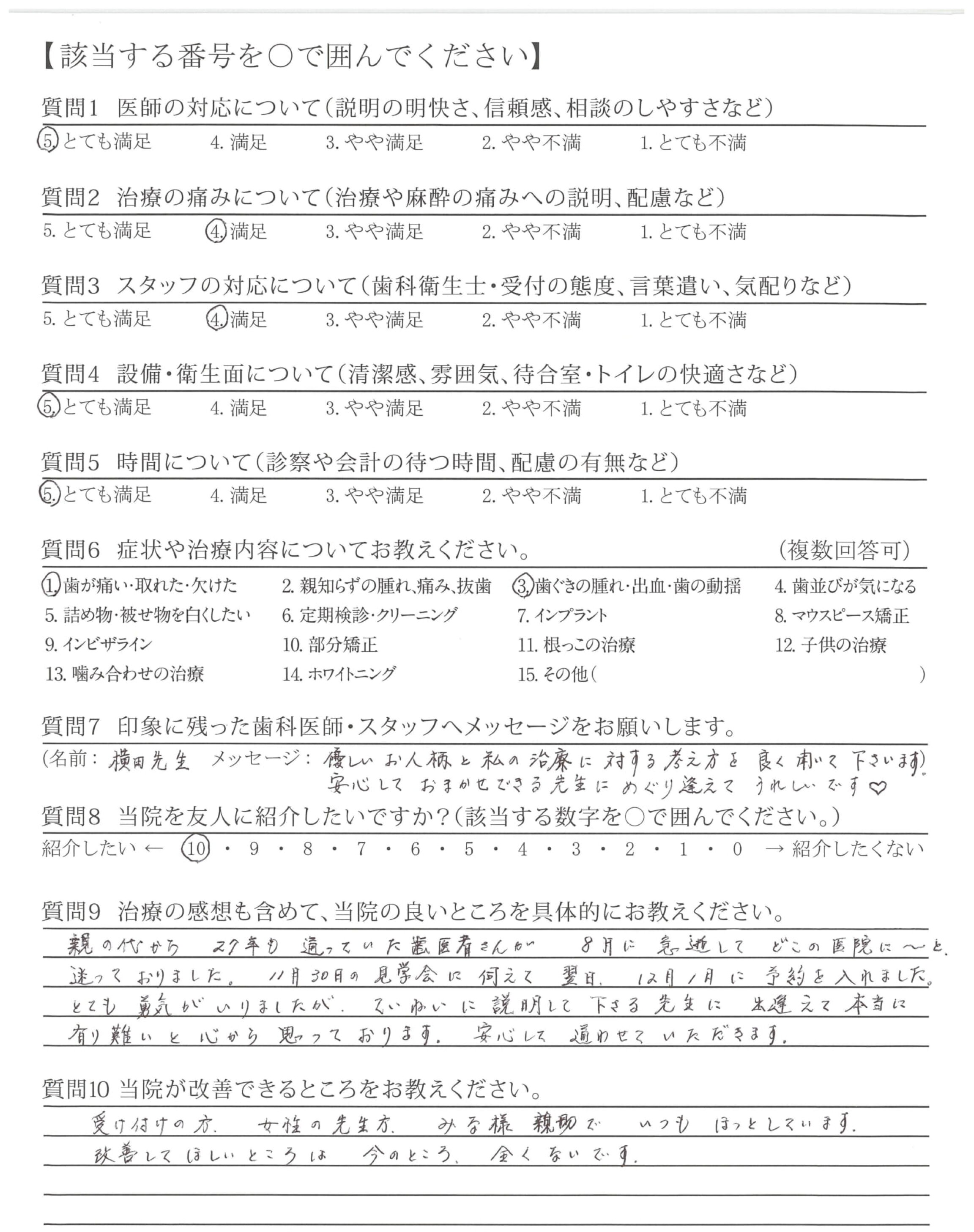 親の代から27年も通っていた歯医者さんが8月に急逝してどこの医院に~と、迷っておりました。11月30日の見学会に伺えて翌日、12月1日に予約を入れました。とても勇気がいりましたが、ていねいに説明して下さる先生に出逢えて本当に有り難いと心から思っております。