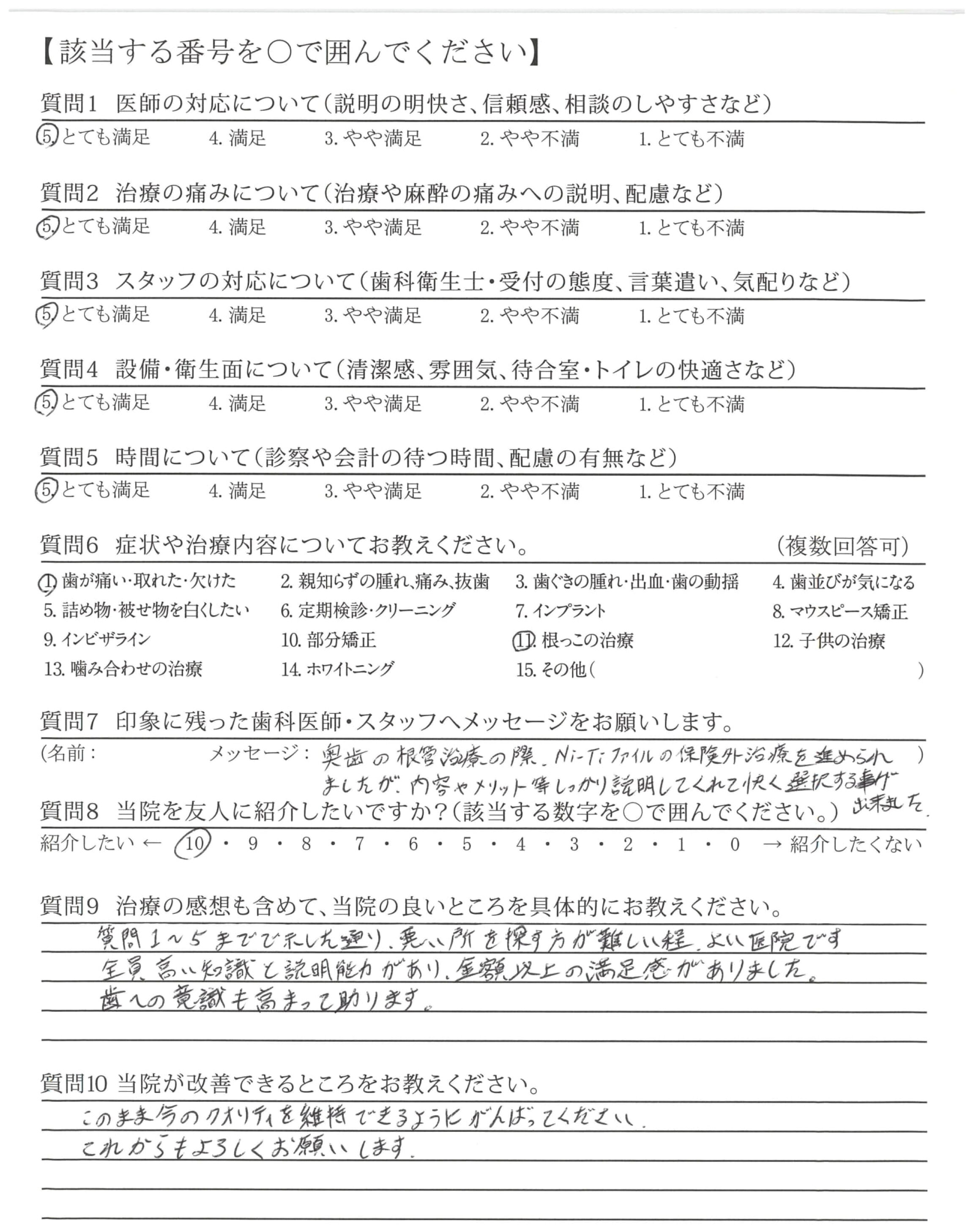 奥歯の根管治療の際、Ni-Tiファイルの保険外治療を勧められましたが、内容やメリット等しっかり説明してくれて快く選択する事が出来ました。