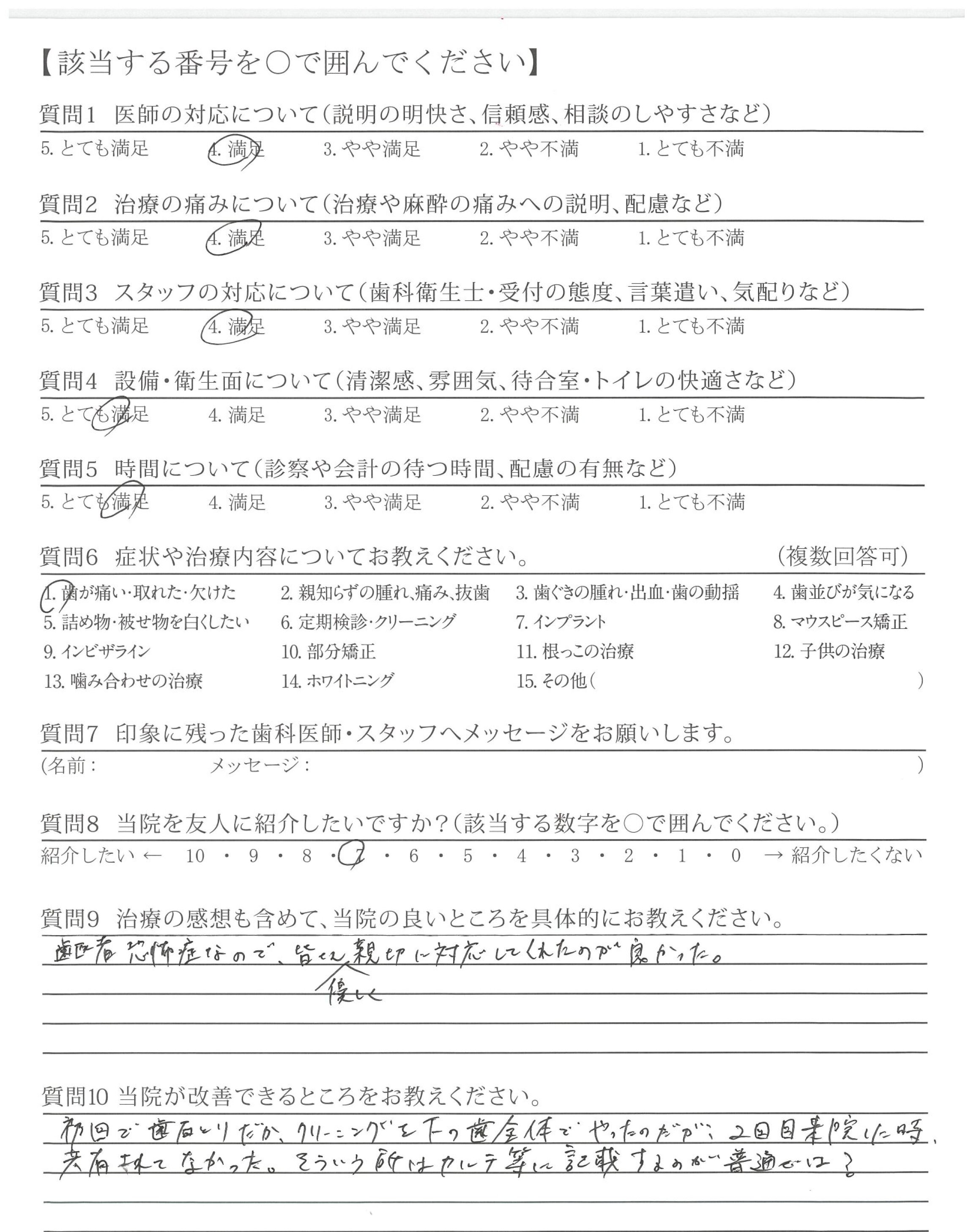 処置毎に声をかけてくださり不安なく治療を受ける事が出来ました。又、1/9スケーリング時に、スタッフさんが私自身気づかなかった鼻づまりである事に気づいて楽に(苦しくなく)治療を受ける事が出来ました。