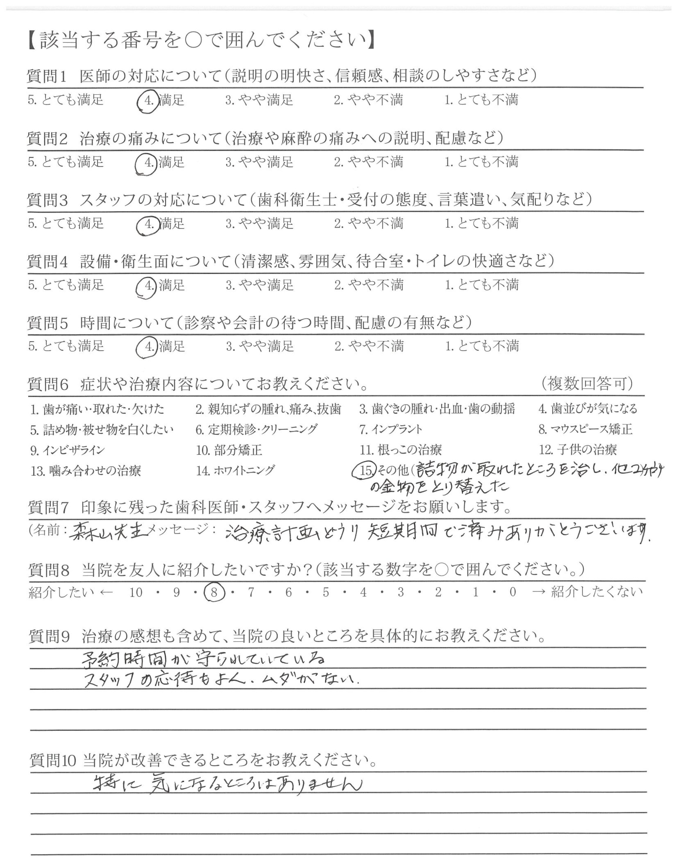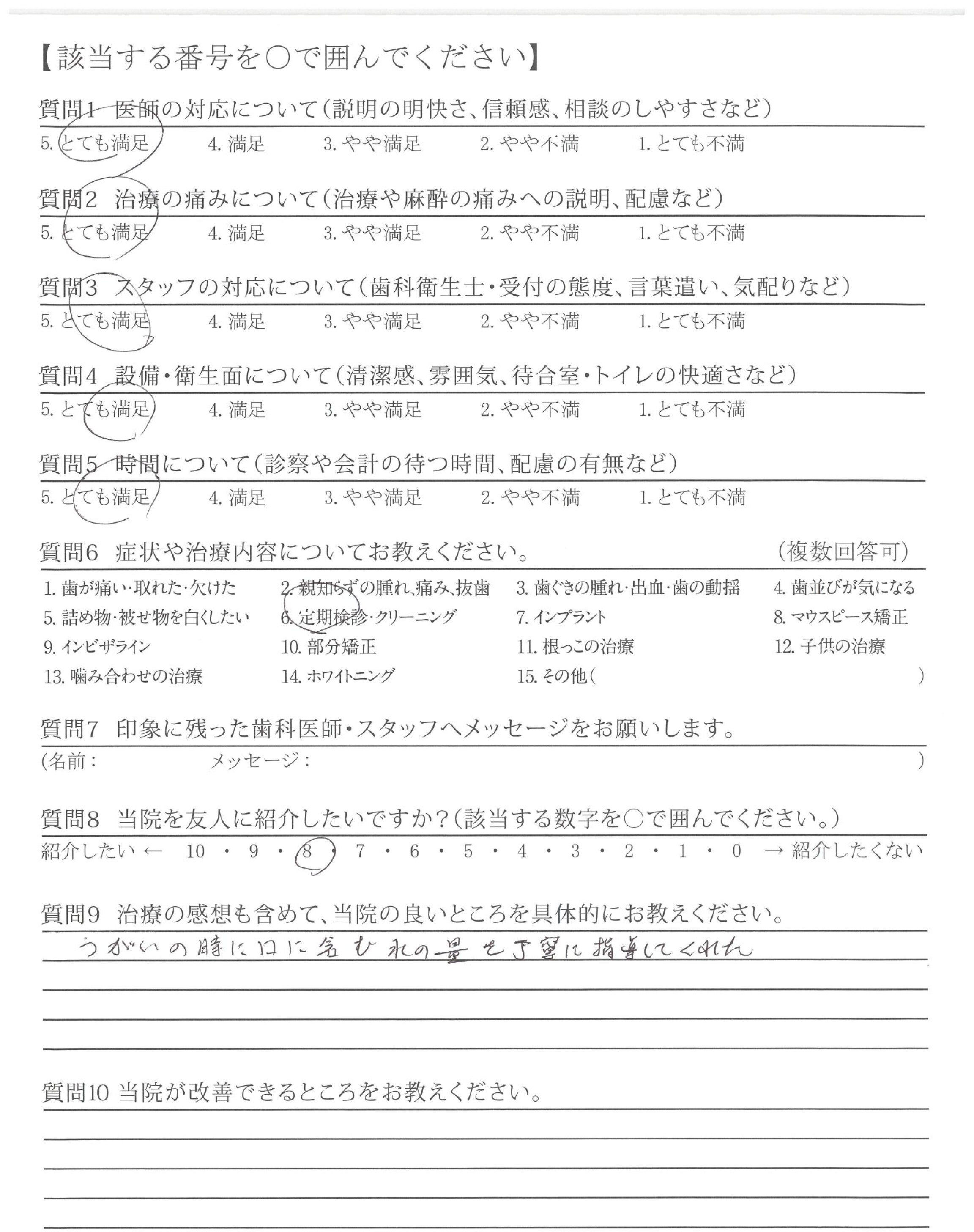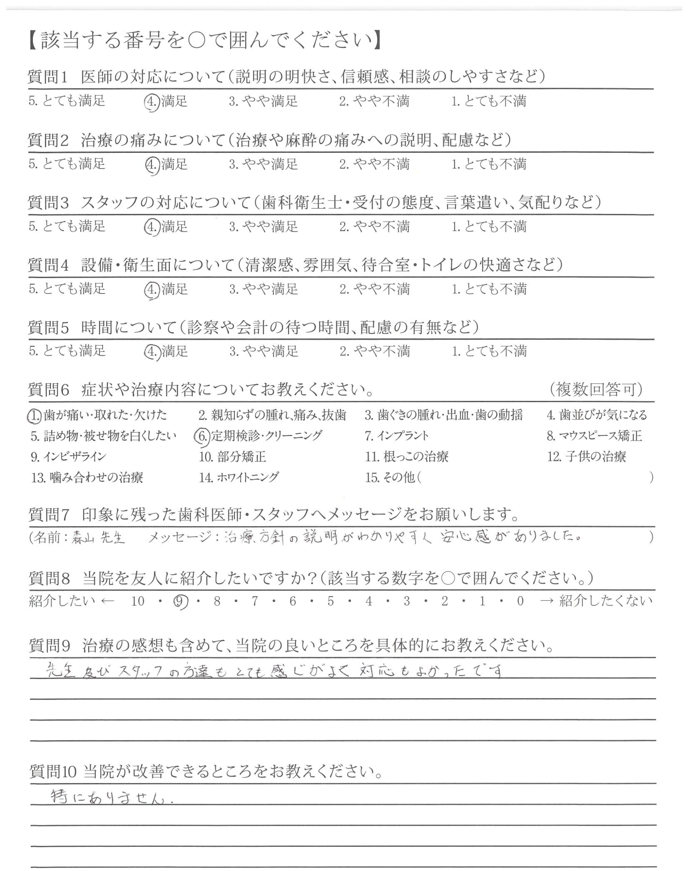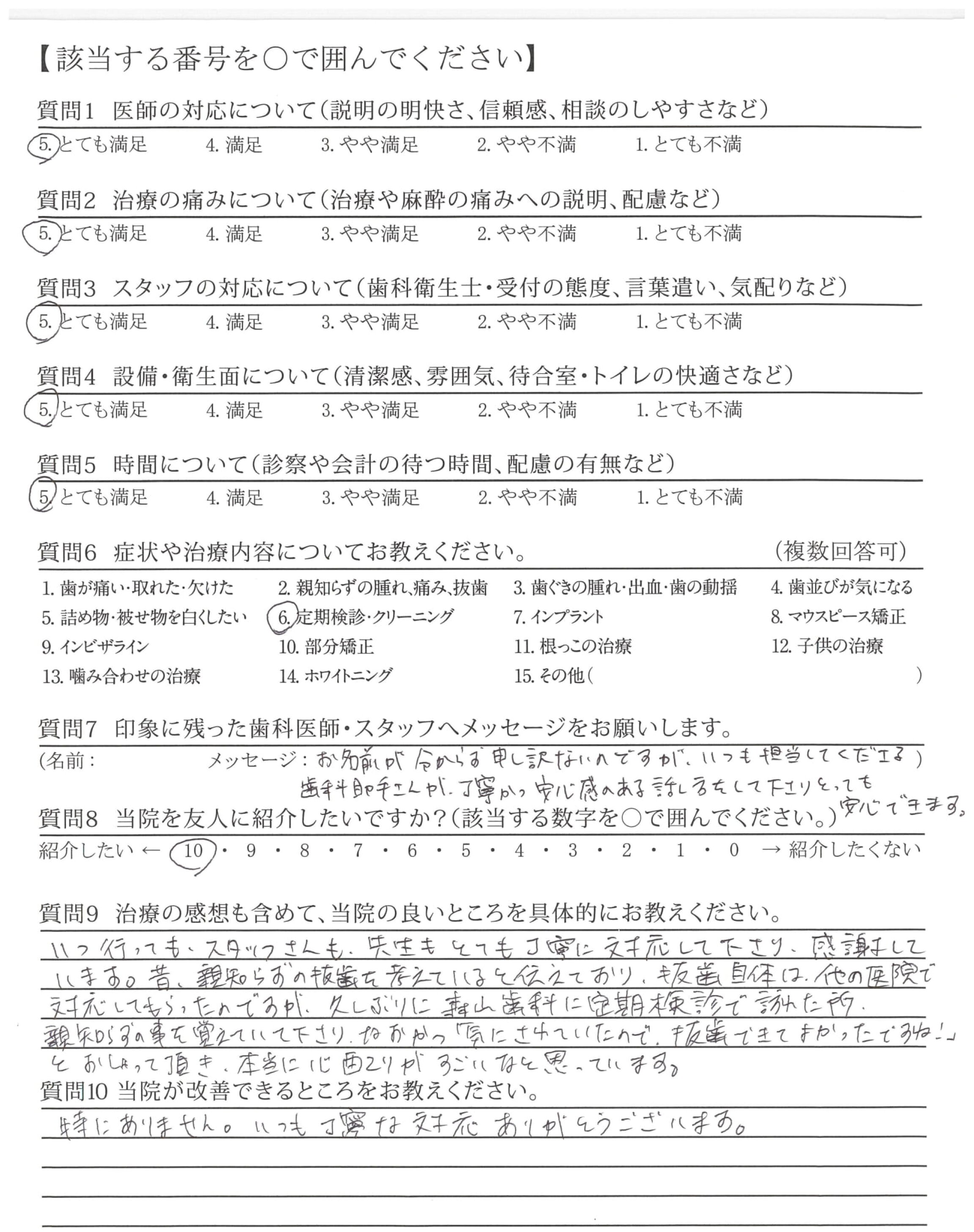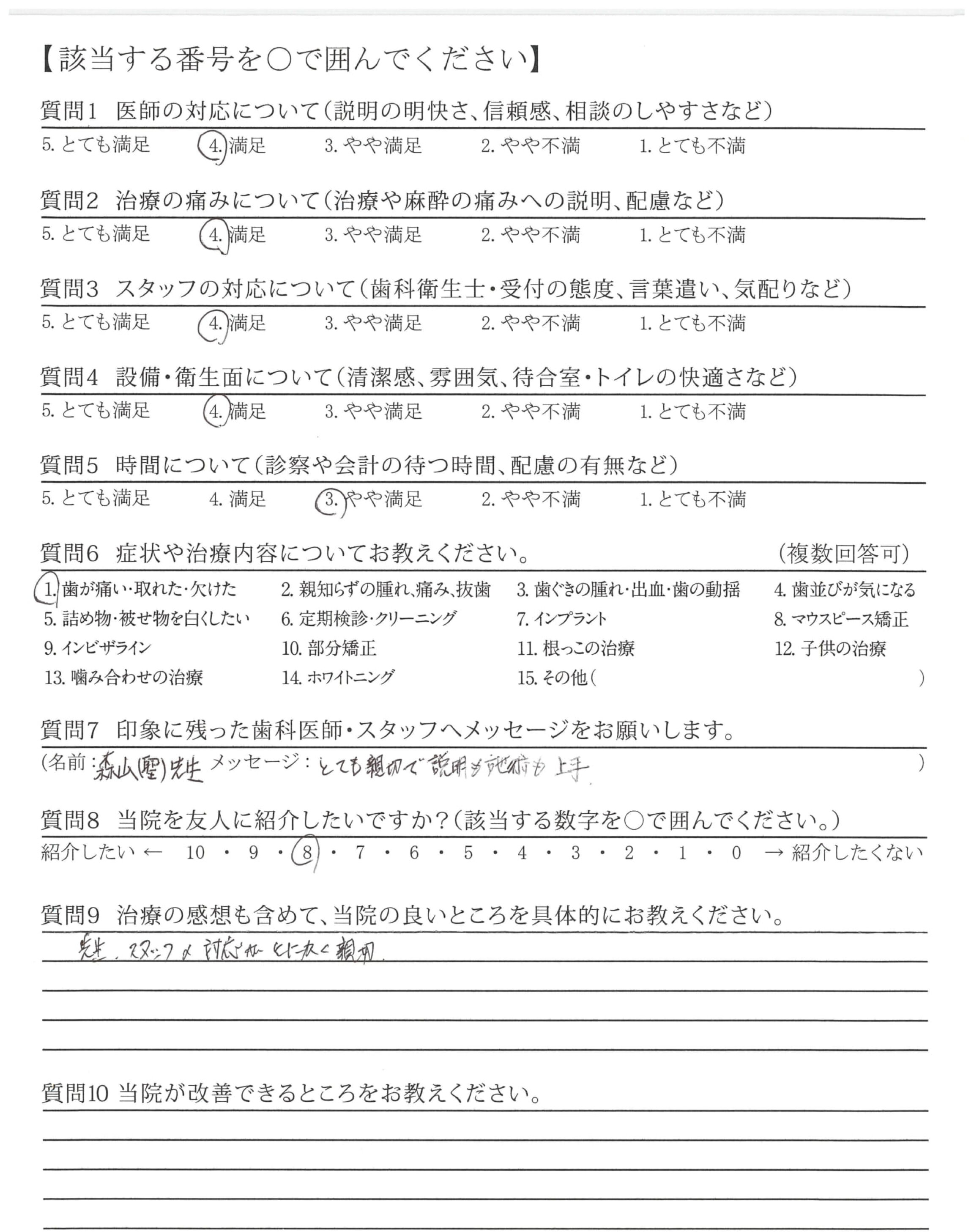 昔、親知らずの抜歯を考えていると伝えており、抜歯自体は、他の病院で対応してもらったのですが、久しぶりに森山歯科に定期検診で訪れた所、親知らずの事を覚えていて下さり、なおかつ「気にされていたので、抜歯できてよかったですね!」とおっしゃって頂き、本当に心配りがすごいなと思っています。