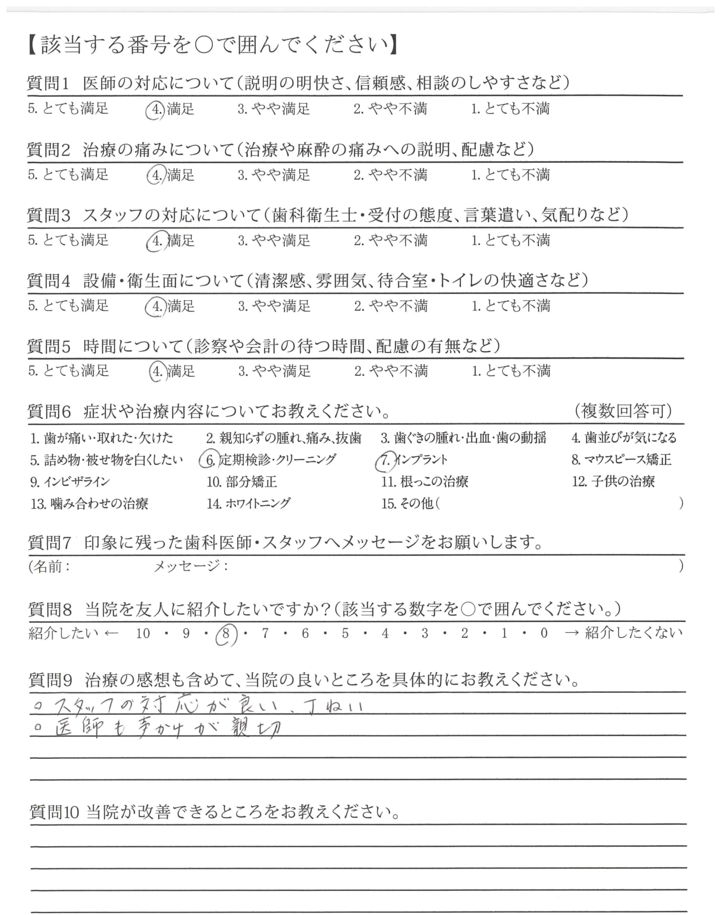 入れていただいたインプラントで何でも食べられてよかったです。又、スタッフの方々も感じが良かったです。