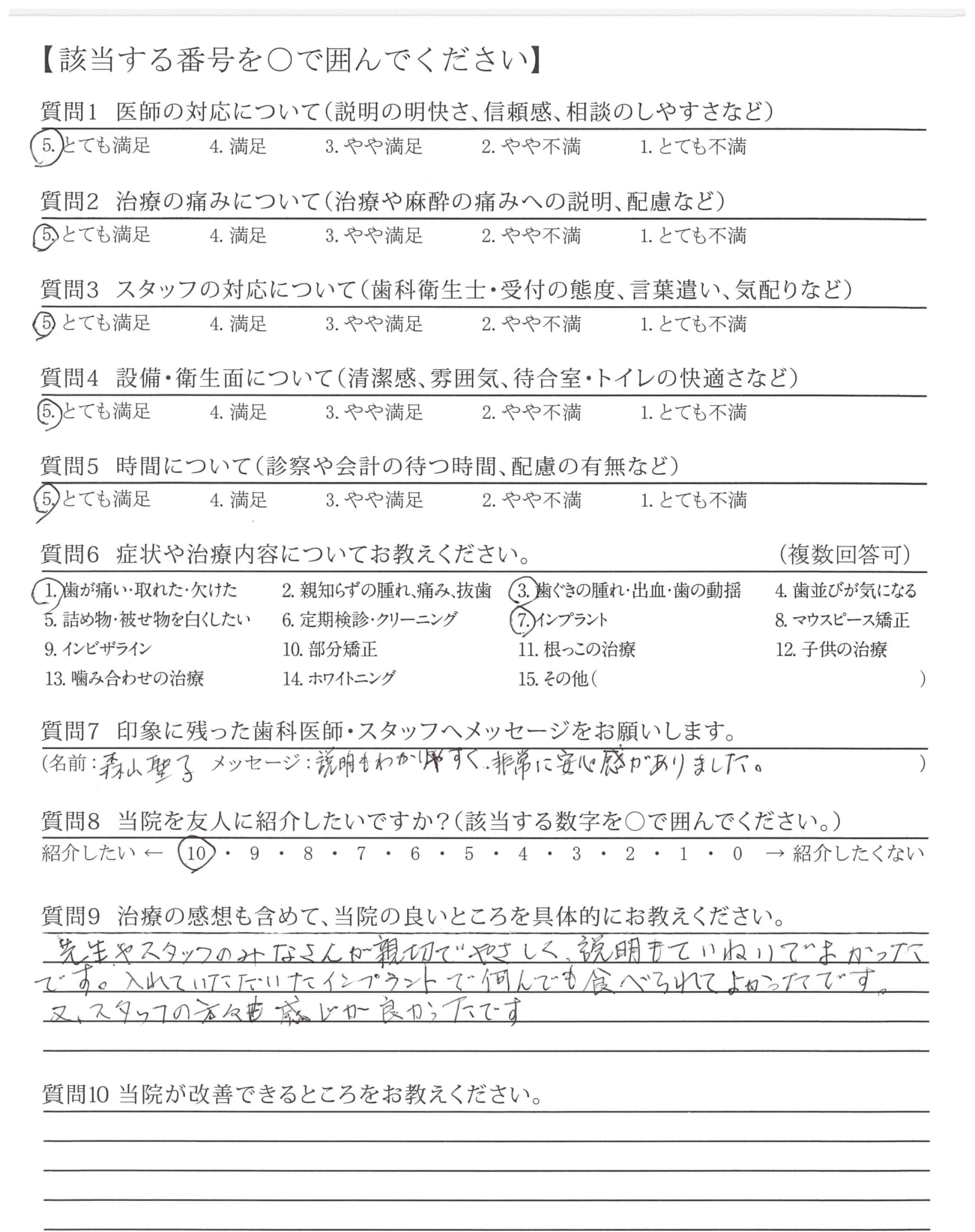 先生の対応に信頼感がありインプラントに進む事が出来ました。満足です