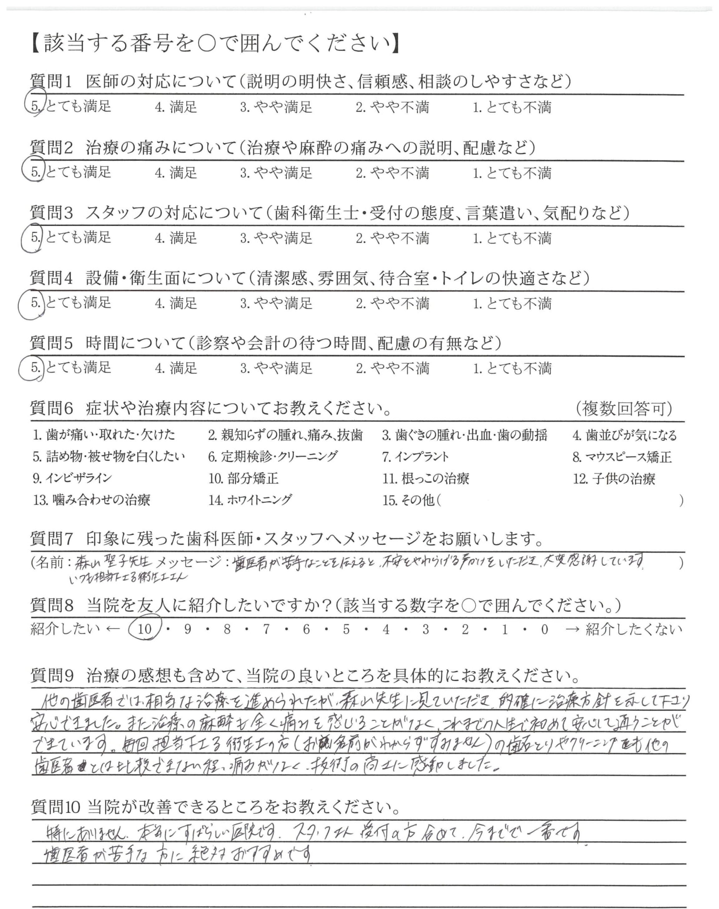 他の歯医者では、相当な治療を進められたが、森山先生に見ていただき、的確に治療方針を示して下さり安心できました。また治療の麻酔も全く痛みを感じることがなく、これまでの人生で初めて安心して通うことができています。