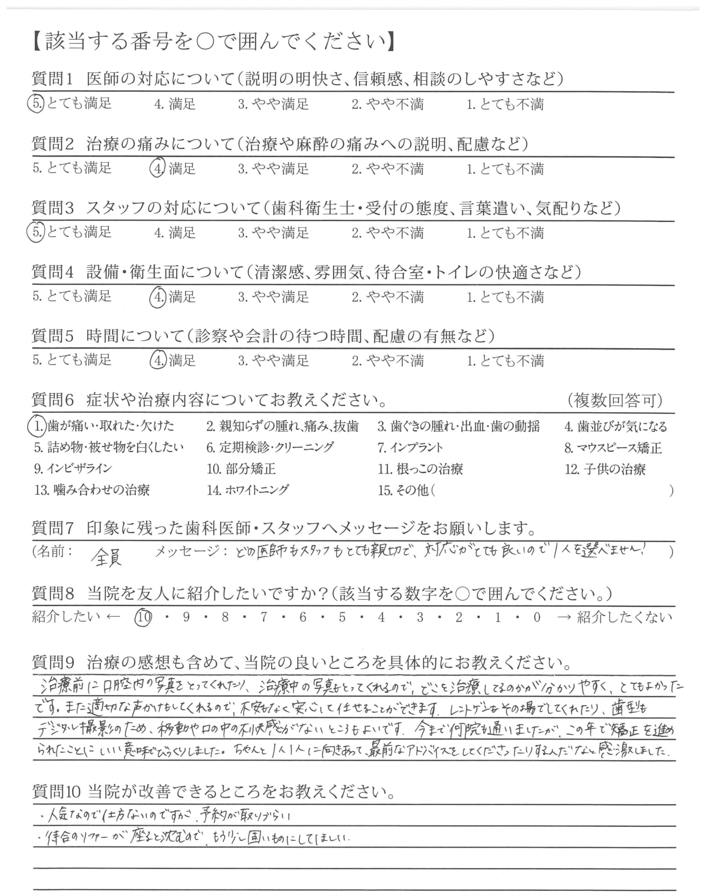 治療のスピード感が非常に気にいっています。患者の立場を考えた治療をしていただいていると本当に思っております。予約もスムーズに対応していただきストレスもないです。(他の歯科は月1回しか出来ない)