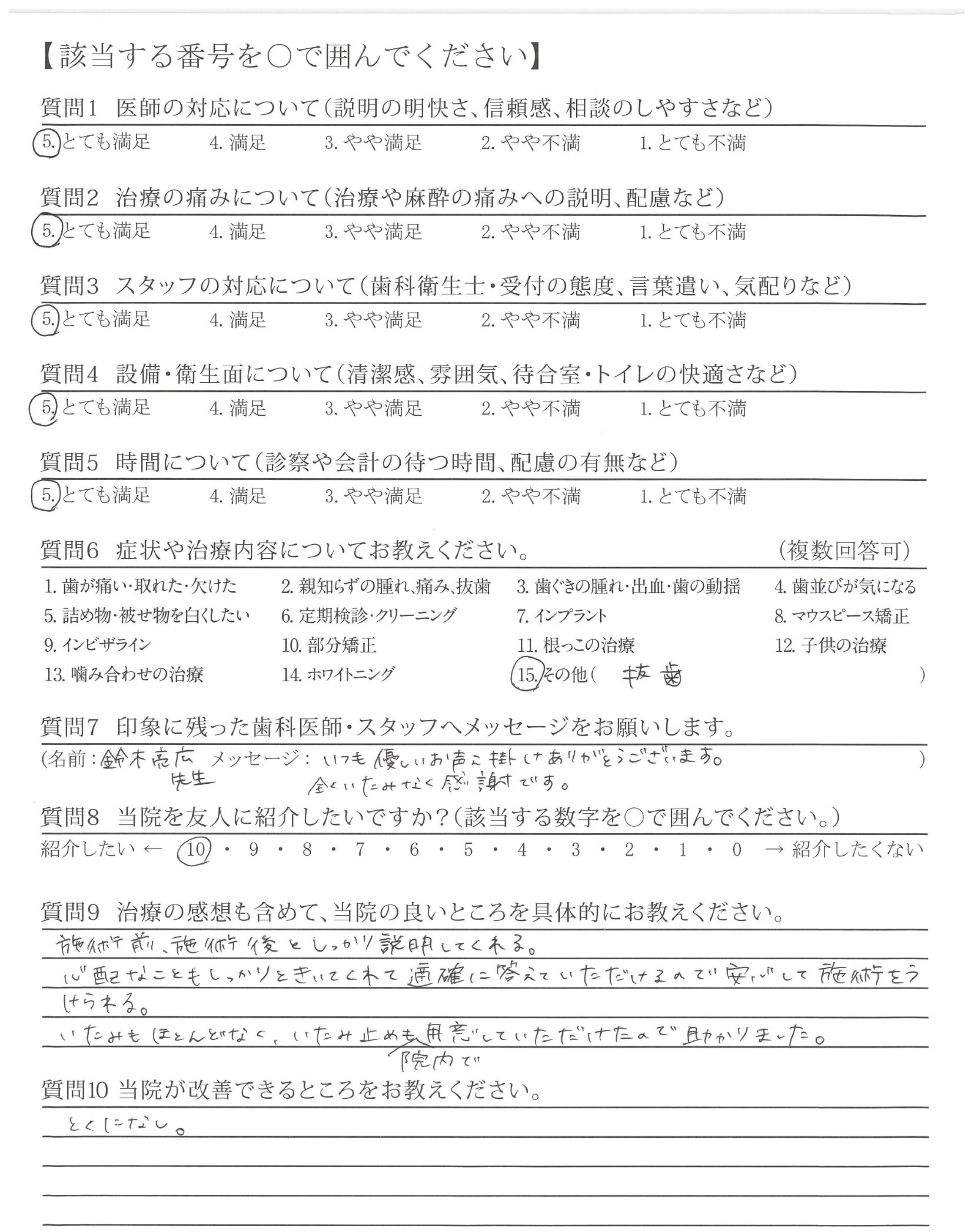 とても驚いたことは治療中や治療後も全然痛みがなかったことです。私がかなり安静にしていたこともありますが、鈴木院長の腕が非常に優れているからこそ、今も安心して、日々の生活に支障なく暮らせているのだと思います。