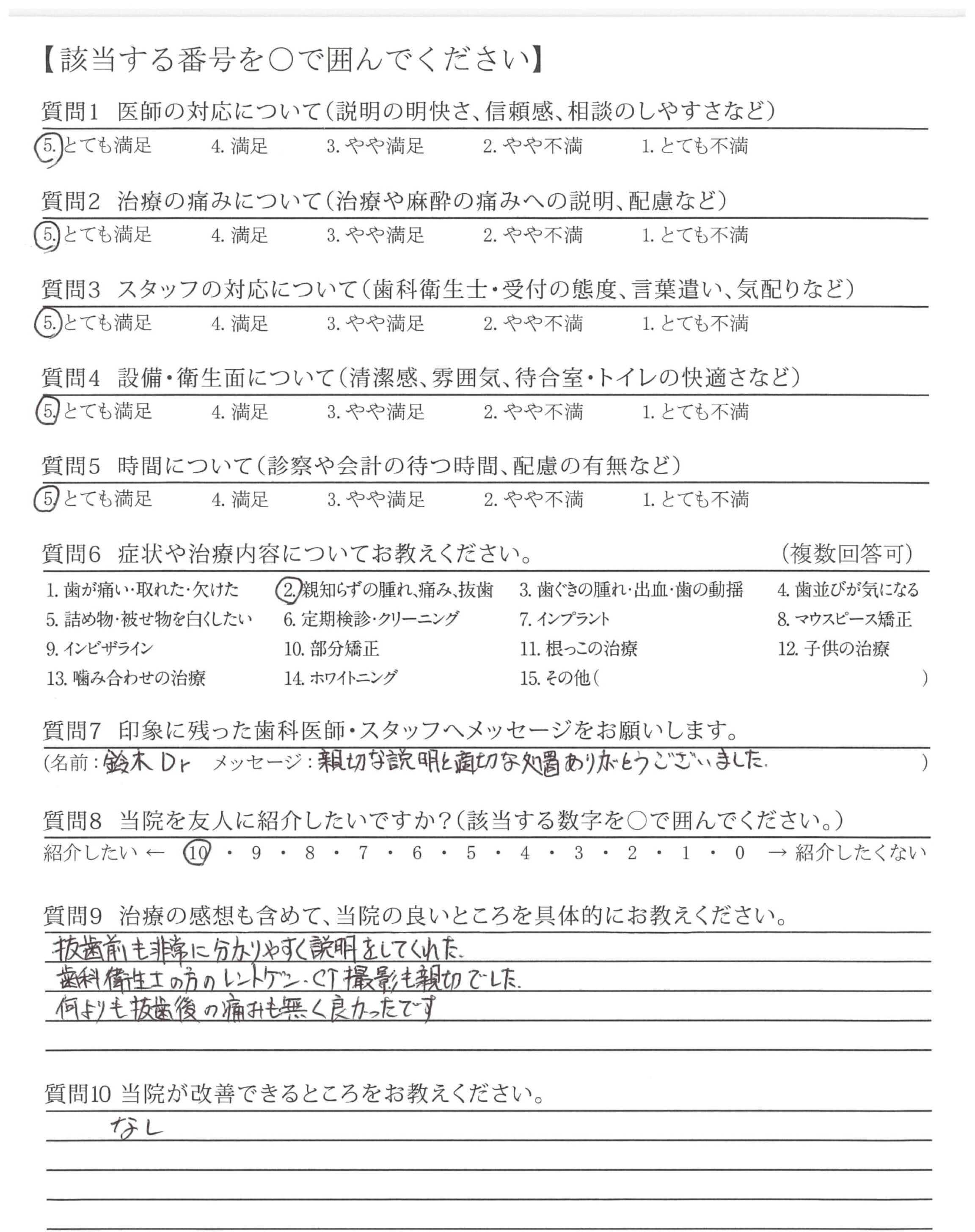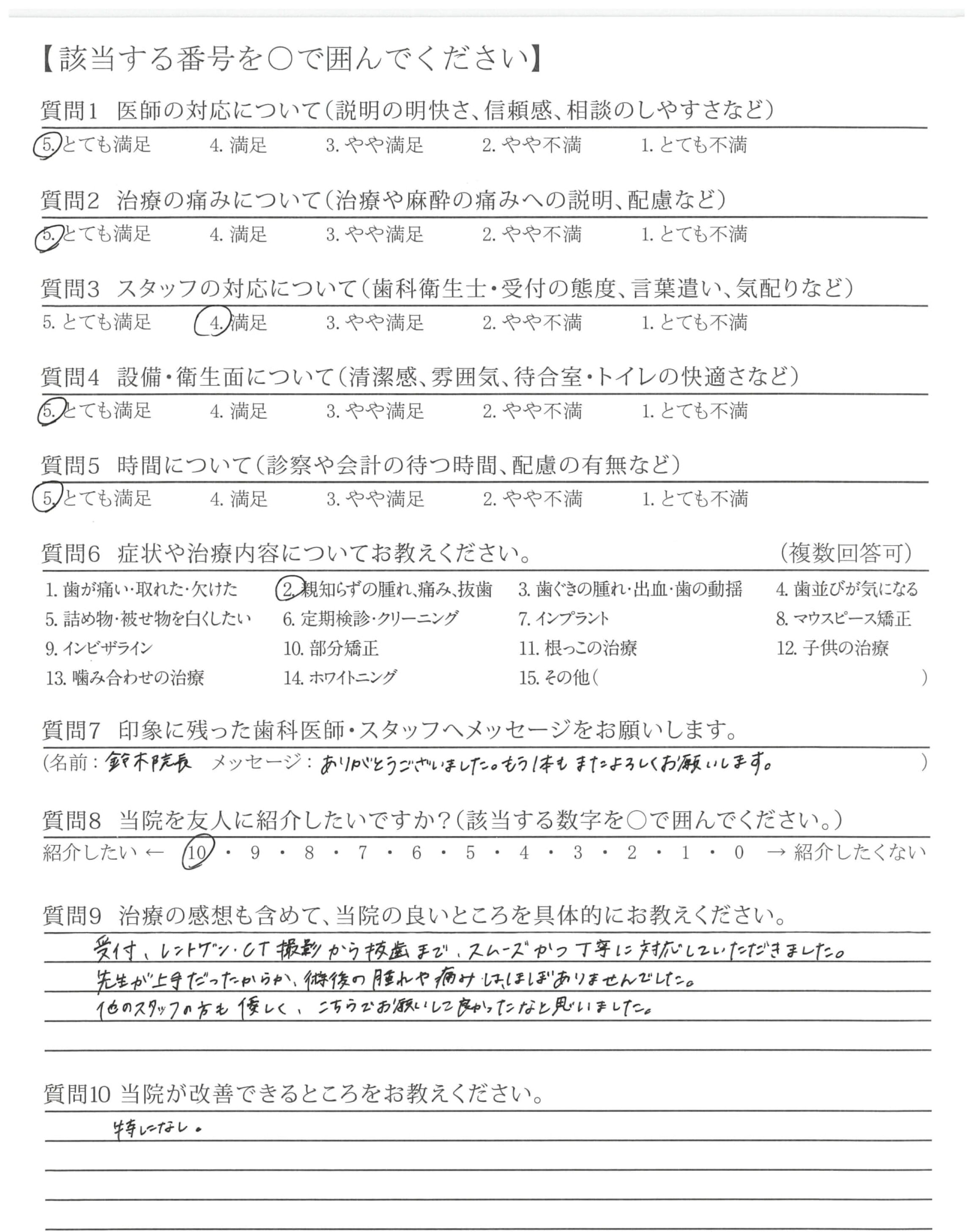 抜歯はこわかったが、鈴木先生の声かけで安心しました。ありがとうございます。