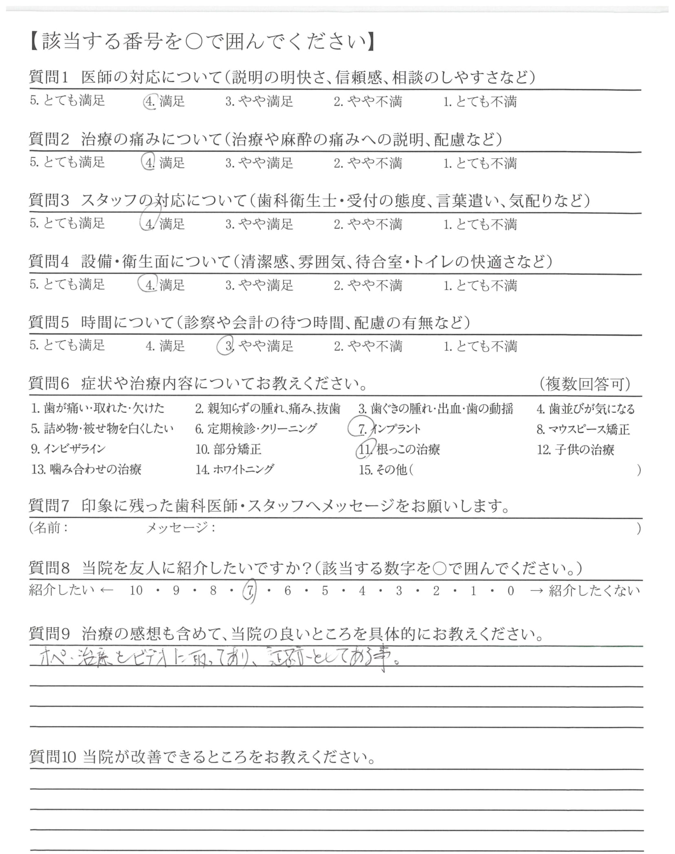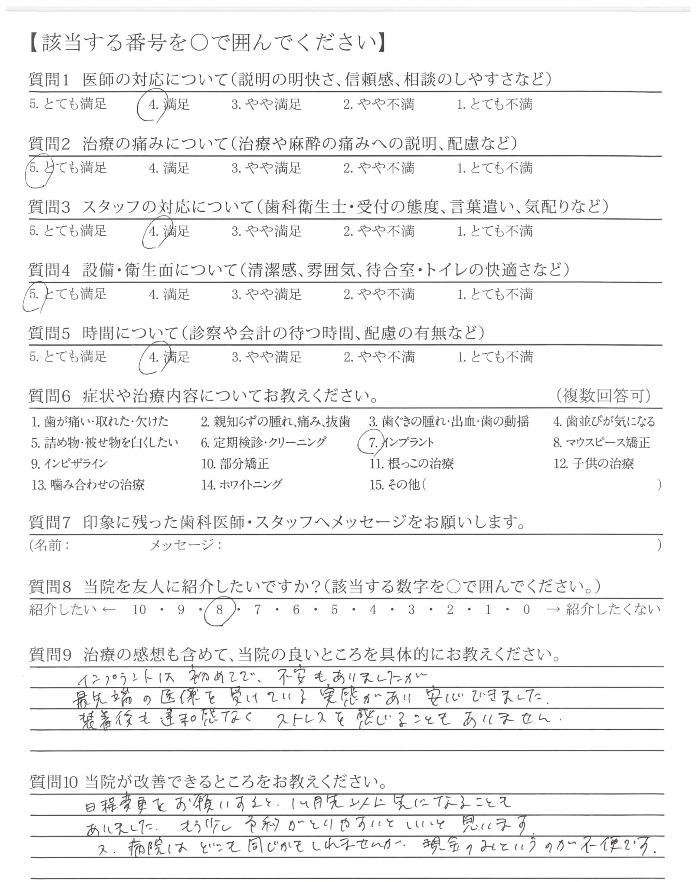 初めてのインプラントで不安でしたが、安心しておまかせできました。ありがとうございます。