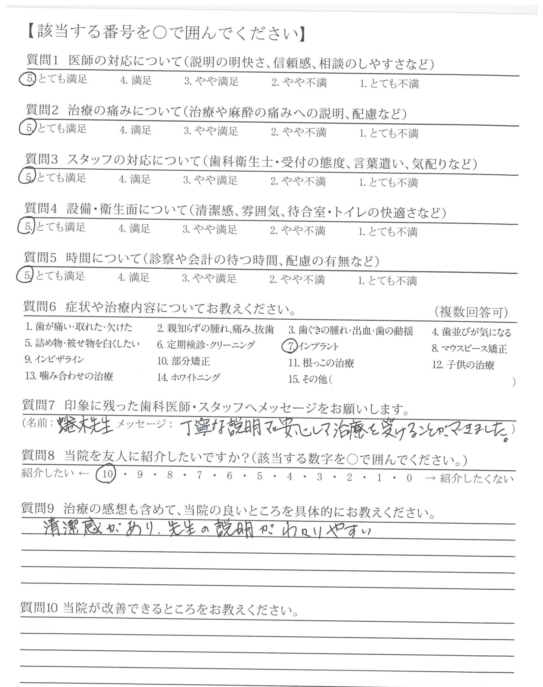初めてインプラント治療で恐かったですが、先生の的確な治療説明で安心して治療を受けることができました。
