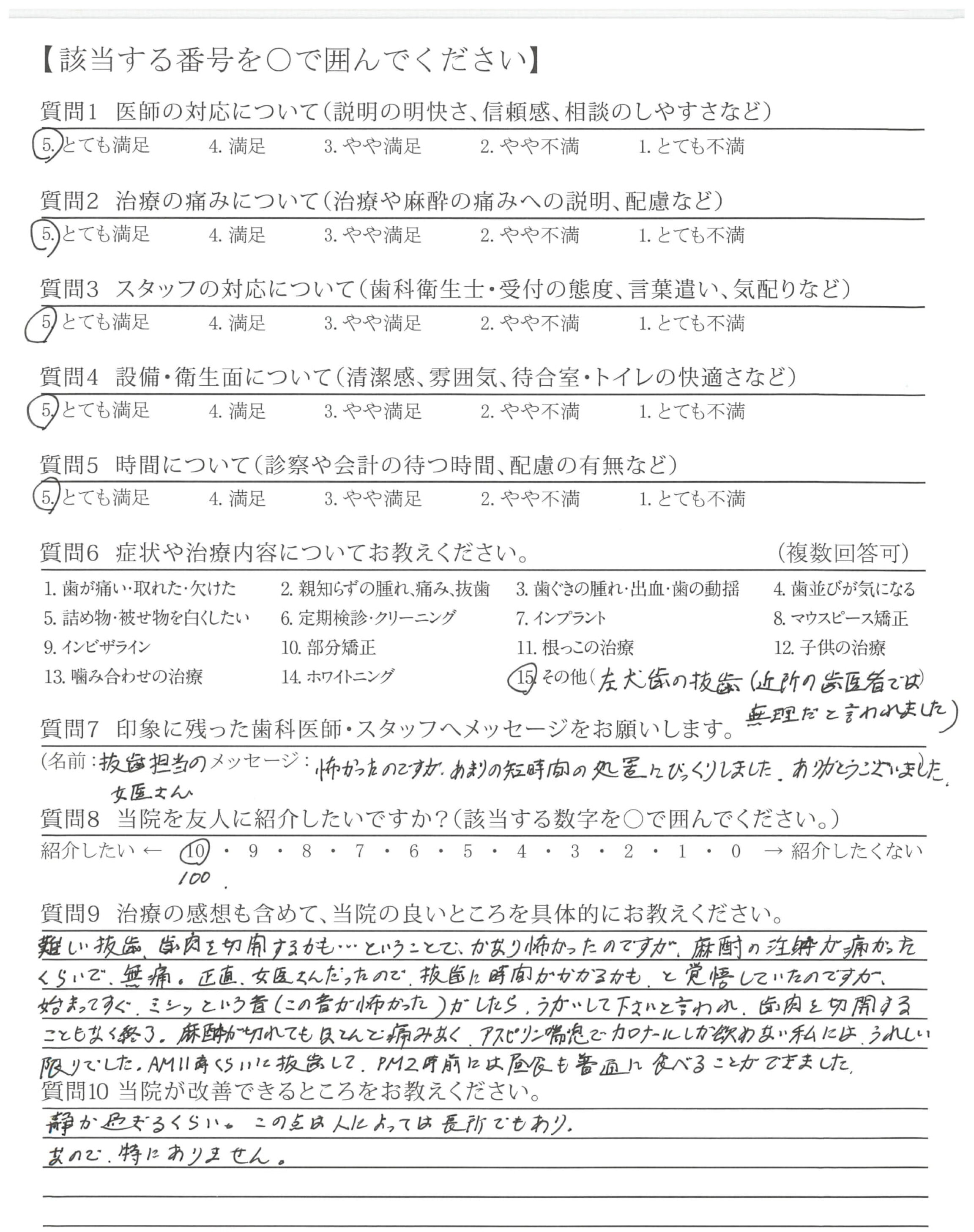恐かったのですが、あまりの短時間の処置にびっくりしました。ありがとうございました。