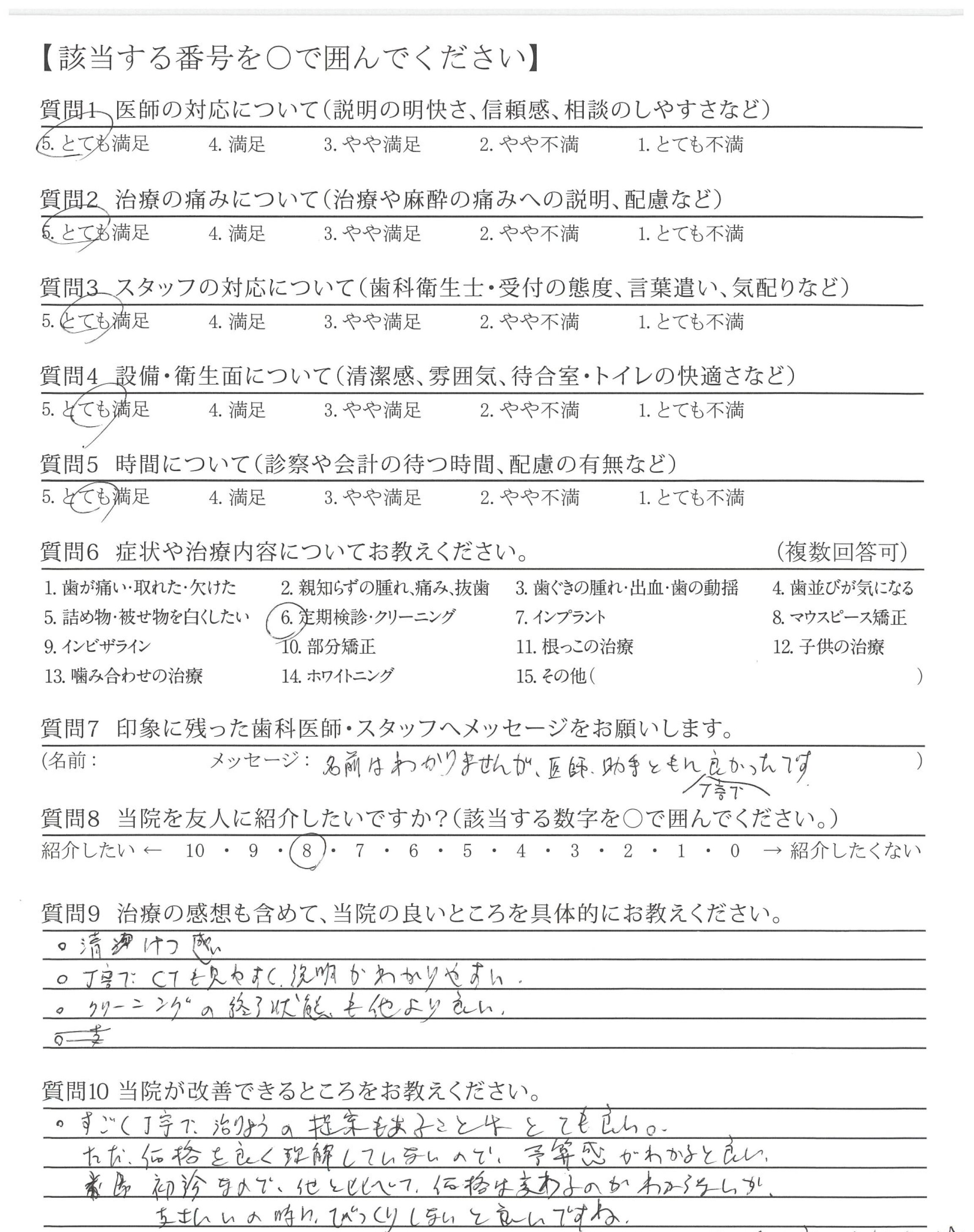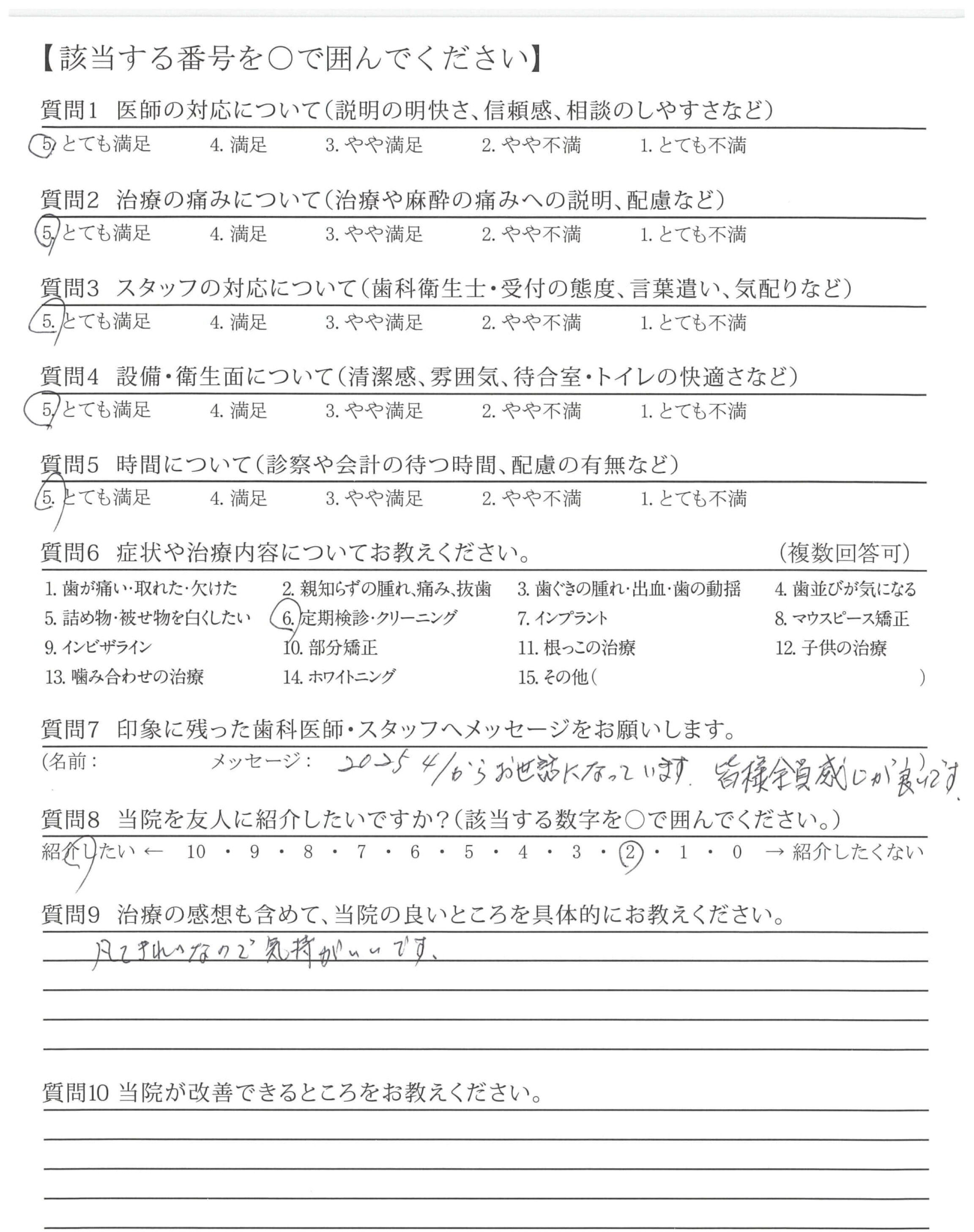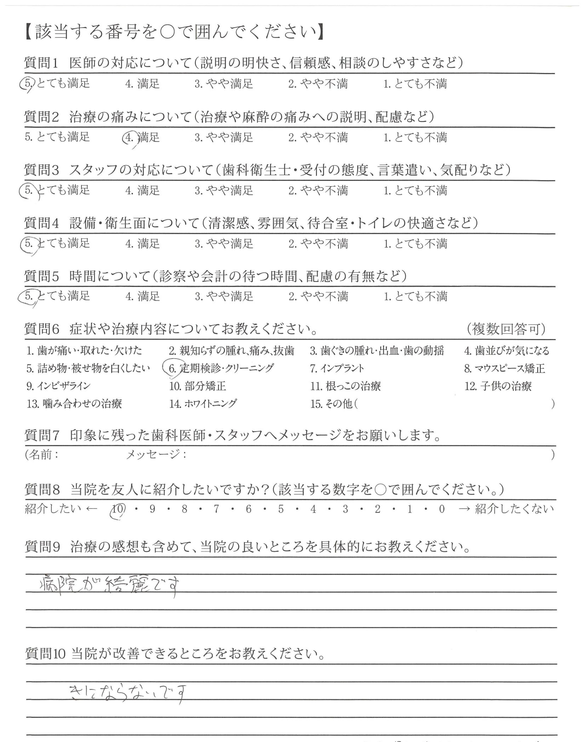 1回目の欠けた歯の治療も痛みを感じずできましたし、2回目のクリーニングも歯科衛生士さんがとてもご丁寧に説明してくださり、分かりやすかったです。また、定期検診でお世話になりたいです。
