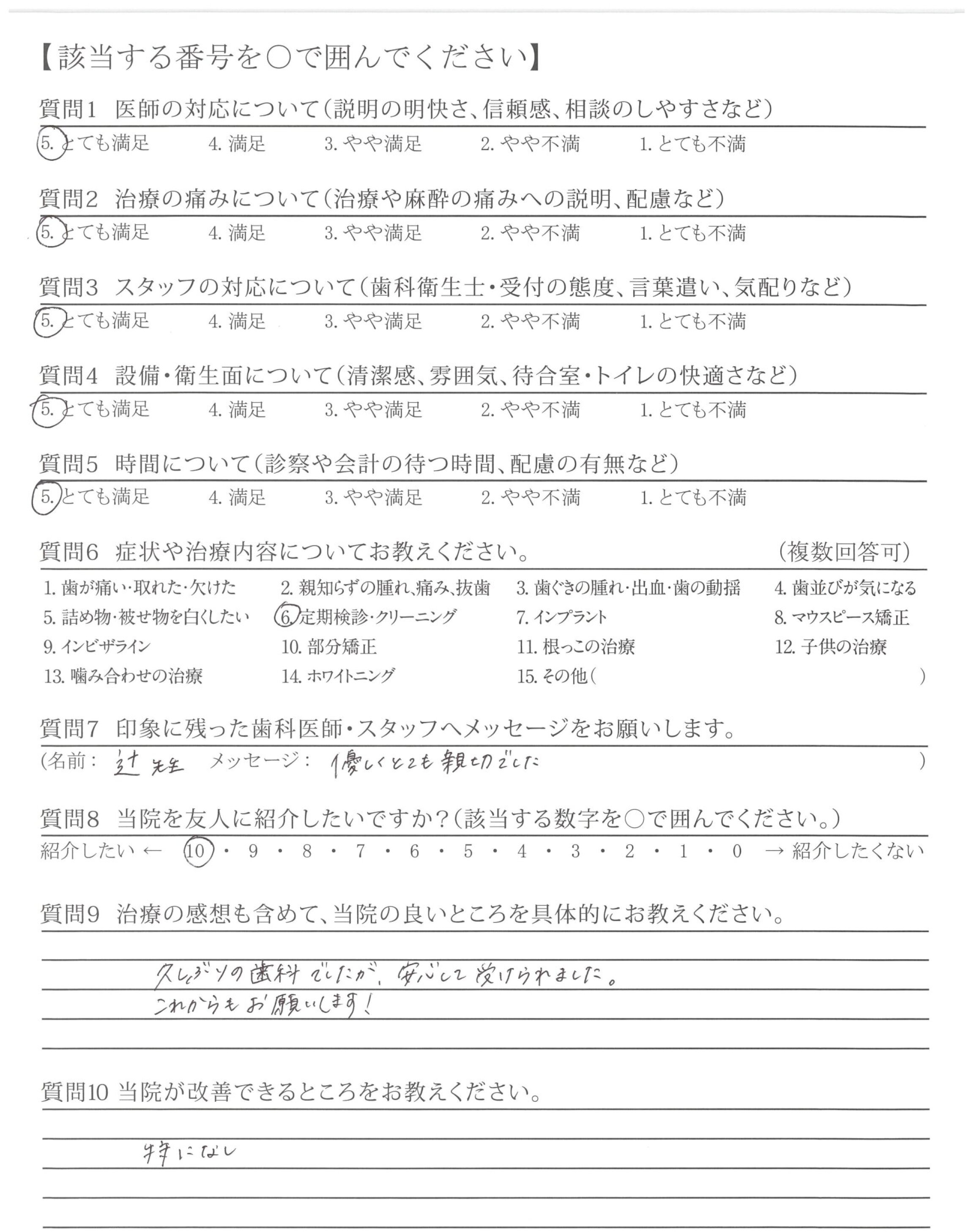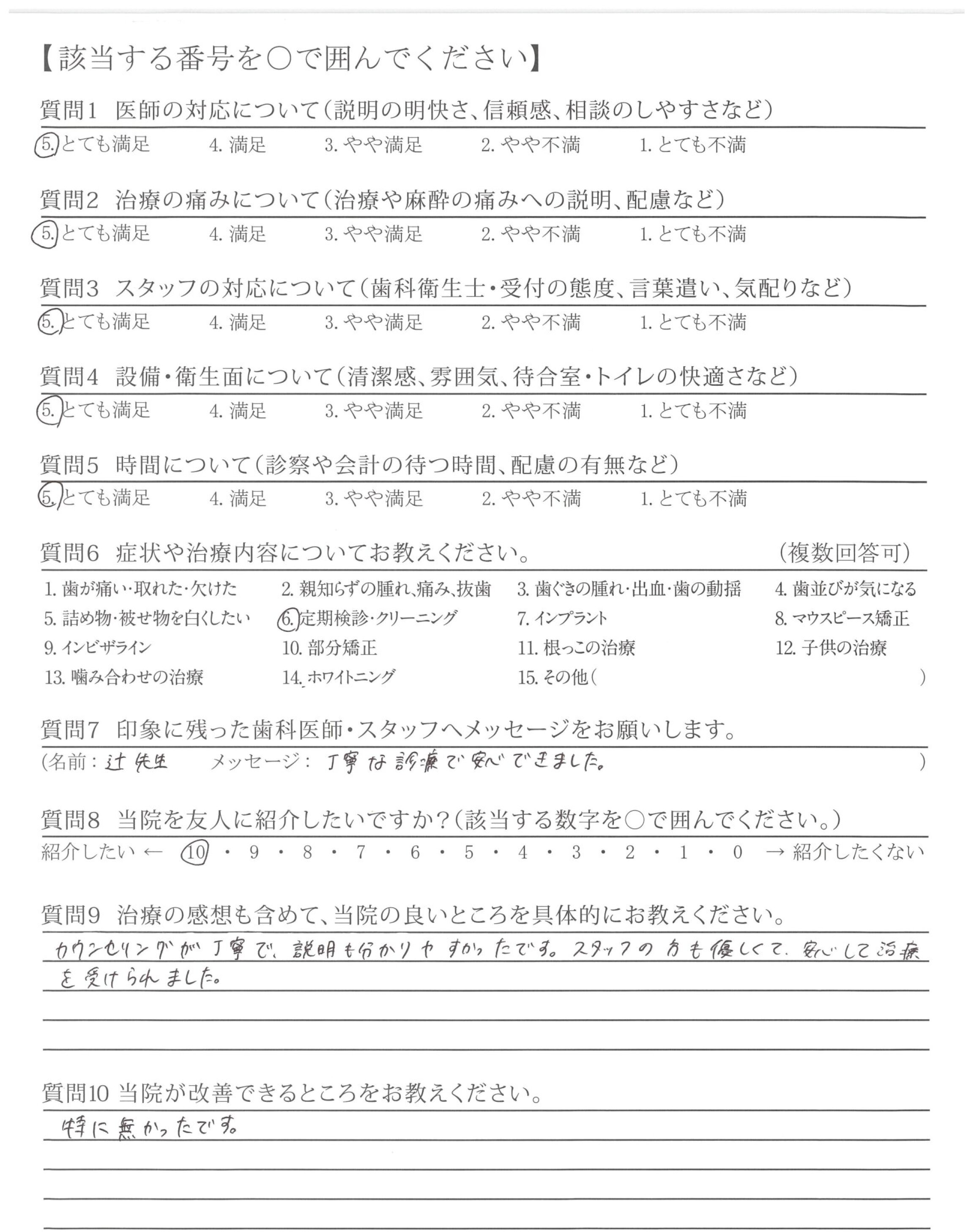 治療後もアフターケアしっかりして下さり、今ではおいしく食事できており、辻先生にお願いして本当によかったです。