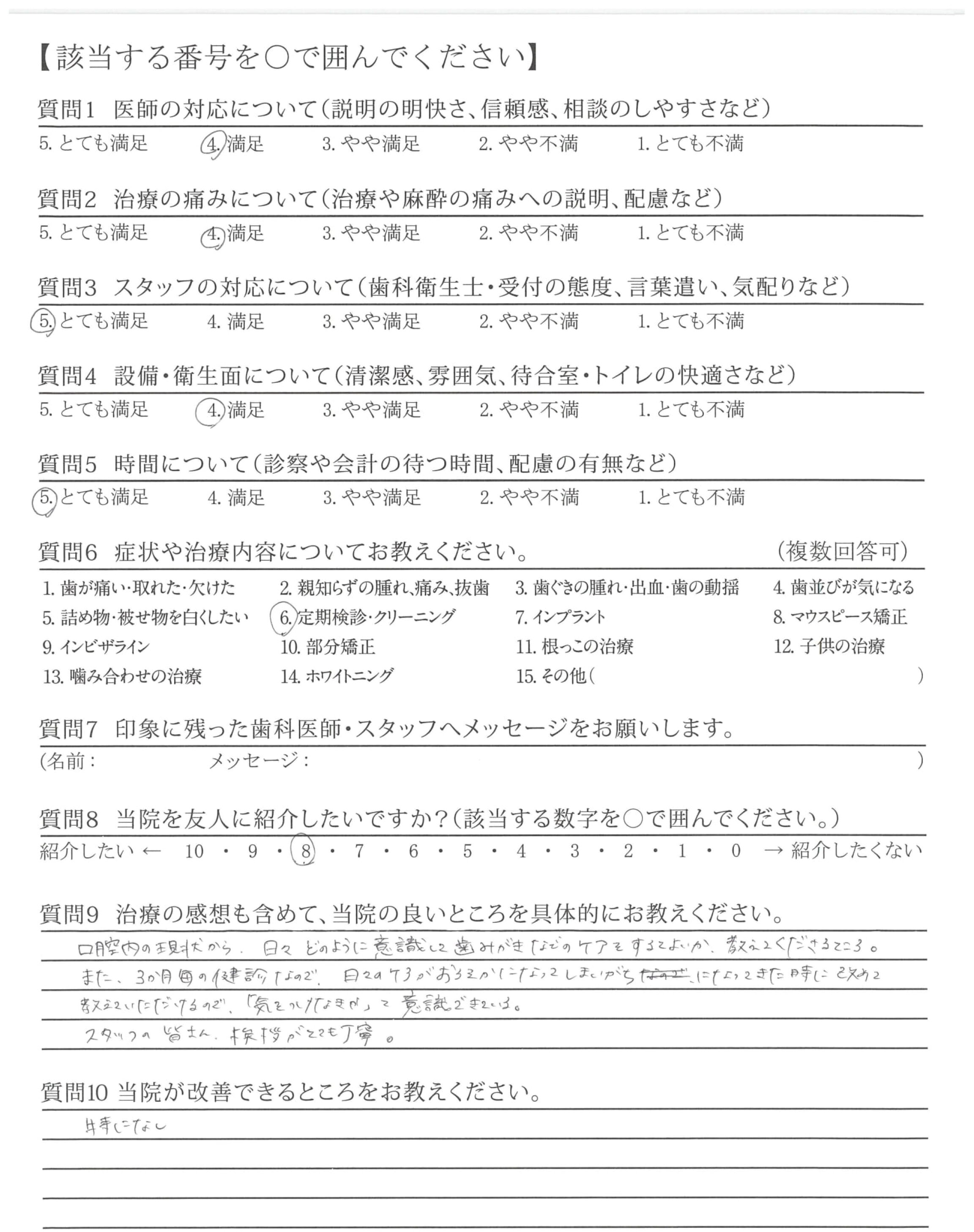 定期検診の流れがスムーズで改善点などをしっかりおしえてくれるのでとてもたすかっている。